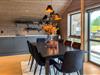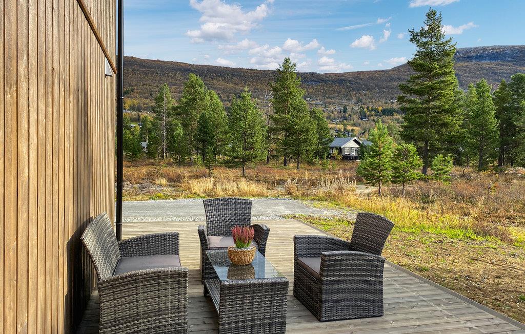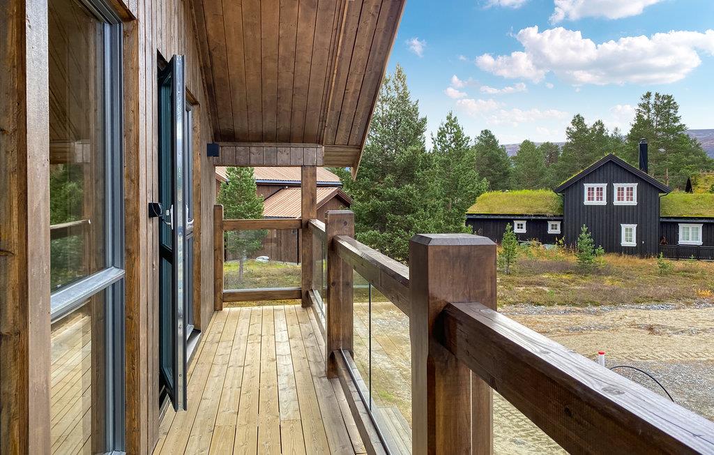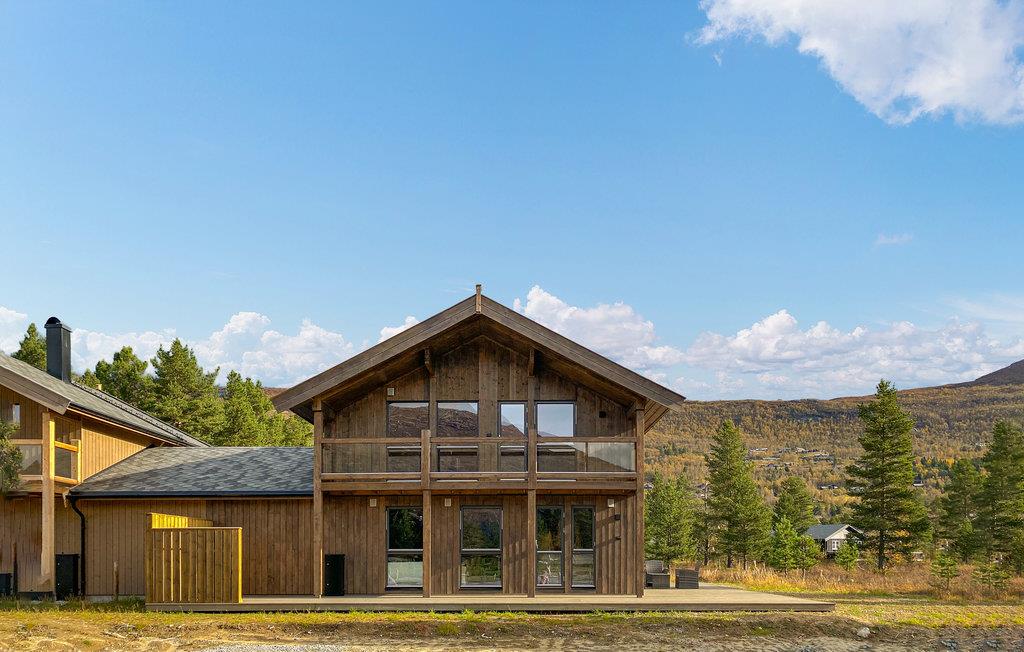 Flot og moderne træhus med smuk udsigt over landskabet.