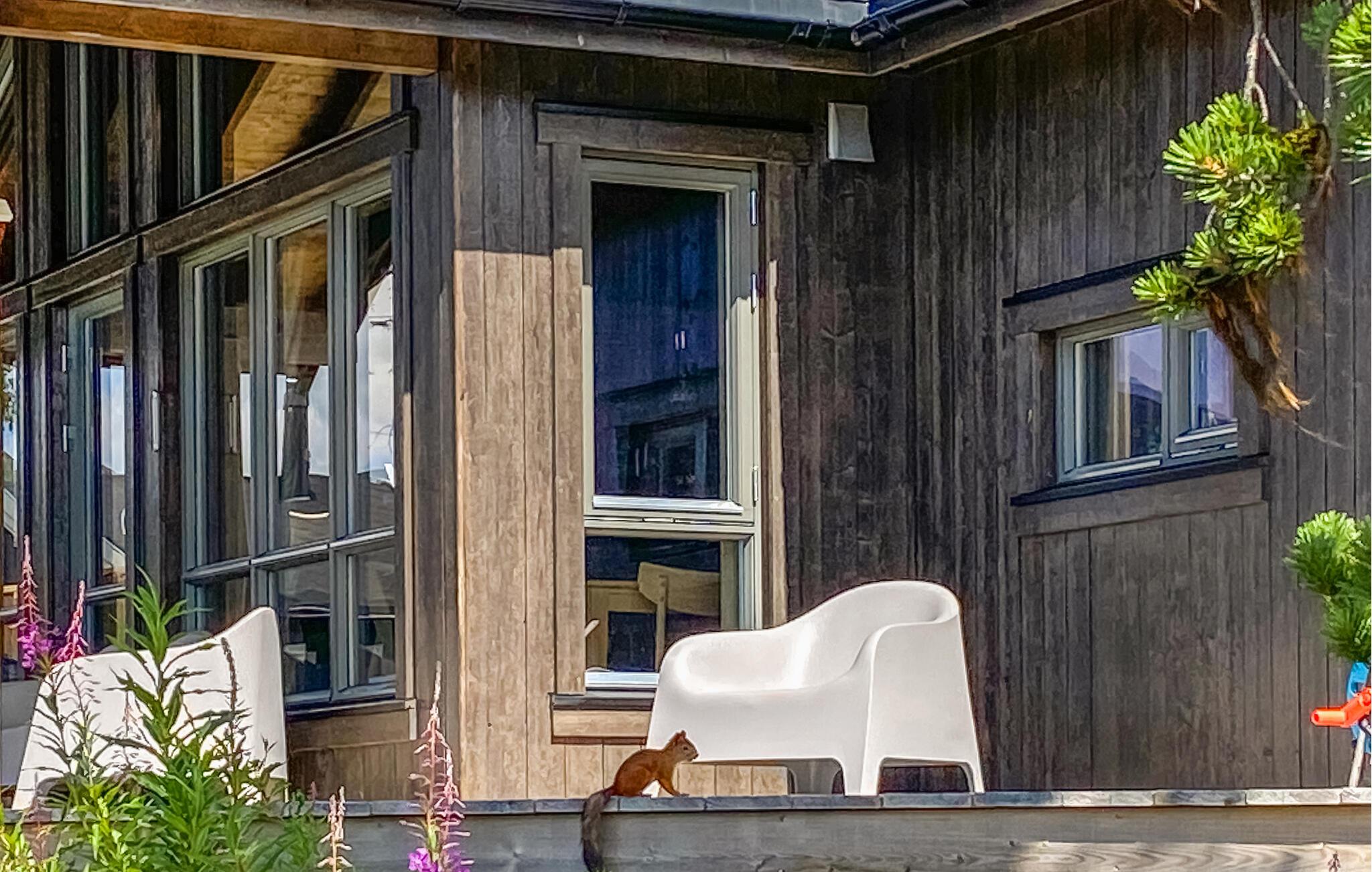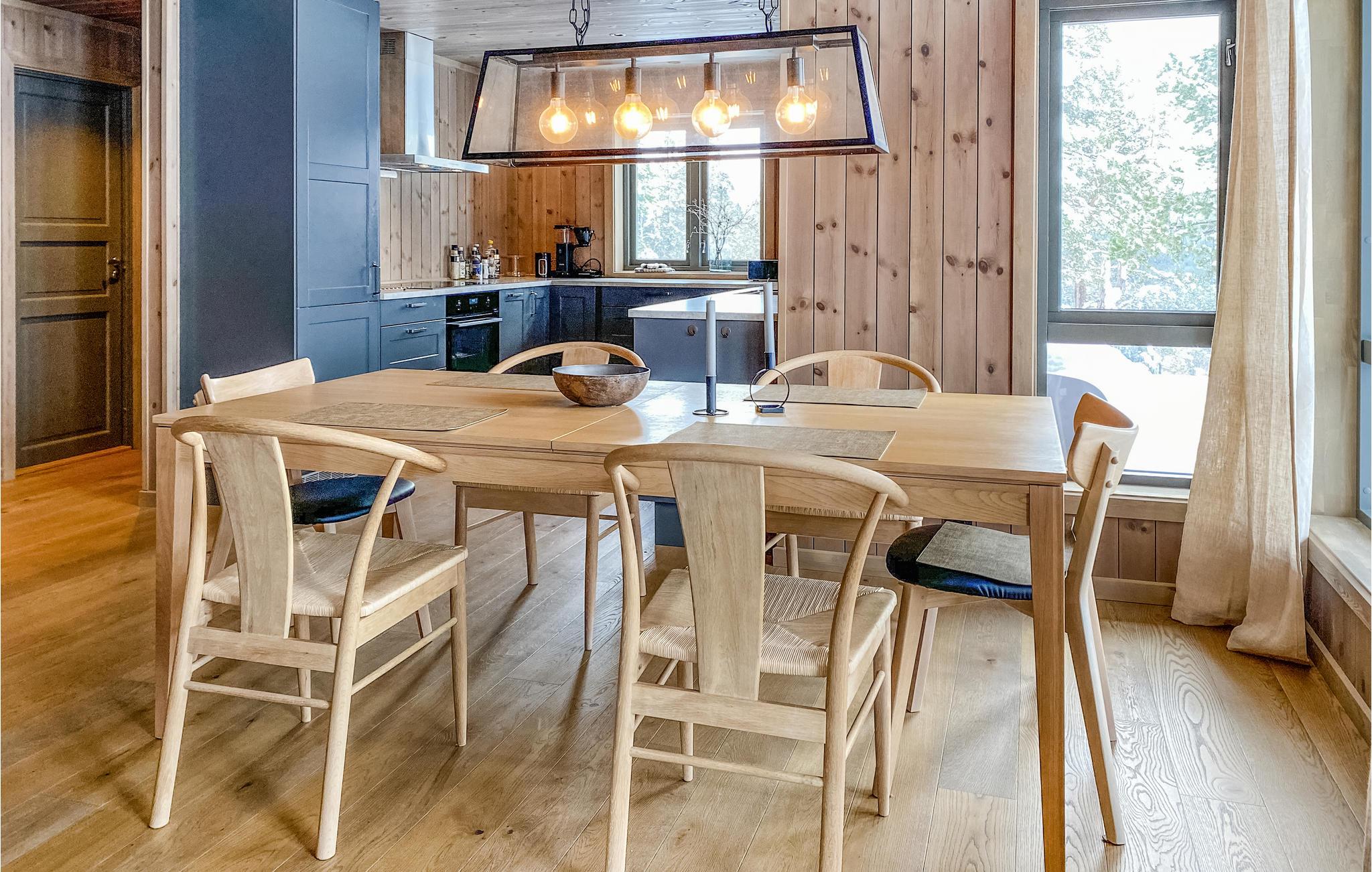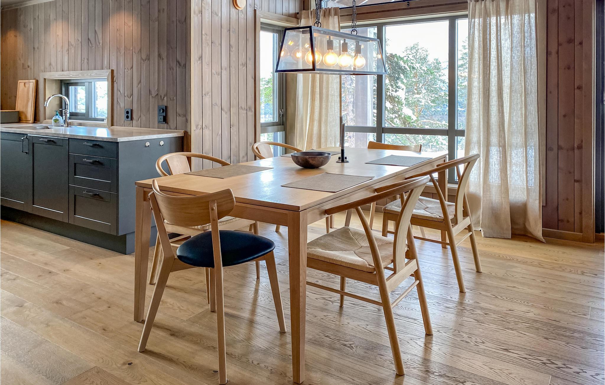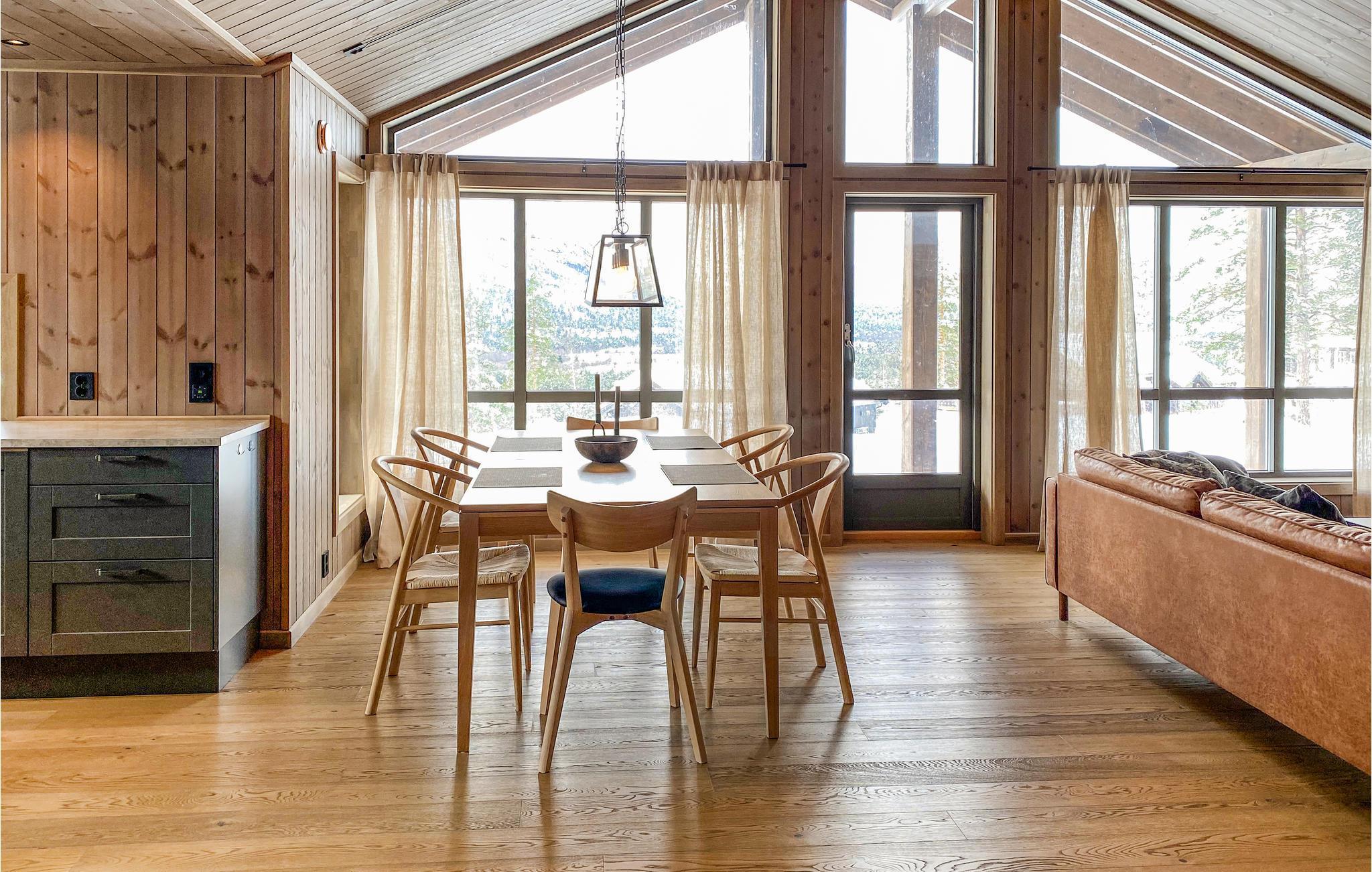 Velkommen til dette skønne feriehus med markante panoramavinduer, der lukker lyset ind i stuen på smukkeste vis. Her kan I se frem til høj komfort og minimalistiske boligløsninger, der gør jeres ophold ekstra behageligt. Fyld dagene med brætspil, hyggelige stunder i køkkenet og rundt om spisebordet. Senere kan I læne jer tilbage i de bløde møbler og snakke om alle dagens bedste oplevelser. På de solrige dage kan I rykke ud på den delvist overdækkede terrasse, hvor I har frit udsyn til de enestående omgivelser.