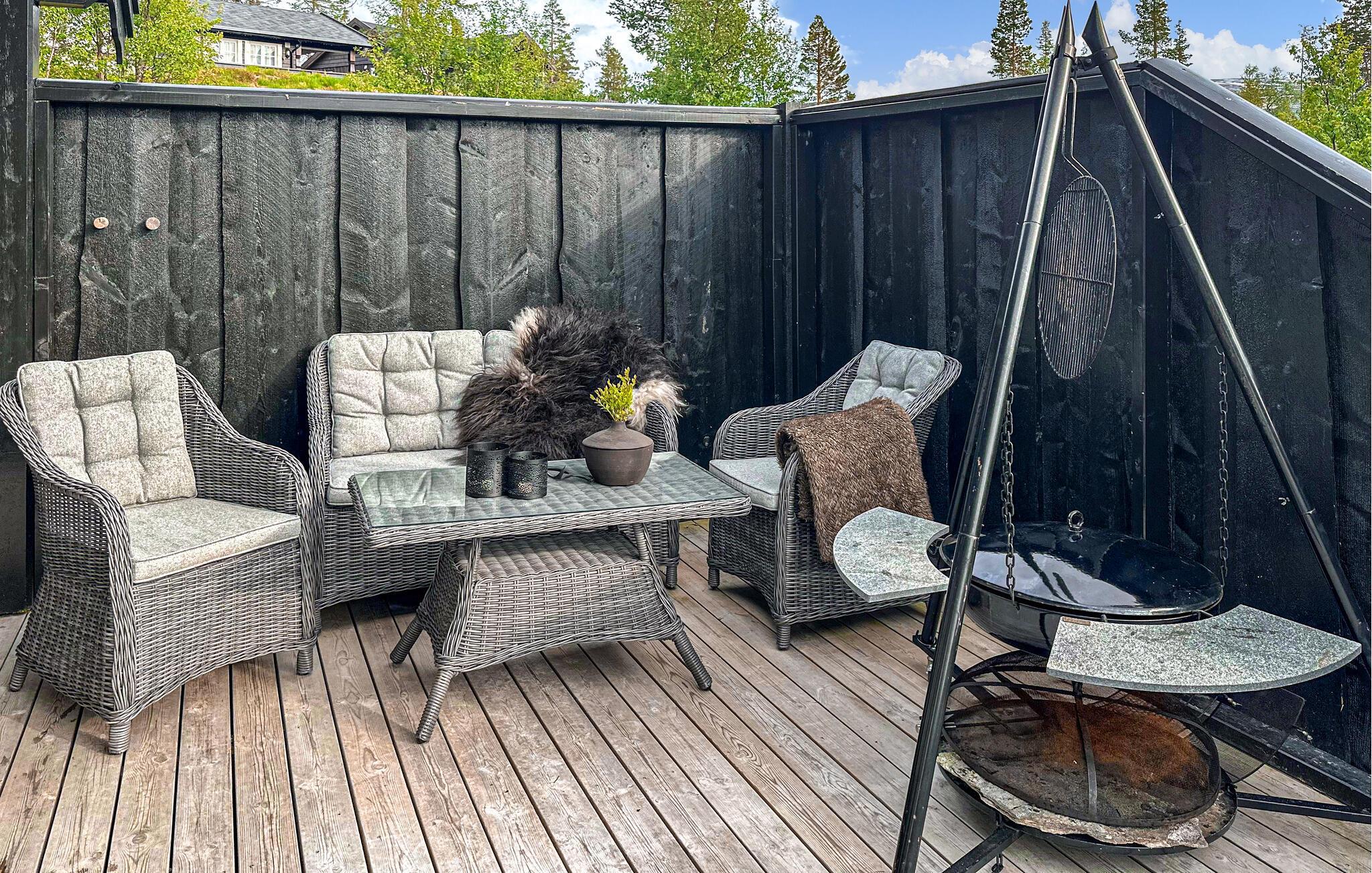 Huset har et skønt udeområde med mange hyggekroge, hvor I kan sidde sammen og sludre til langt ud på natten.