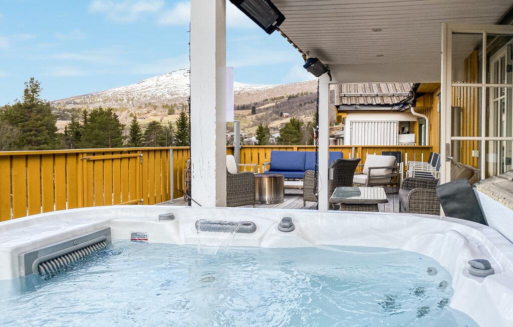 På den store terrasse kan I nyde den storslåede udsigt over det omkringliggende landskab, mens I tager et afslappende bad i spabadet. På kølige aftener kan I tænde terrassevarmeren og snakke over krydret te, indtil den stjerneklare nat kommer.