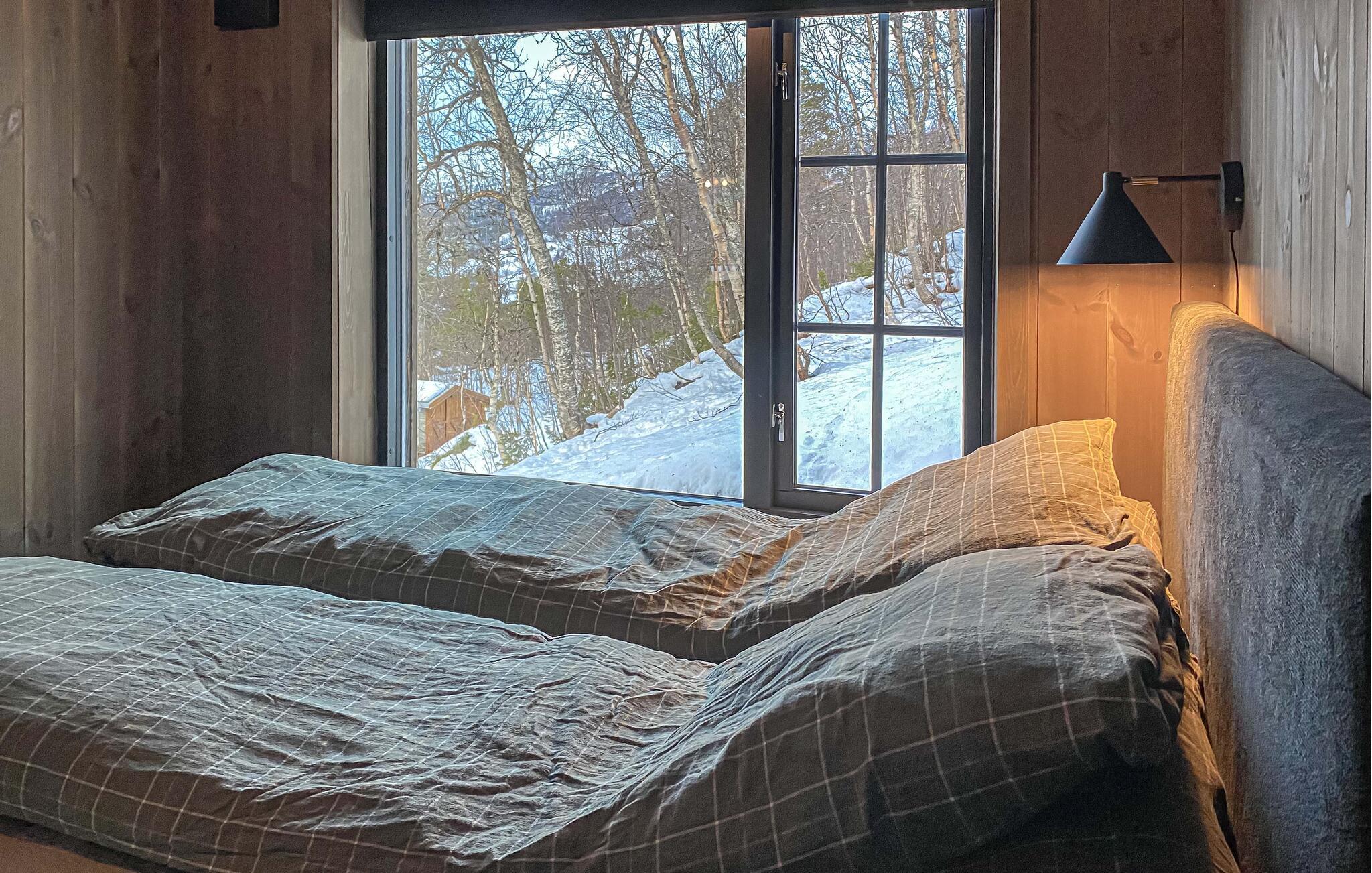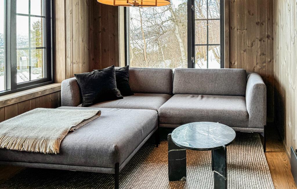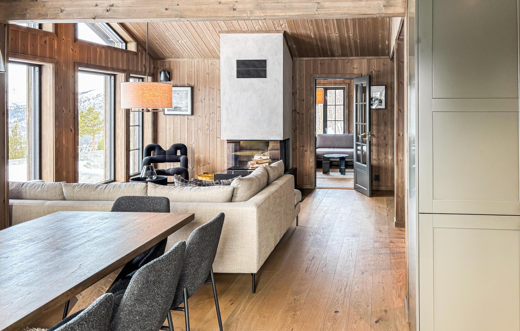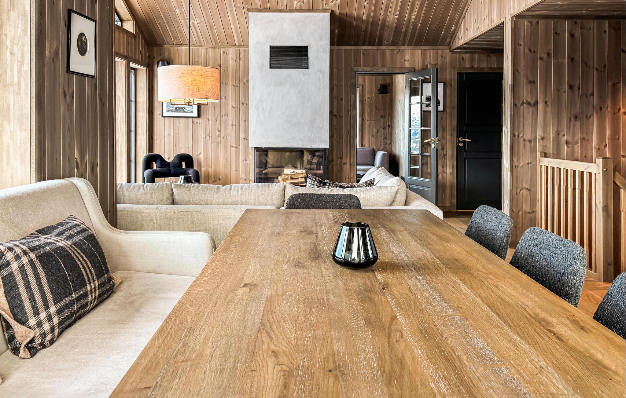 Dette maleriske hus har en varm og rolig atmosfære med lyst træ, store vinduer og moderne møbler. Slap af med en velduftende kop kaffe på sofaen og nyd udsigten over det smukke landskab. Efter en lang dag i naturen kan I slappe af i saunaen og afslutte aftenen med et glas vin ved pejsen.