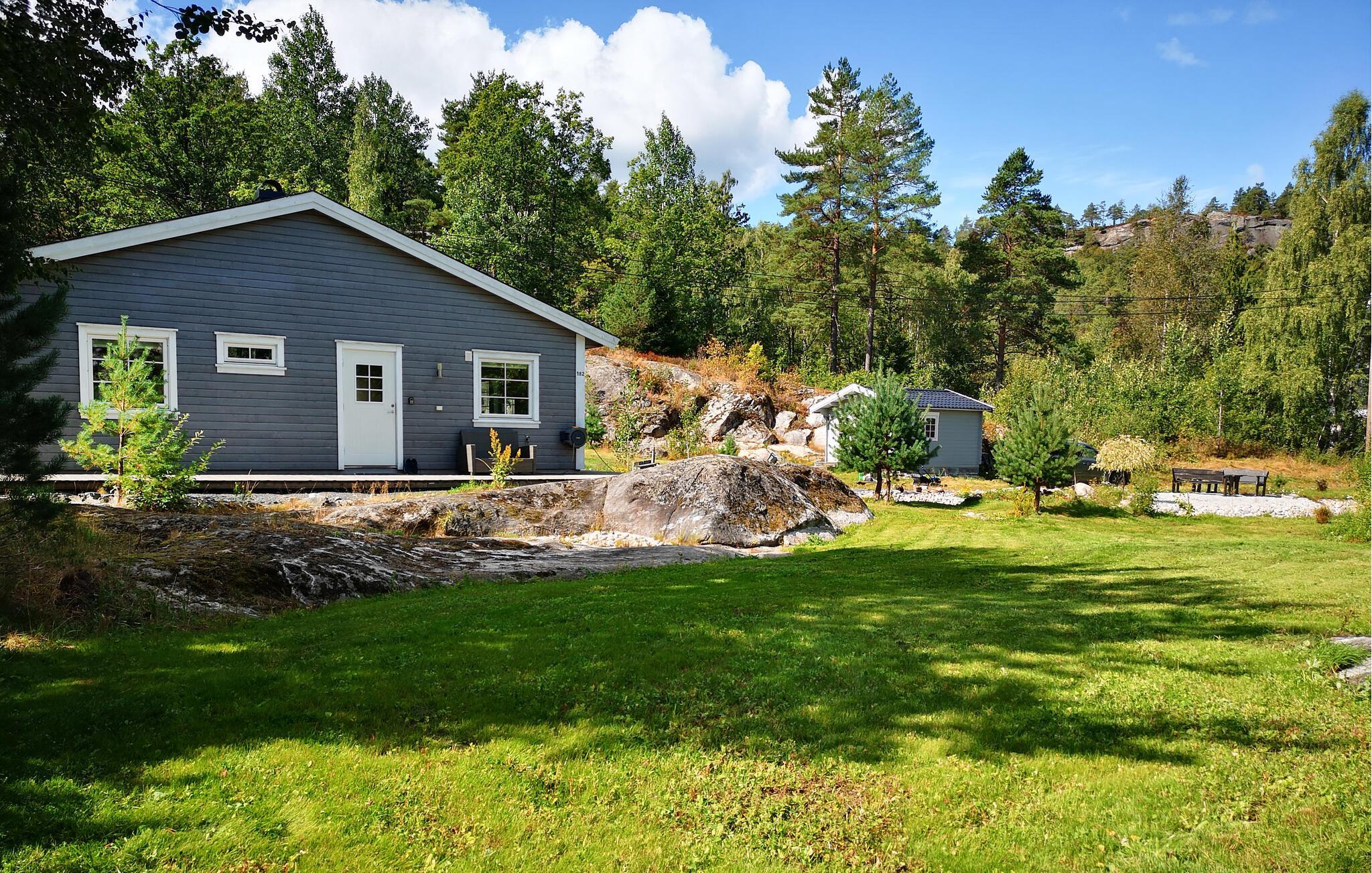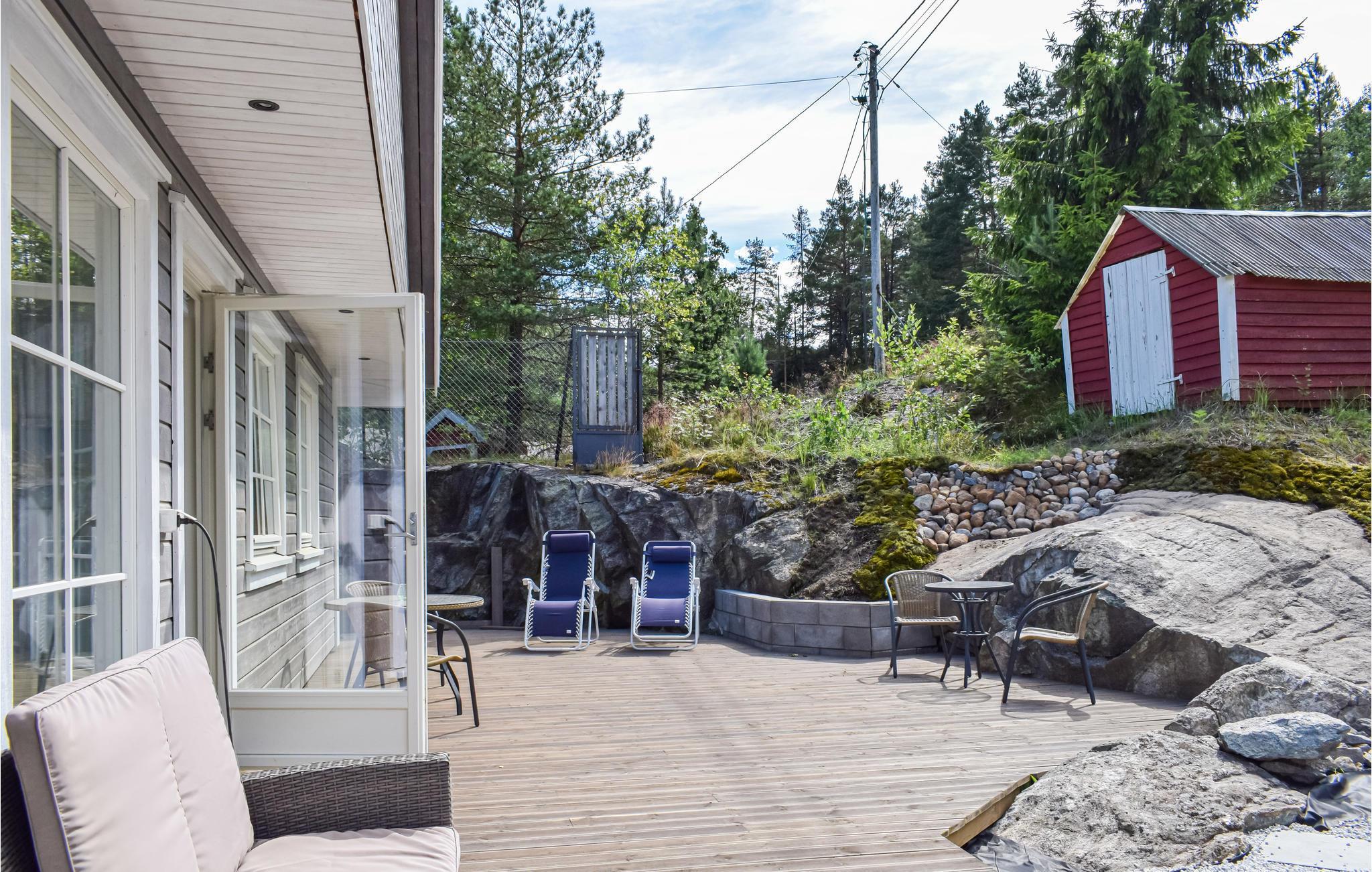 Feriehuset er omgivet af en smuk terrasse, der er omhyggeligt tilpasset den omgivende natur. På terrassen kan I tilberede gode middage eller sidde i solen på varme sommerdage. For samlere er der masser af bær og svampe omkring huset, der kan plukkes, når det er sæson.
