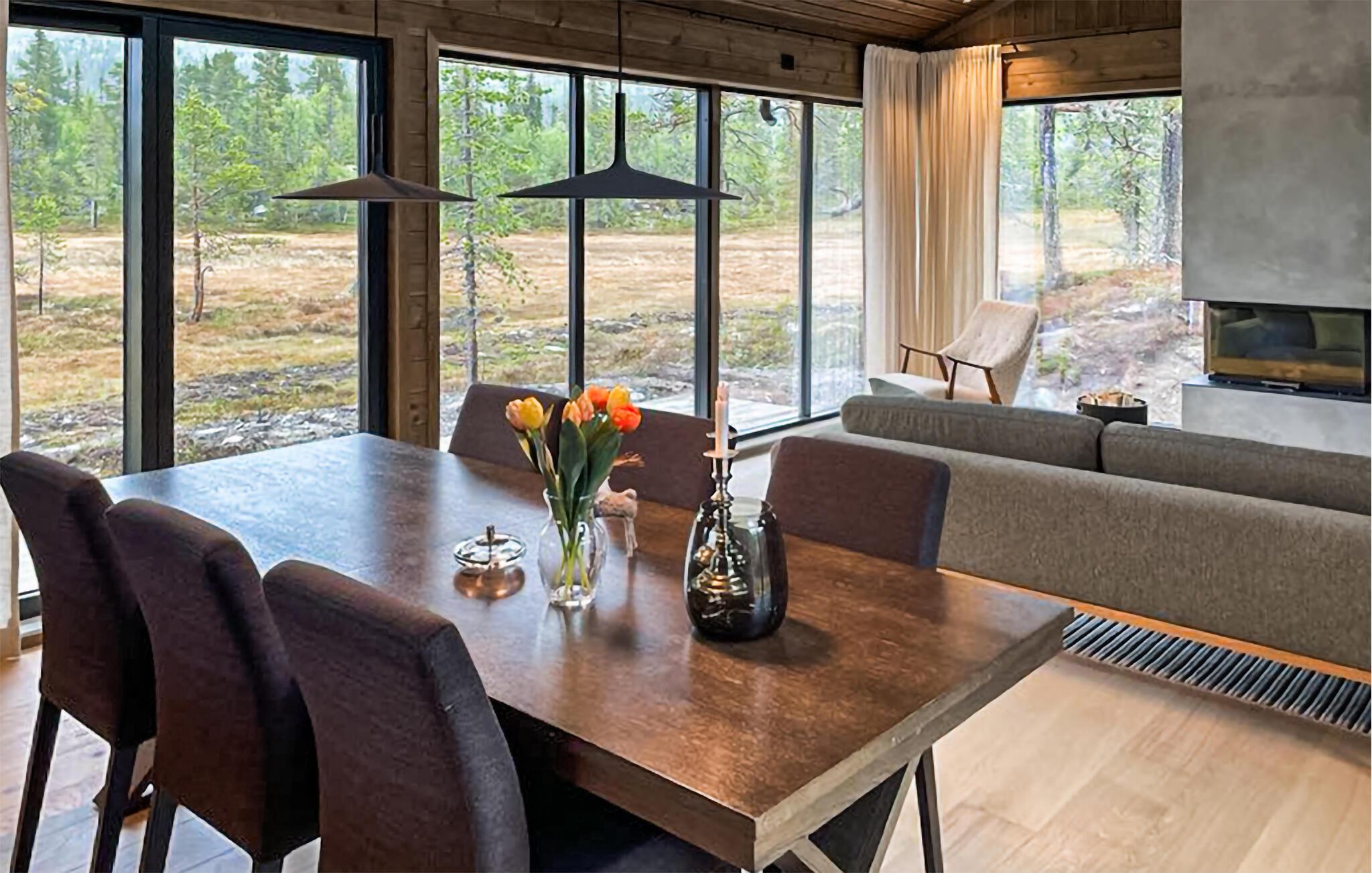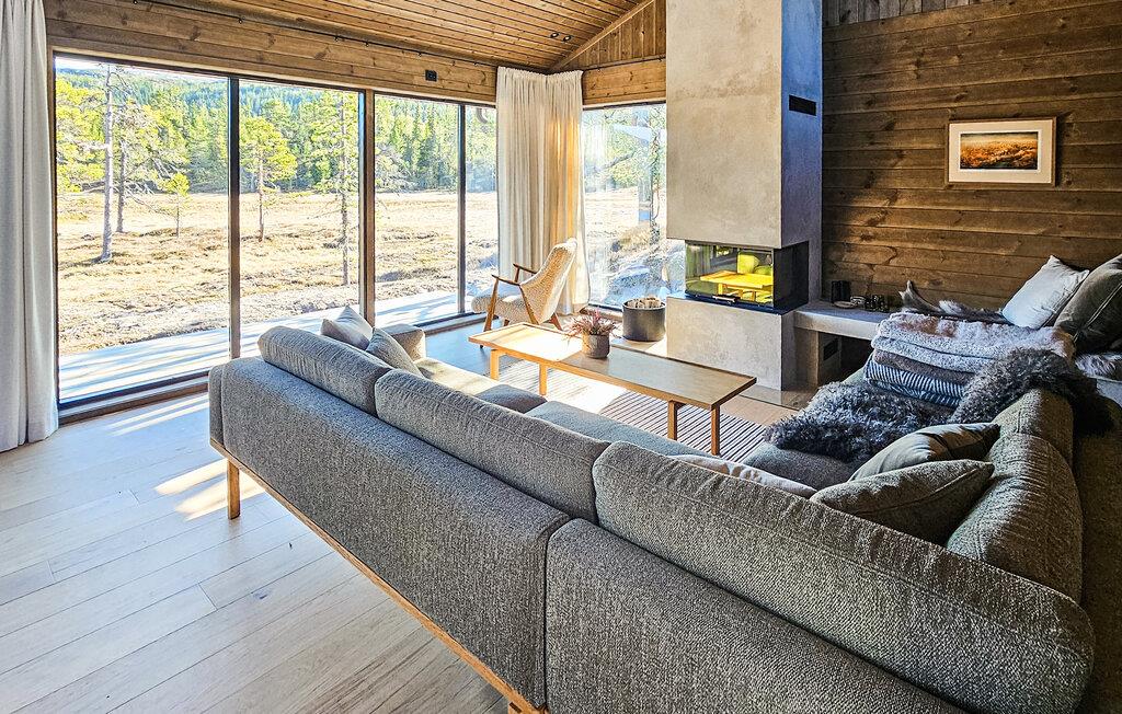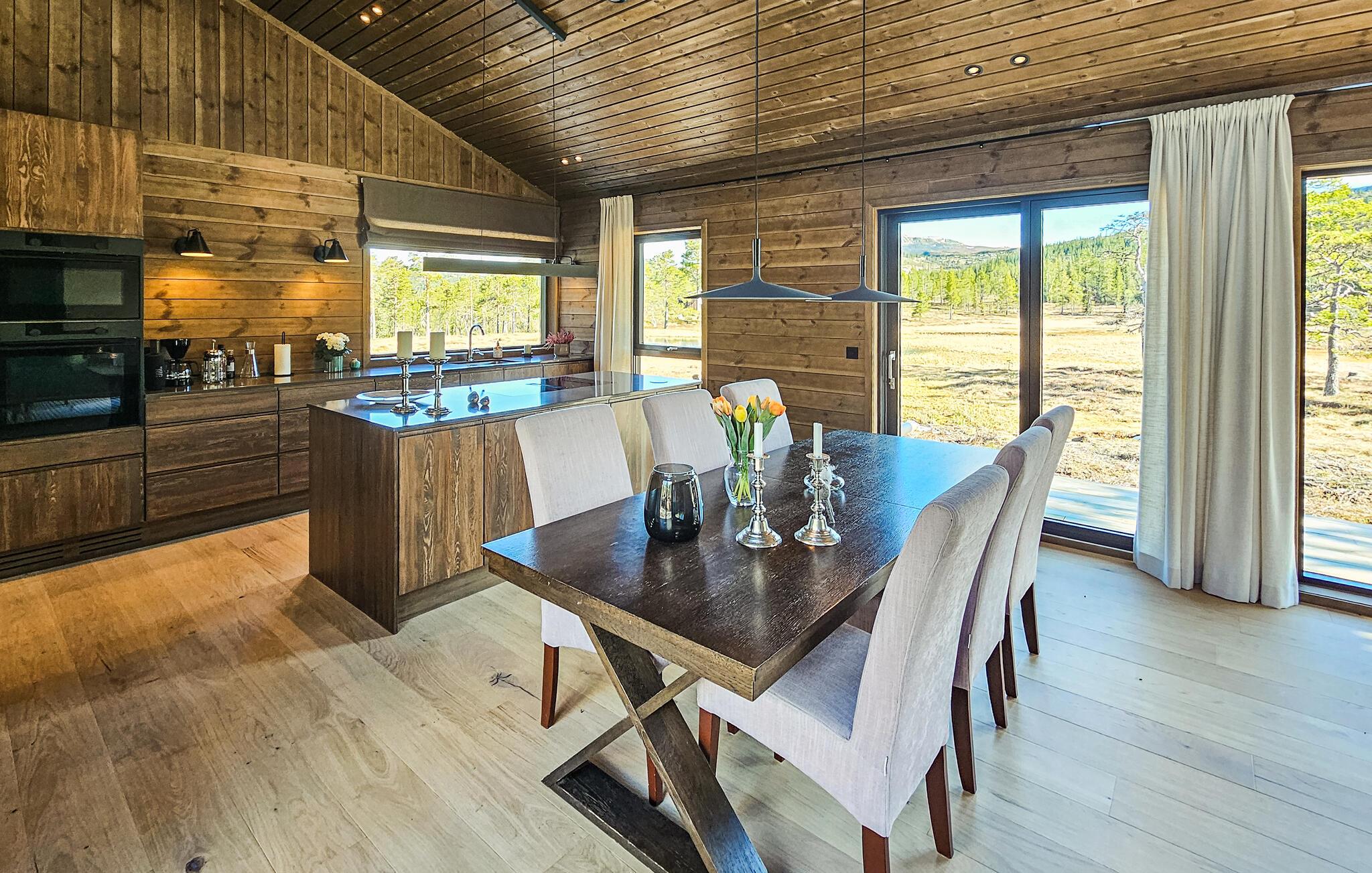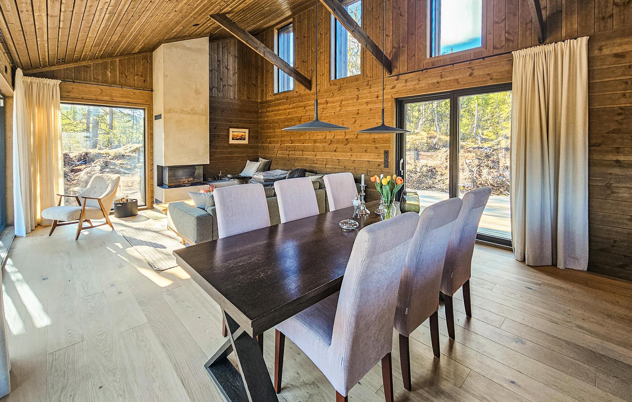 Nyd en dejlig pause i dette stilfulde og kvalitetsindrettede feriehus omgivet af norsk natur. Her finder I det ideelle sted for afslappende ro, spændende aktiviteter og uhindret udsigt over et fantastisk landskab. Træd ind i det moderne interiør med dets åbne planløsning, generøse vinduer og varme træstemning. Find jer til rette i den store sofa foran pejsen og lad blikket vandre gennem panoramavinduerne. Lav mad sammen i køkkenet med køkkenø, moderne apparater og rigelig arbejdsplads. Den tilstødende spiseplads med et stort træbord er perfekt til hyggelige aftener.