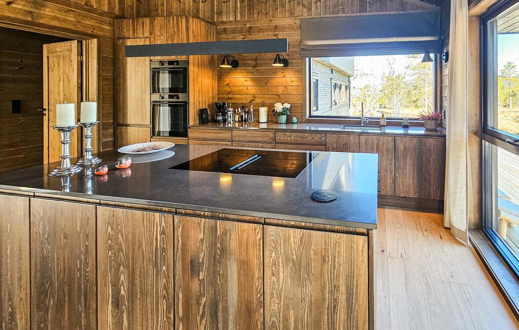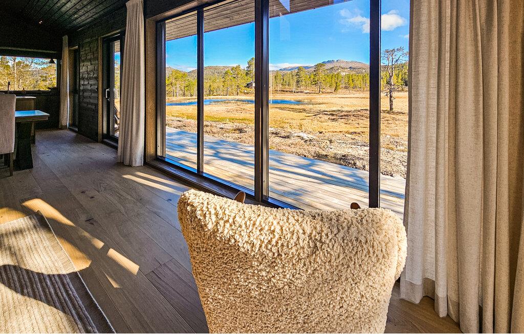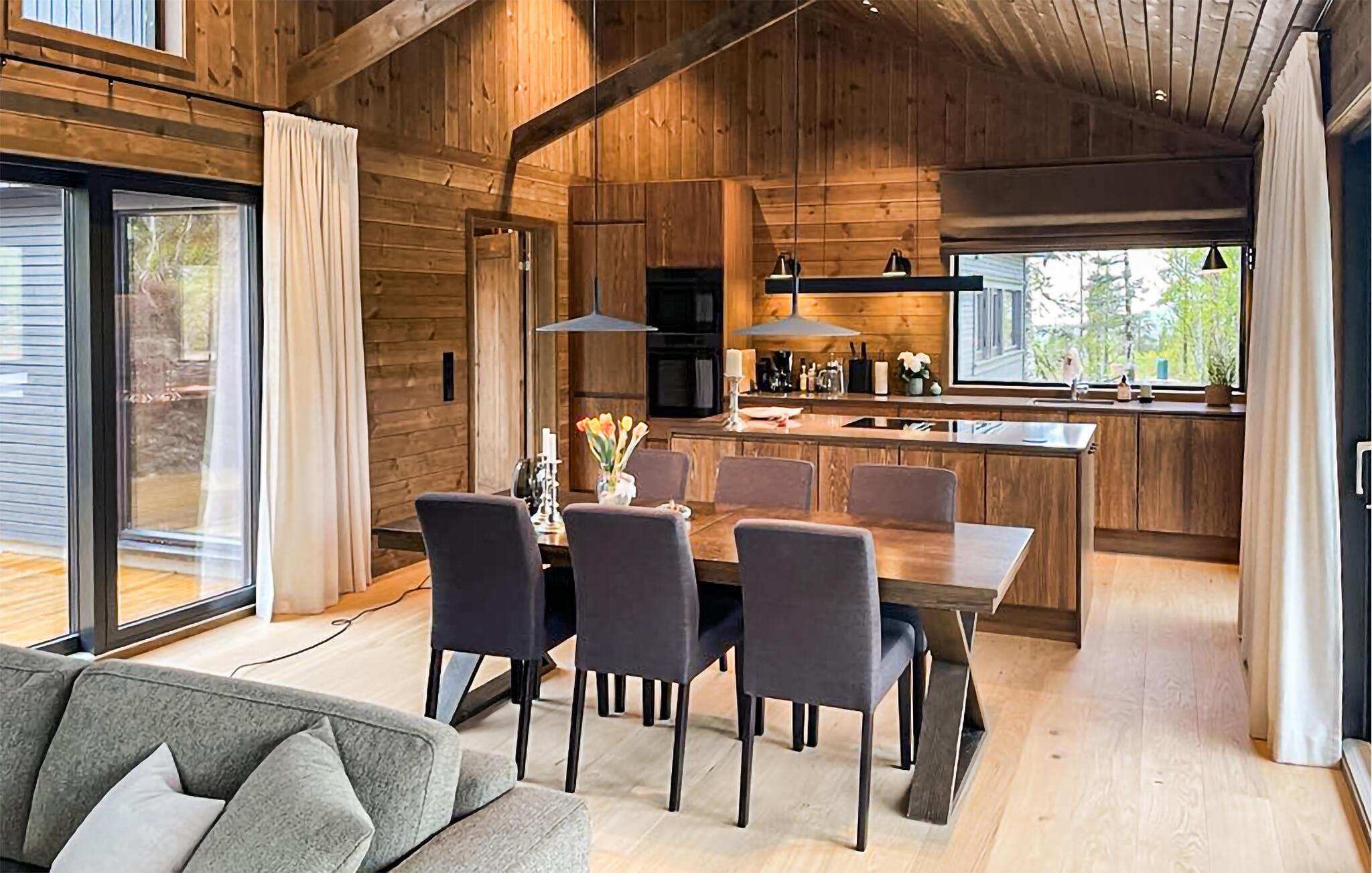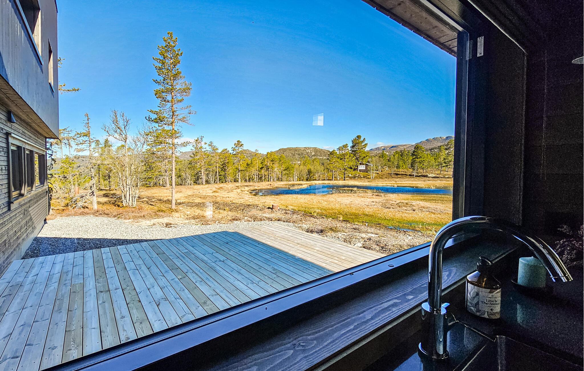 Nyd en dejlig pause i dette stilfulde og kvalitetsindrettede feriehus omgivet af norsk natur. Her finder I det ideelle sted for afslappende ro, spændende aktiviteter og uhindret udsigt over et fantastisk landskab. Træd ind i det moderne interiør med dets åbne planløsning, generøse vinduer og varme træstemning. Find jer til rette i den store sofa foran pejsen og lad blikket vandre gennem panoramavinduerne. Lav mad sammen i køkkenet med køkkenø, moderne apparater og rigelig arbejdsplads. Den tilstødende spiseplads med et stort træbord er perfekt til hyggelige aftener.