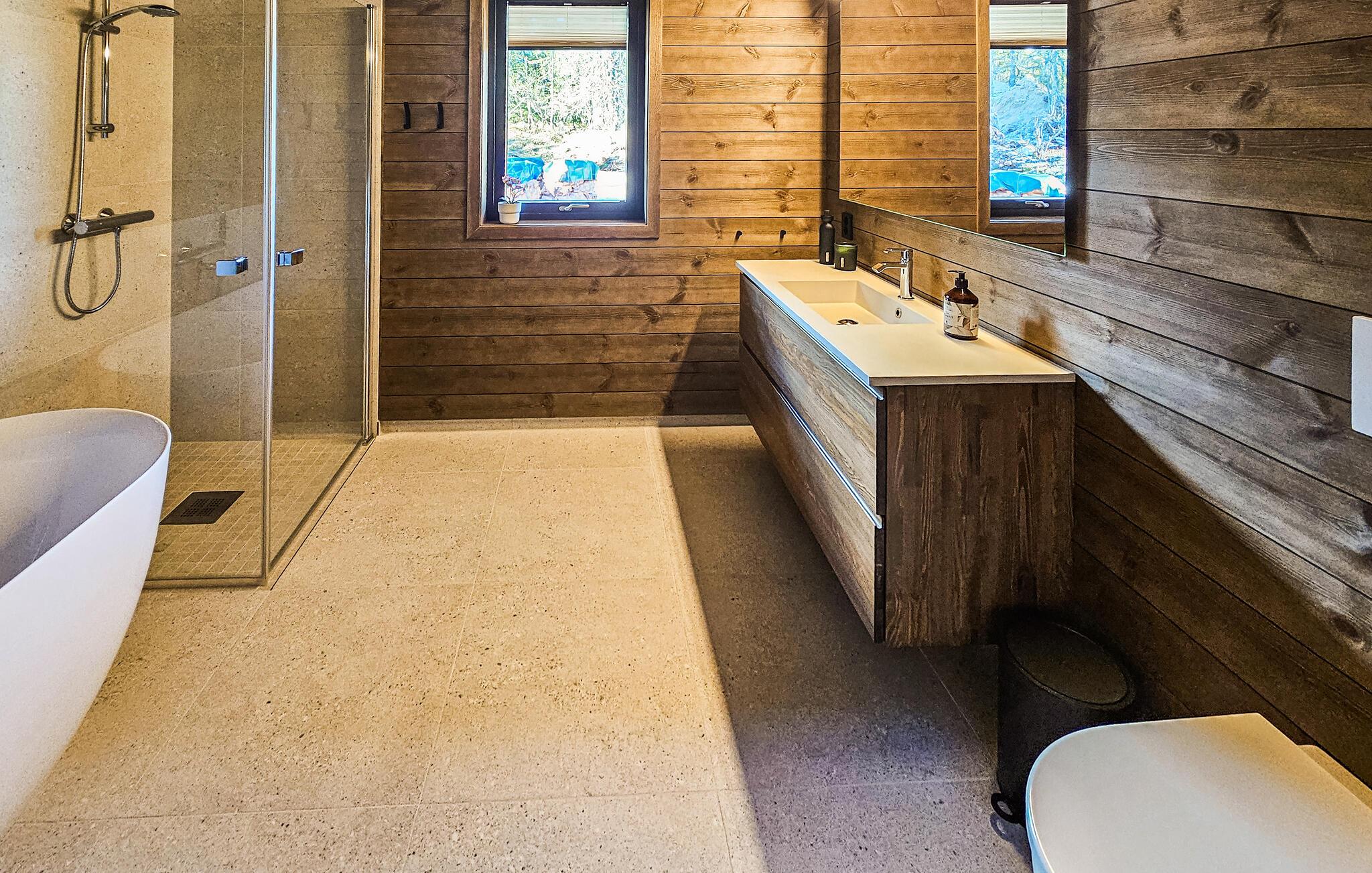 Brug den brede træterrasse til morgenmad i solen eller en afslappende eftermiddag i en lænestol. Terrassen åbner ud mod en beskyttet grund med udsigt over skove, et lille vandløb og blide bjergskråninger. Se på fugle, tag en dyb indånding og indtag roen.