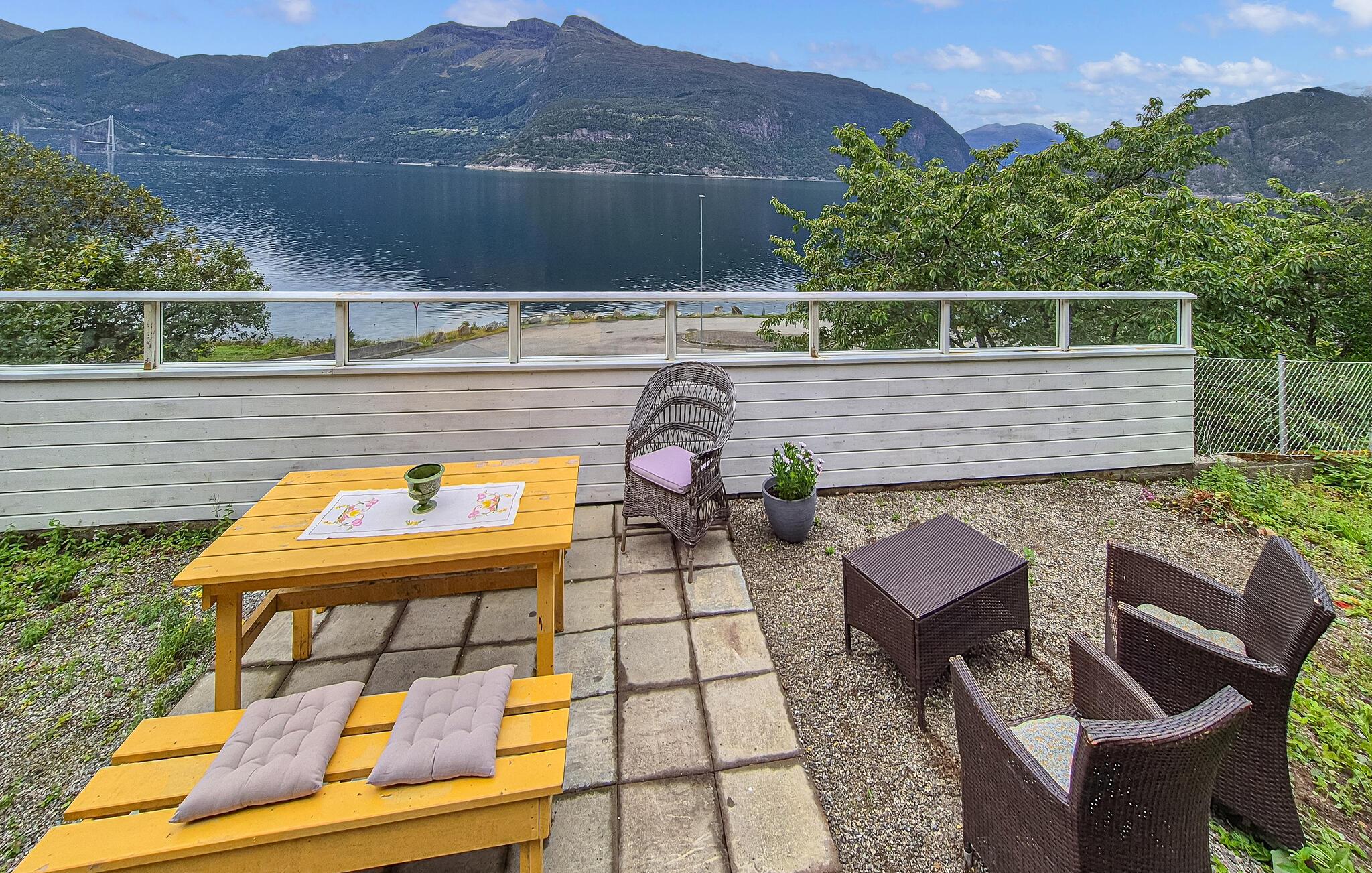 Nyd freden og roen og den storslåede udsigt over Hardangerfjorden fra terrassen. Slap af på de komfortable siddepladser, læs en bog eller nyd blot udsigten over de omkringliggende bjerge. Brug grillen og tilbered frisk fisk, måske endda fanget af jer selv.