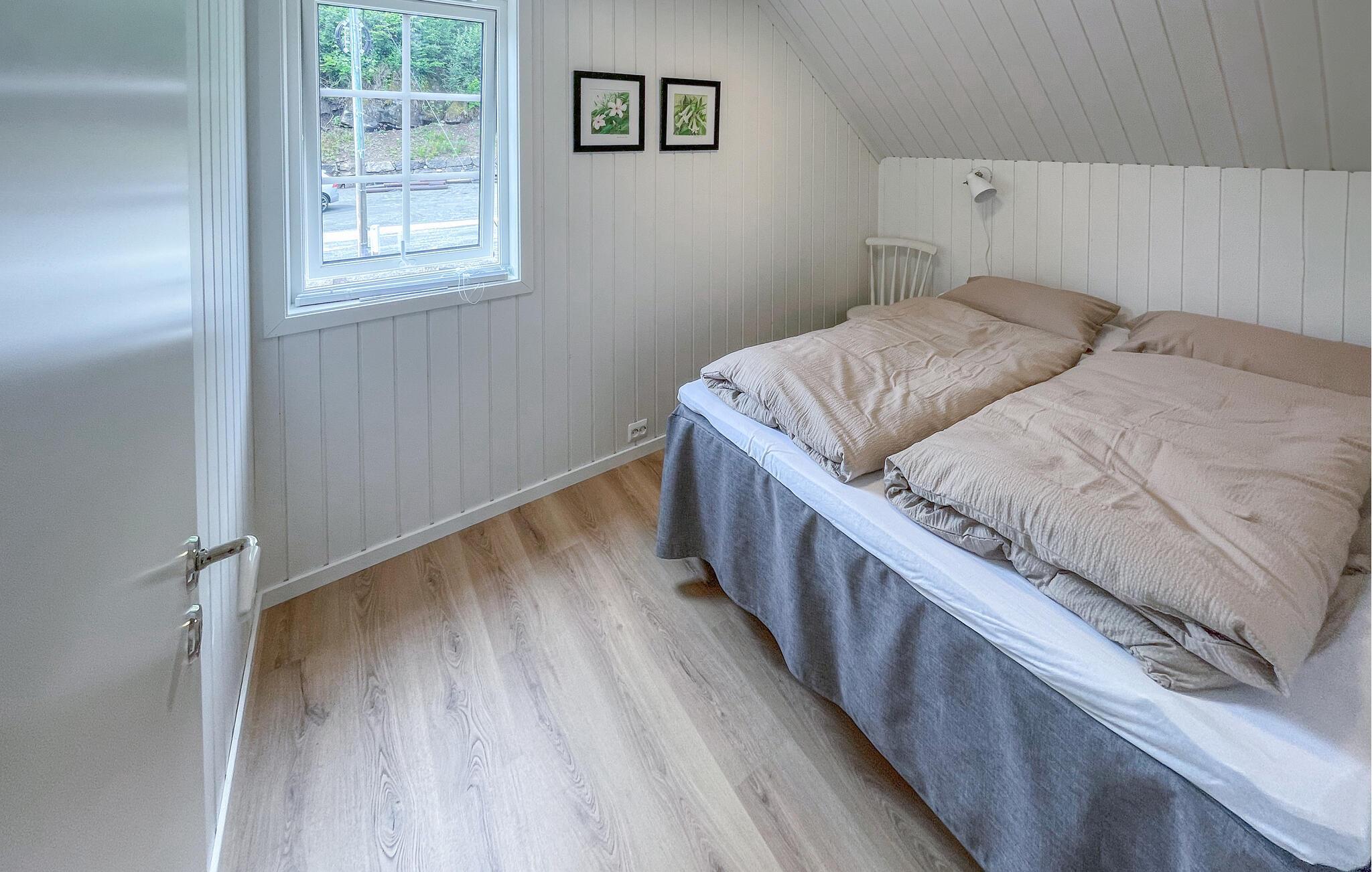 Velkommen til dette indbydene feriehus, som ligger idyllisk ud til vandet. De stilfulde møbler kombinerer moderne indretning med en hjemlig charme. Her får I plads til, at holde en velfortjent pause fra hverdagens tummerum. Gulv-til-loft vinduerne i alrummet giver en skøn udsigt over fjorden og lukker masser af lys ind. Sving benene op i sofaen eller kast jer ud i nye norske madretter i køkkenet. Om aftenen kan I hygge jer med brætspil og snacks ved spisebordet.