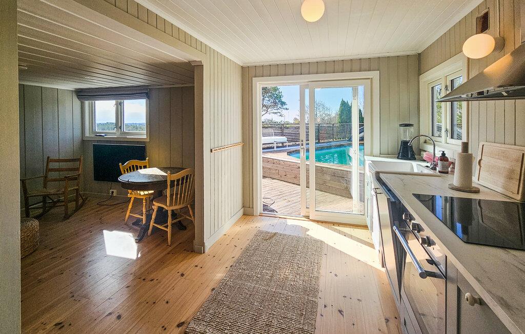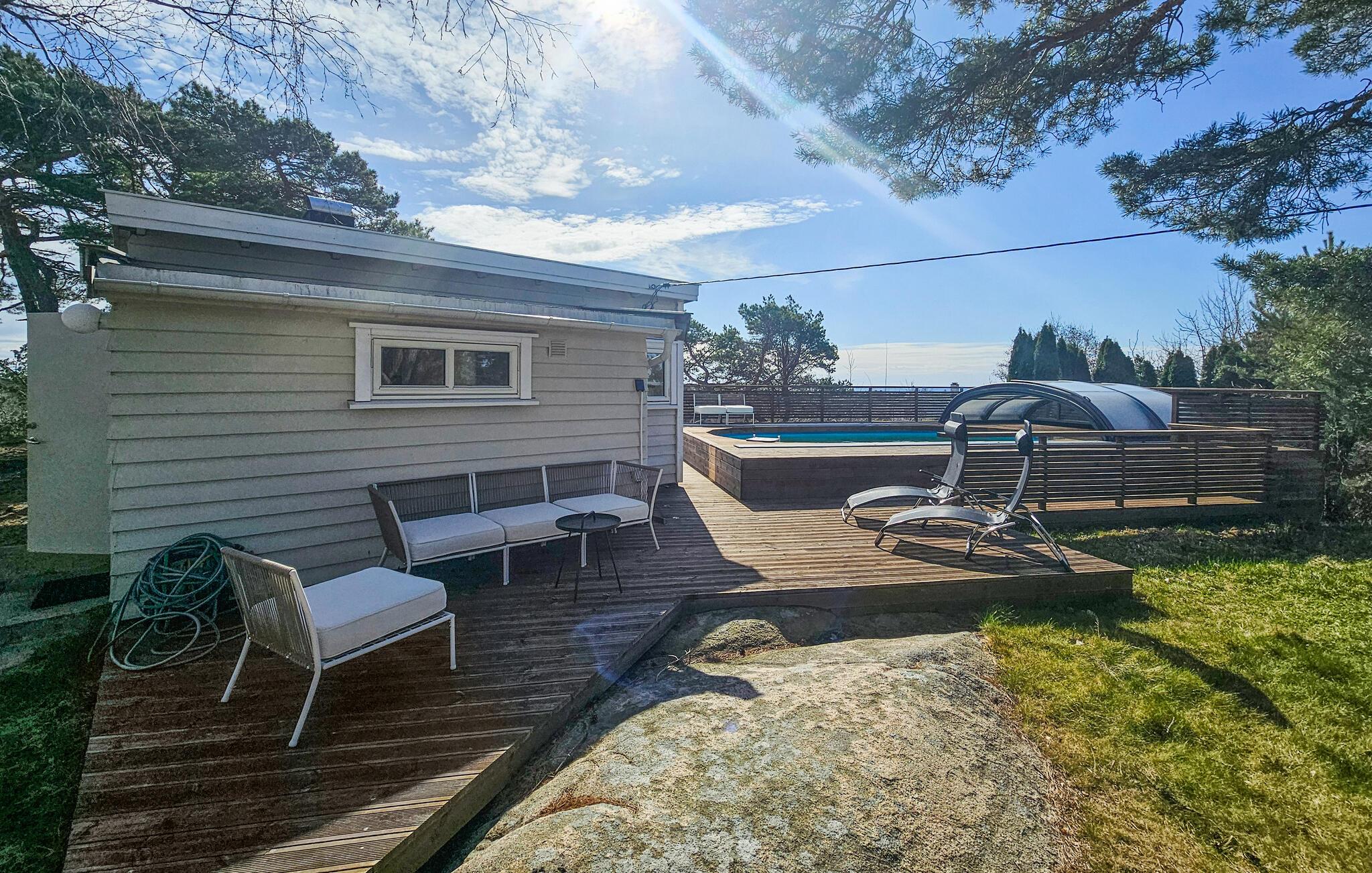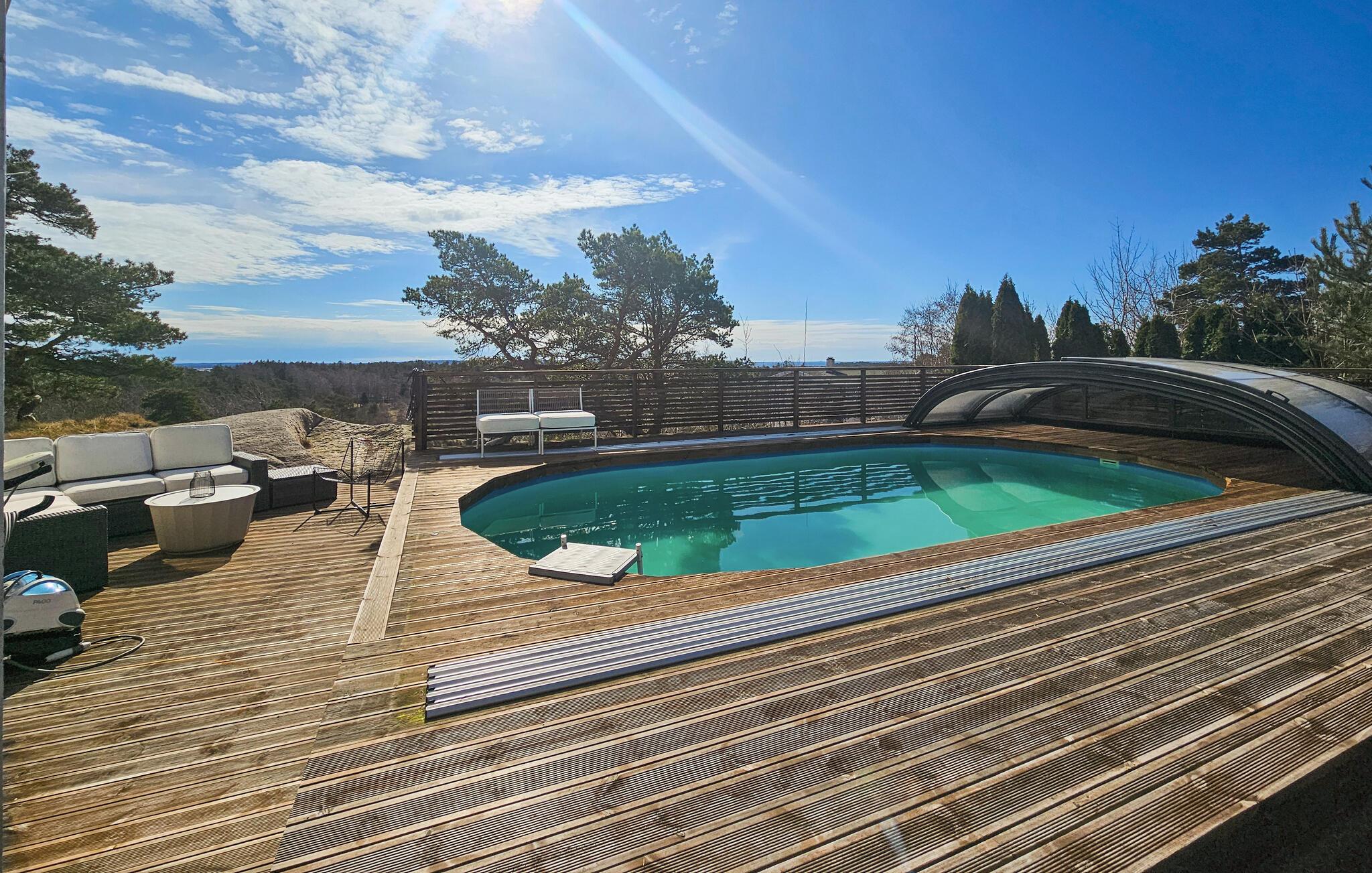 Nyd afslappende dage i dette komfortable feriehus med udsigt over poolen og fjorden.