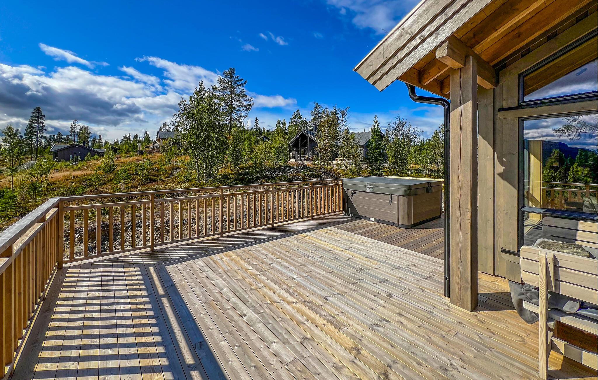 Den smukke træterrasse er det ideelle sted til en solid morgenmad på solrige dage. Et spabad venter jer her, hvor I kan nyde afslappende øjeblikke og betragte landskabet. Tænd op i grillen og nyd roen under den imponerende stjernehimmel.
