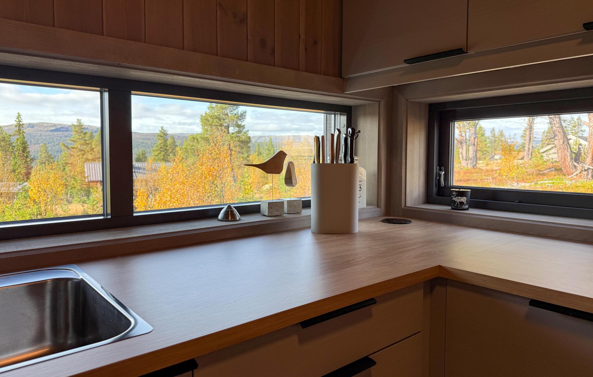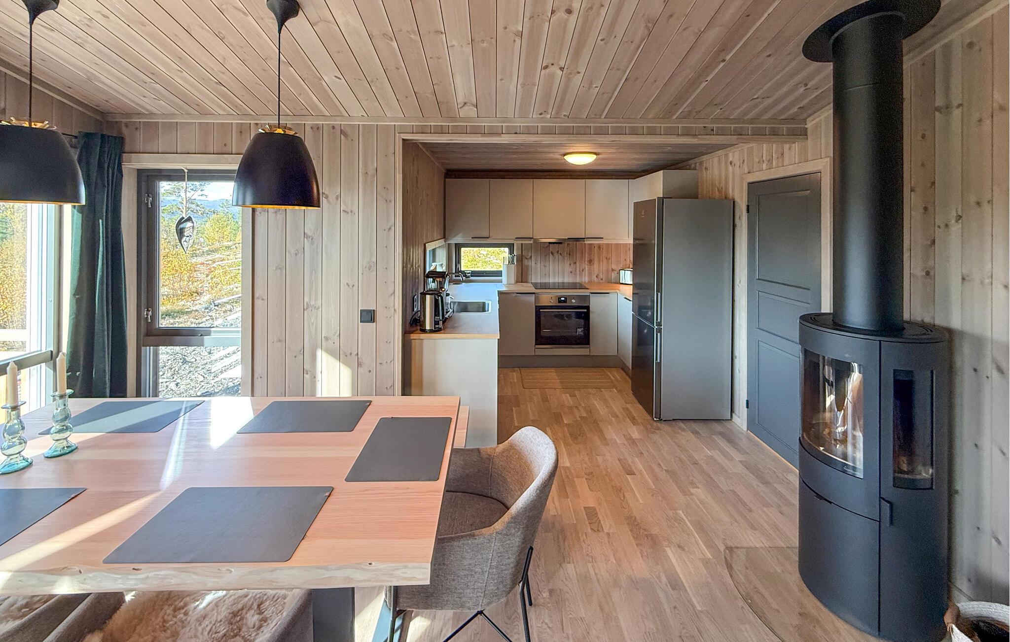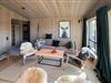 Nyd en pause i dette stilfulde feriehus, der er noget særligt med sin lyse træarkitektur og fredelige beliggenhed omgivet af natur. Sæt jer til rette i den hyggelige opholdsstue med store vinduer med udsigt over landskabet. Gør det behageligt i sofaen, lad pejsen knitre og nyd den varme atmosfære. Brug det store spisebord til fælles måltider, og tilbring hyggelige aftener i stearinlysets skær. Tilbered jeres måltider i det moderne køkken med rigelig arbejdsplads og en smuk udsigt.