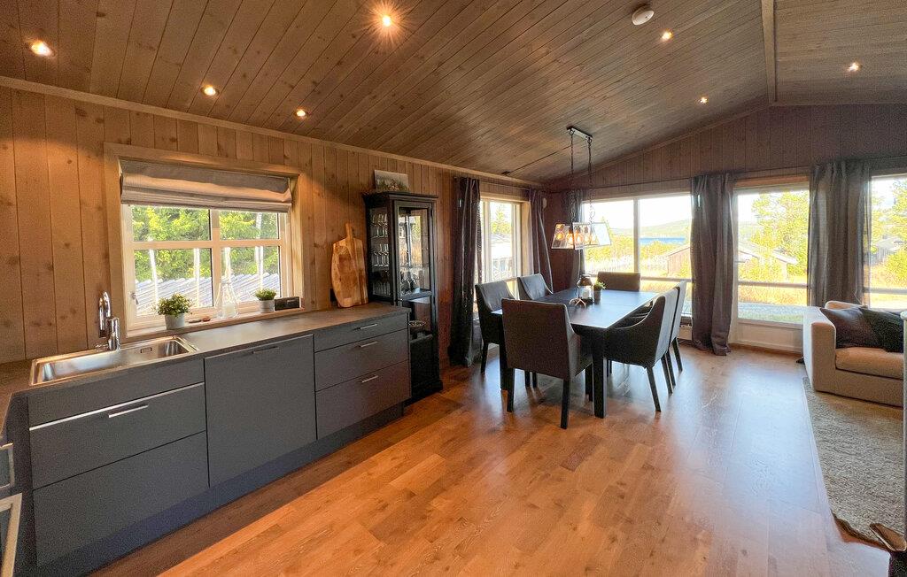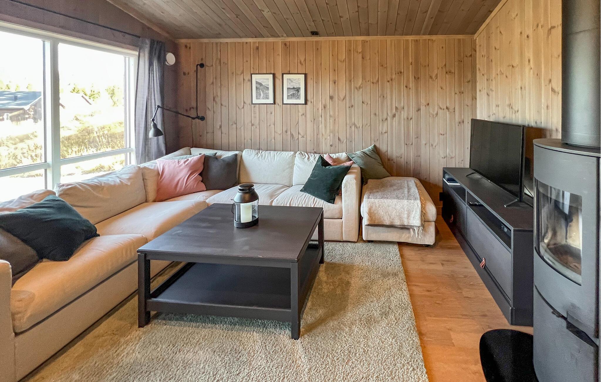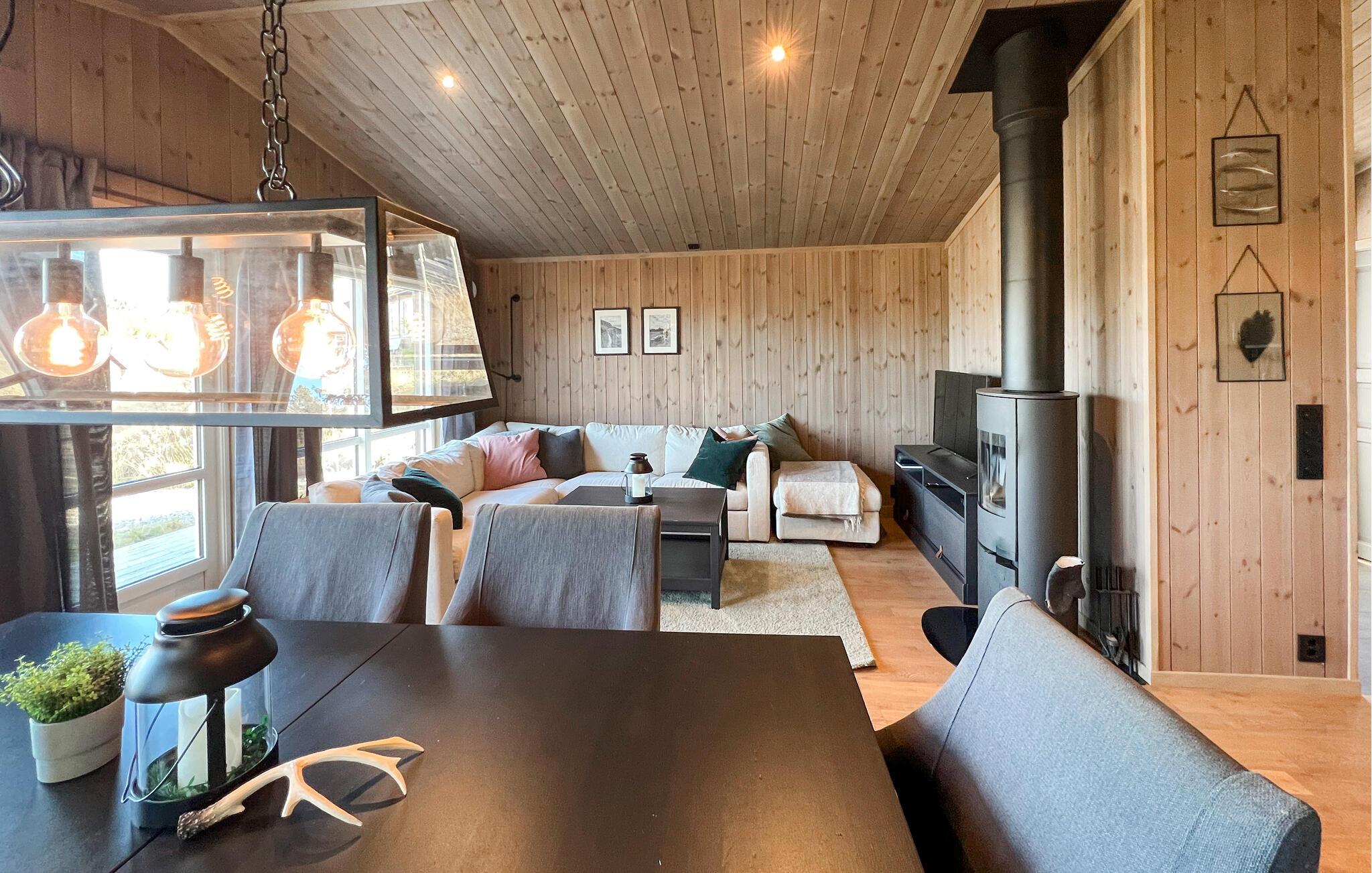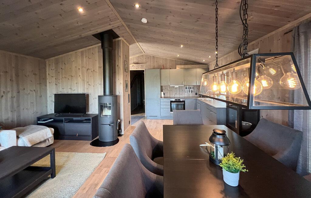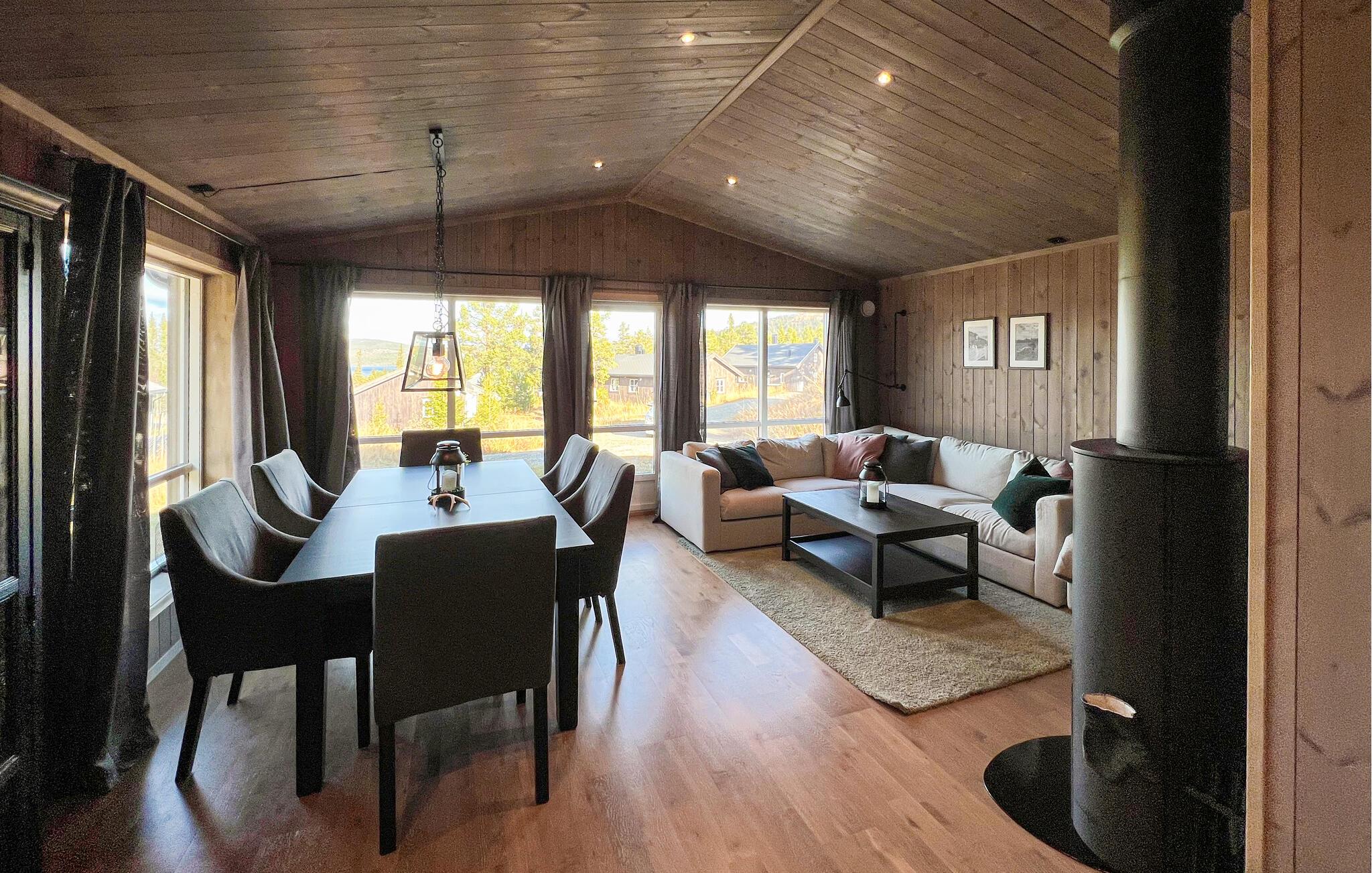 Nyd afslappende dage i denne smagfuldt indrettede hytte, der kombinerer varme, ro og nordisk design. Omgivet af skove og bjerge tilbyder huset en idyllisk atmosfære. Slap af i den lyse opholdsstue med store panoramavinduer med udsigt over landskabet. Den hyggelige sofakrog lægger op til rolige timer foran pejsen, mens den åbne planløsning med spiseplads og moderne køkken skaber en følelse af rummelighed. Tilbered jeres måltider i det stilfulde køkken og nyd dem ved det lange træbord under varmt lys. Træpanelvægge og omhyggeligt udvalgte detaljer skaber en harmonisk, skandinavisk atmosfære.