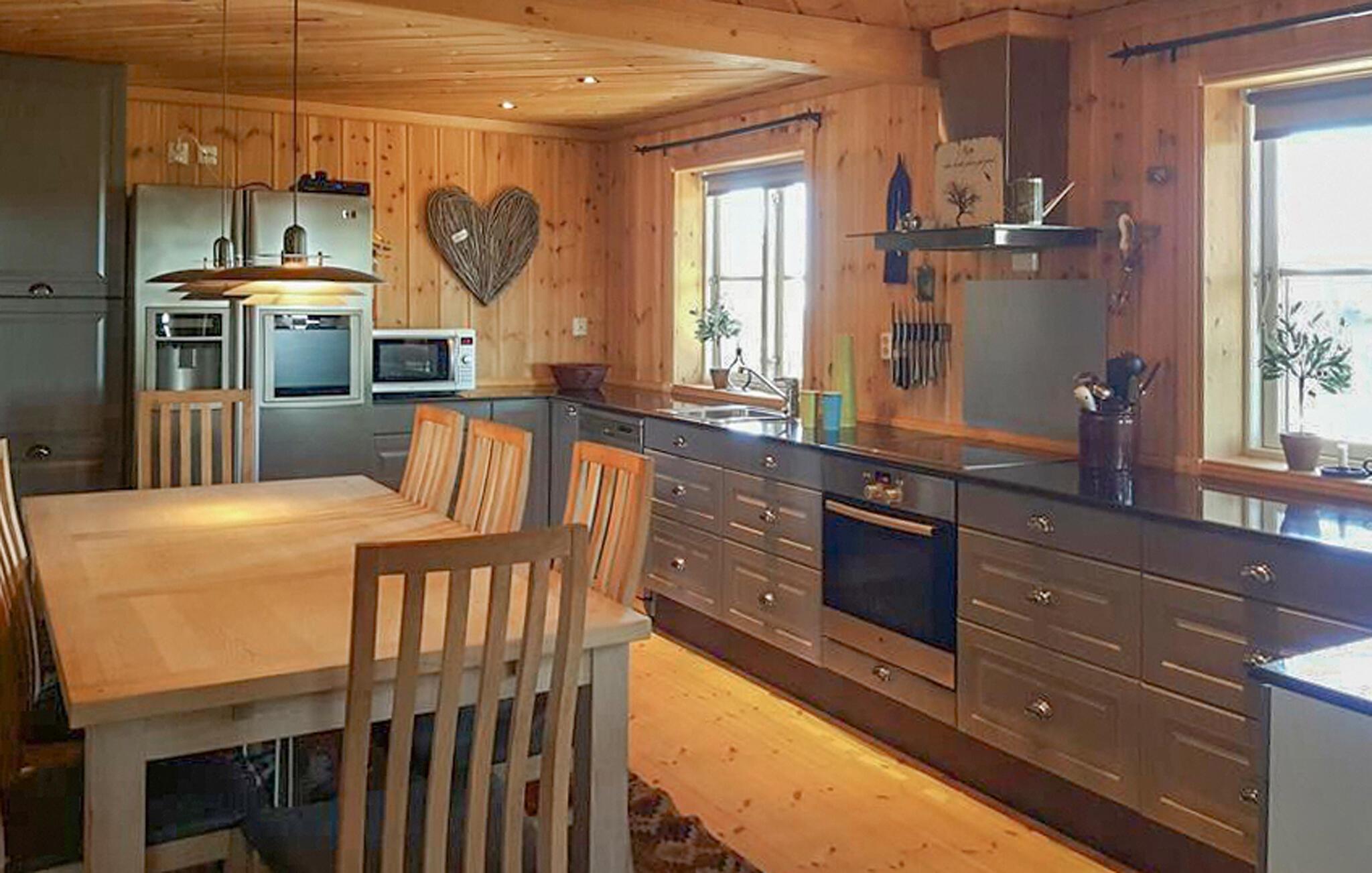 Dette stilfuldt og komfortable feriehus forkæler jer med ekstraudstyr og talrige fritidsaktiviteter i umiddelbar nærhed. Arranger sjove madlavningsarrangementer i det rummelige køkken og glæd jer til omgængelige måltider i den hyggelige spiseplads. Forkæl jer selv med hyggelige stunder i saunaen, tænd brændeovnen, gør jer godt tilpas til en spilleaften i den indbydende stue eller læg fødderne op, mens I sidder tilbagelænet i læsestolen.