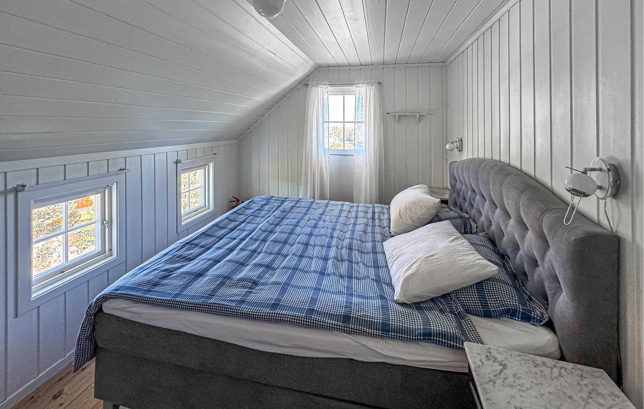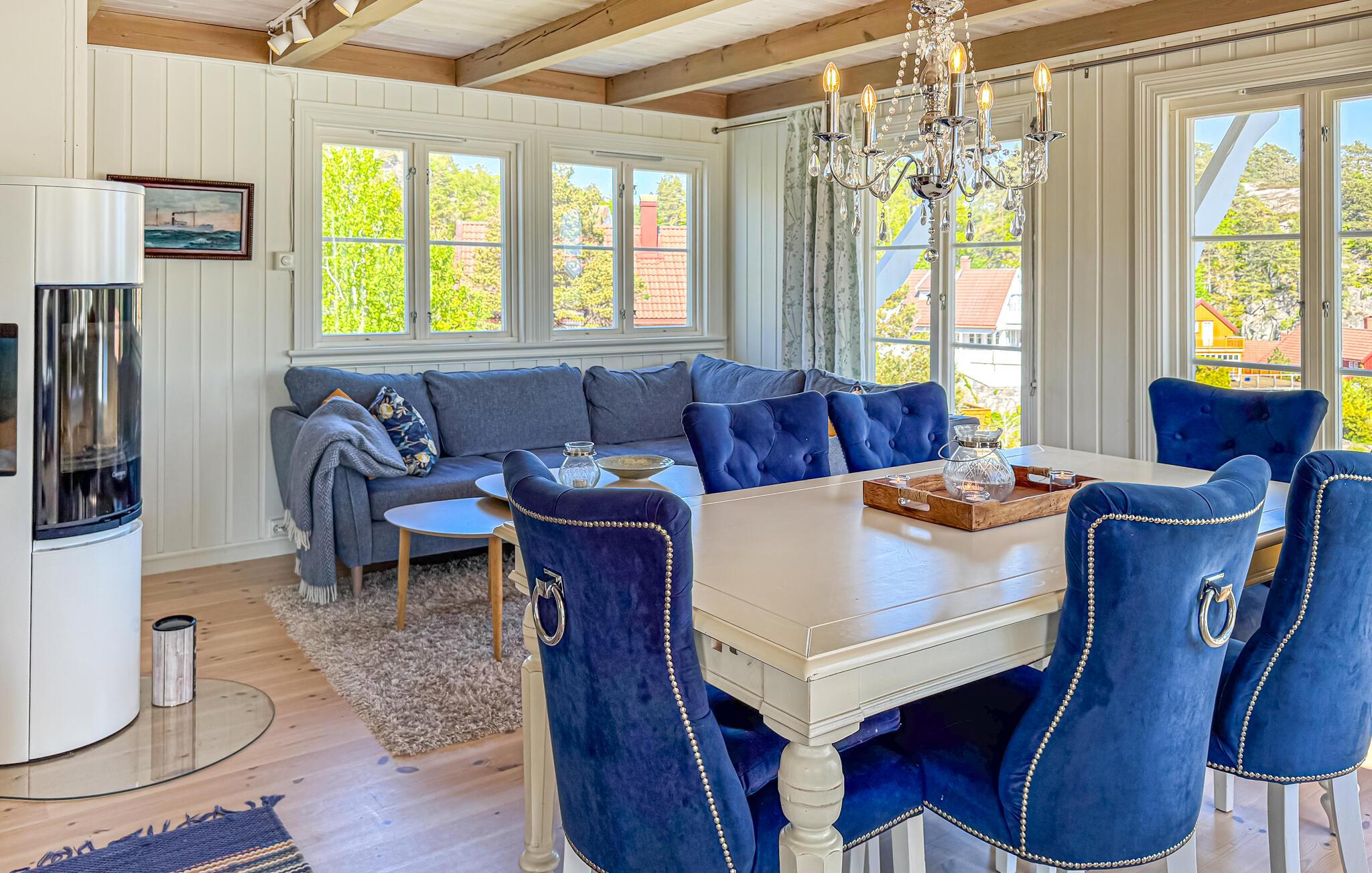 Tilbring en afslappende ferie i dette lyse og smagfulde feriehus, beliggende på en bjergskråning med en storslået udsigt over vandet. Den høje beliggenhed tilbyder ikke kun fred og ro, men også en imponerende udsigt over det typiske norske kystlandskab. Nyd afslappende timer i den rummelige opholdsstue med hjørnesofa og pejs i stilfulde omgivelser med masser af naturskønt lys. Lav mad sammen i det elegante køkken med en smuk udsigt eller nyd dagens måltider i den indbydende spisestue med komfortable polstrede stole og en lysekrone. Små opholdsstuer med lænestole og gulv-til-loft-vinduer inviterer jer også til hyggestunder.