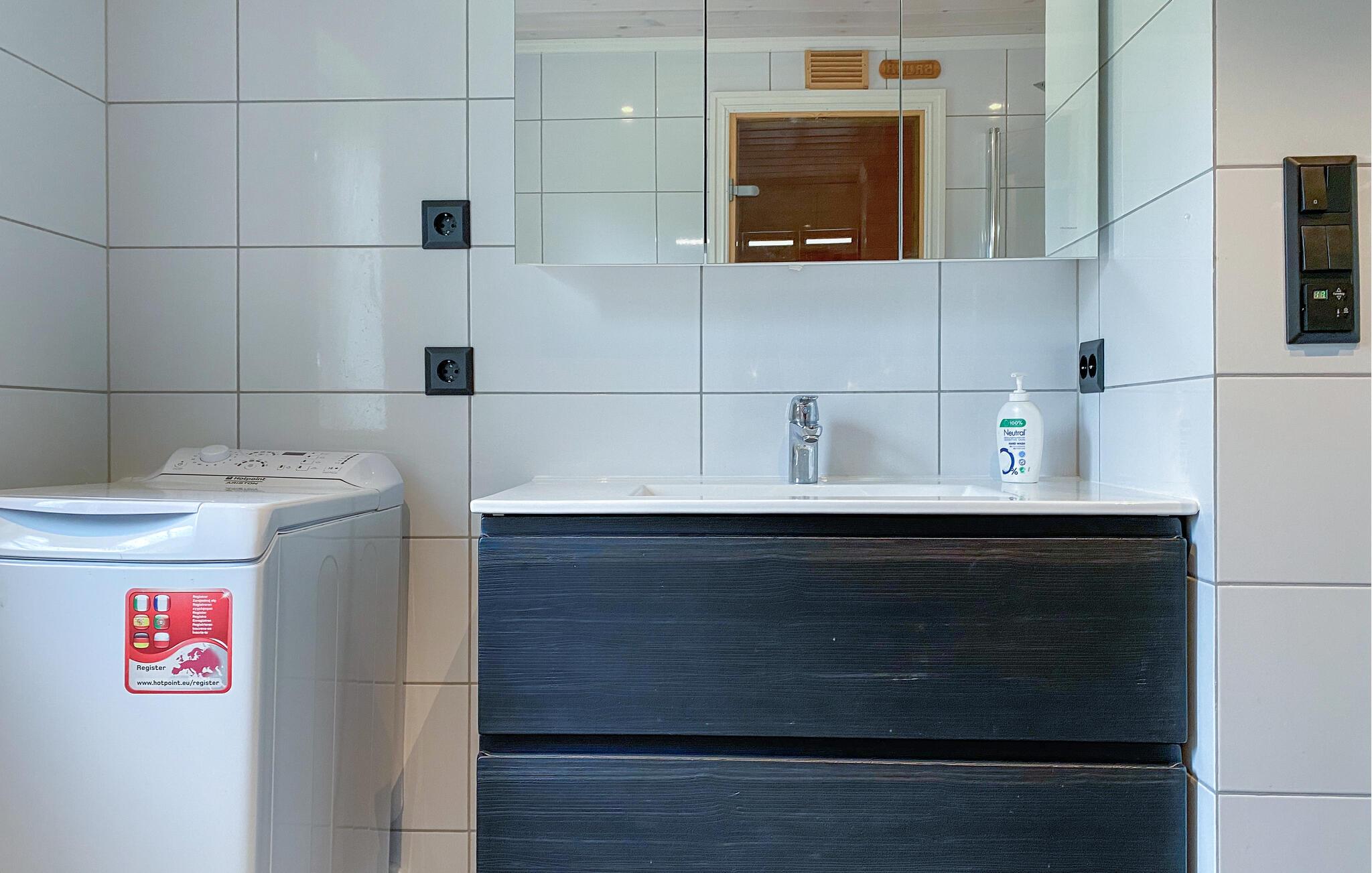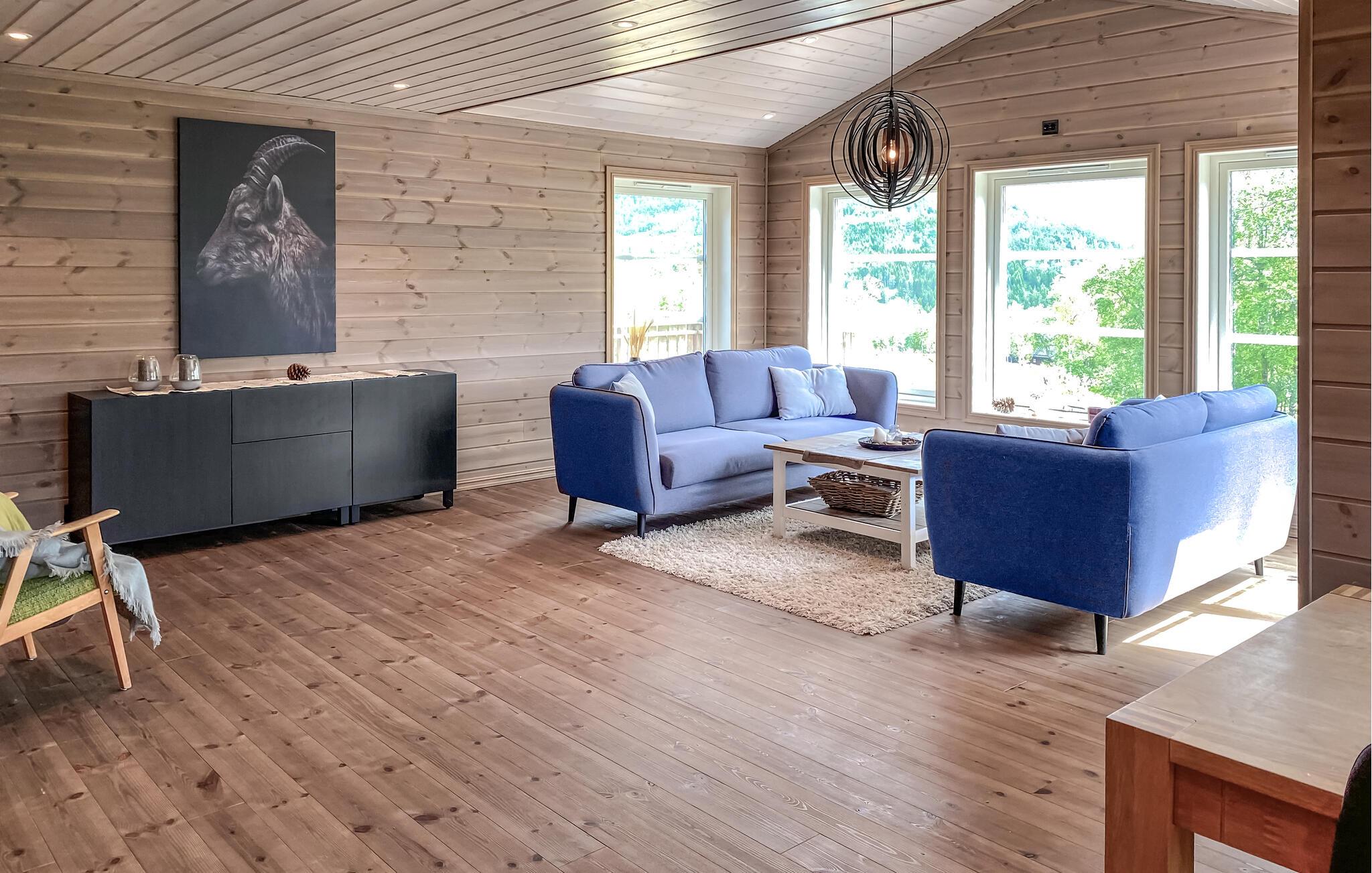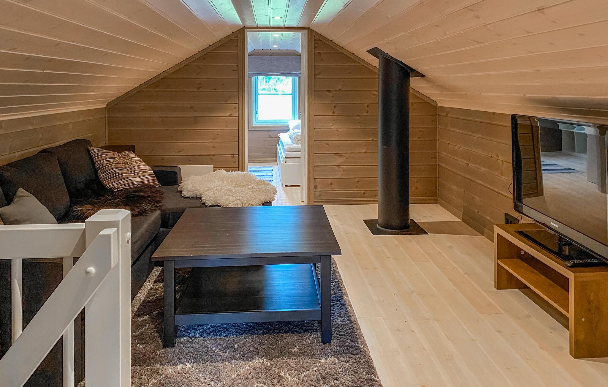 I dette hyggelige hus finder I hurtigt fred og ro og kan nyde en afslappende pause fra hverdagen. Store vinduer lukker masser af naturligt lys ind i stuerne, mens komfortable sofaer omkring et sofabord skaber en hyggelig atmosfære. Slap af her med en god bog eller et glas vin, og varm jer op på kølige dage i saunaen eller ved pejsen.