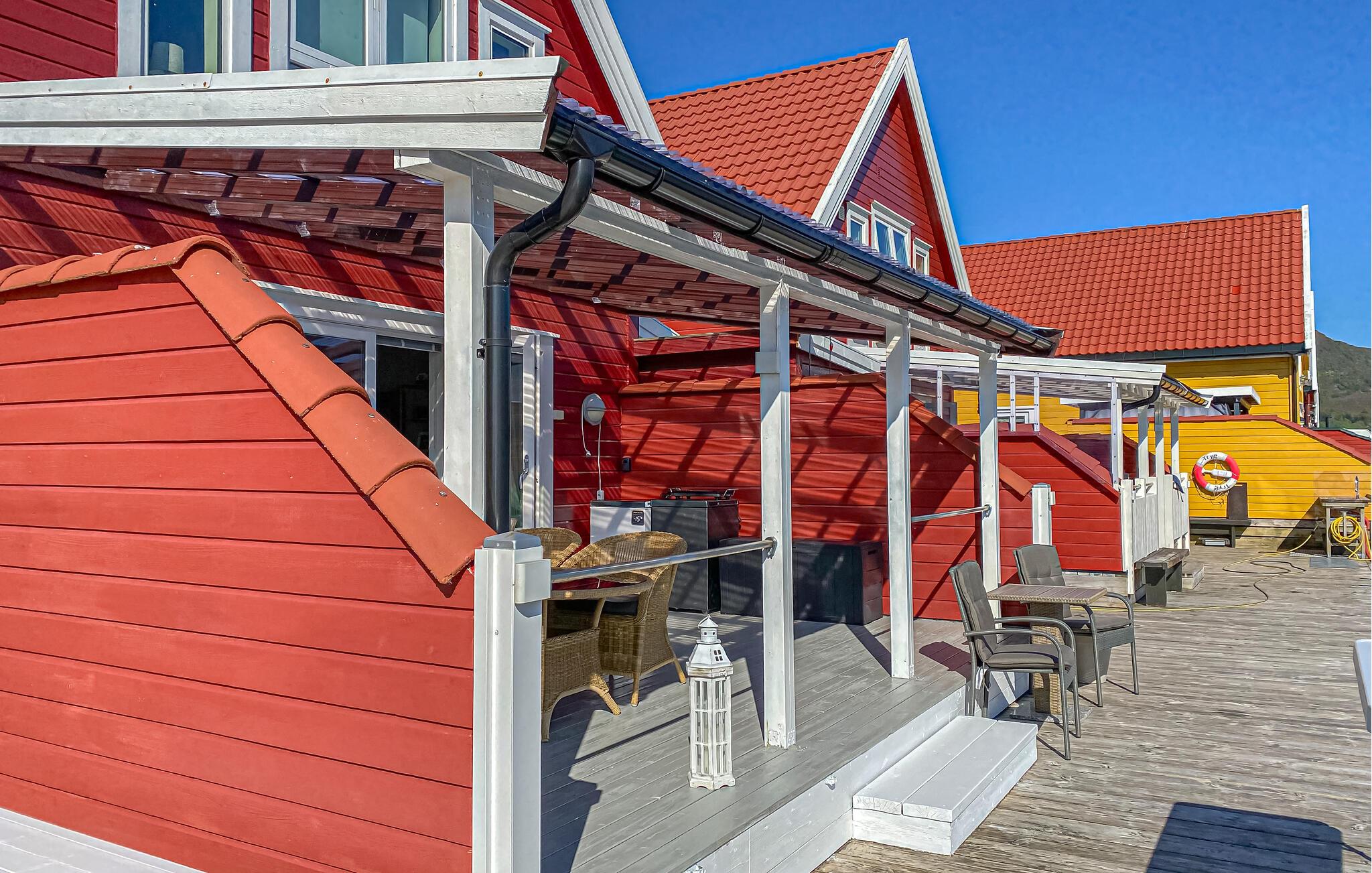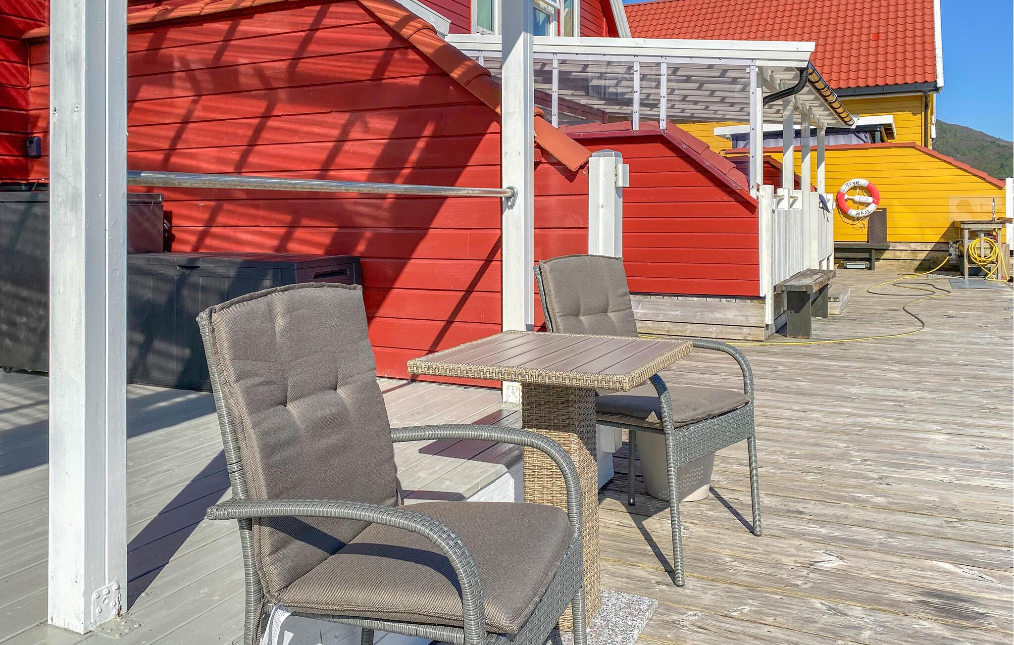 Tilbring tid på den overdækkede terrasse med dens komfortable siddeområde. Spis morgenmad udenfor eller afslut dagen med udsigt over fjorden. Den store træplatform med en bro fører direkte til vandet, ideel til fiskeri, solbadning eller blot afslapning.