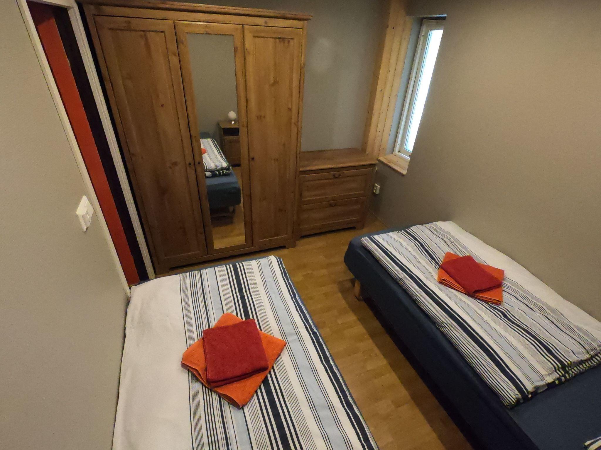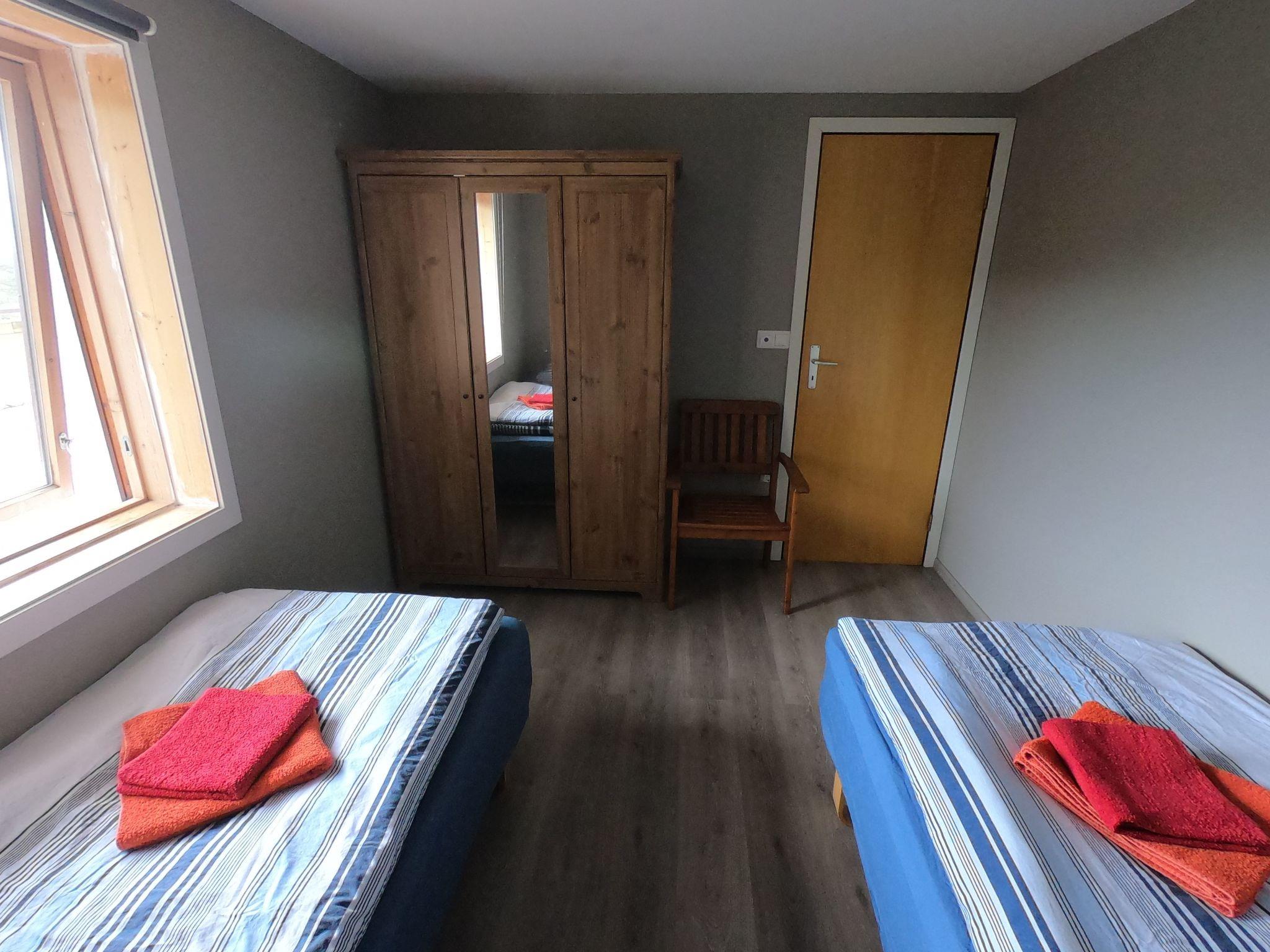 The ground floor, about 65m2, consists of a living room in Norwegian style, with a couch, 4 armchairs, a table, SAT TV German, CD, DVD and an open fireplace, a new fully equipped kitchen with cooker, oven, dishwasher, coffee maker, kettle, combi fridge and cutlery / crockery, a bathroom with shower, sink, mirror cabinet and a washing machine, two bedrooms with wardrobe and two single beds each, which can also be put together. There is also an extra bathroom with toilet and washbasin. The bathrooms, bedrooms and entrance hall are fitted with underfloor heating. In the entrance area there is a heated landing for drying shoes.