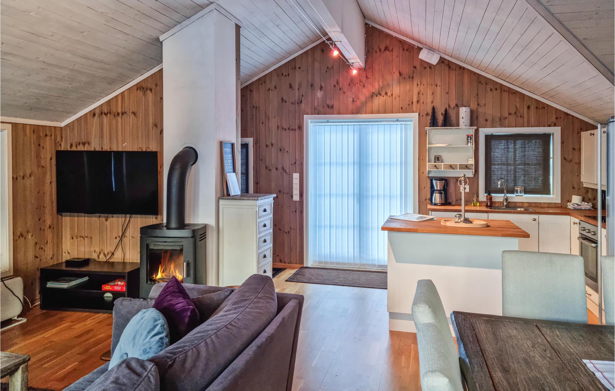 Mellem skisport, vandreture og udflugter tilbyder feriehuset dejlige rum og behagelige møbler til afslapning. Trævægge- og lofter skaber en hyggelig atmosfære. Om aftenen kan I tænde op i brændeovnen og se fjernsyn, mens flammerne knitrer. Til huset hører en terrasse, hvor I kan sidde og drikke en varm kop kaffe, mens I nyder udsigten til bjerge og fjelde. I har også en grill til rådighed, hvis I fx ønsker at grille friskfanget fisk.