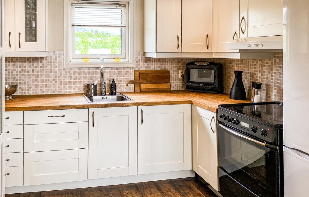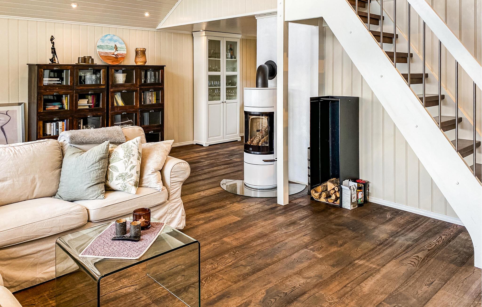 Dette smukt møblerede hus byder jer velkommen med et lyst interiør, der kombinerer hygge og elegance. Husets hjerte er den rummelige stue med komfortable sofaer, en norsk brændeovn og store vinduer med udsigt over den omkringliggende natur. Genoplad batterierne, mens I læser eller lytter til musik, eller tilbered jeres yndlingsmåltider i det moderne landkøkken, inden I samles til en filmaften.
