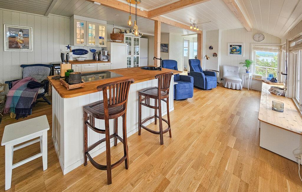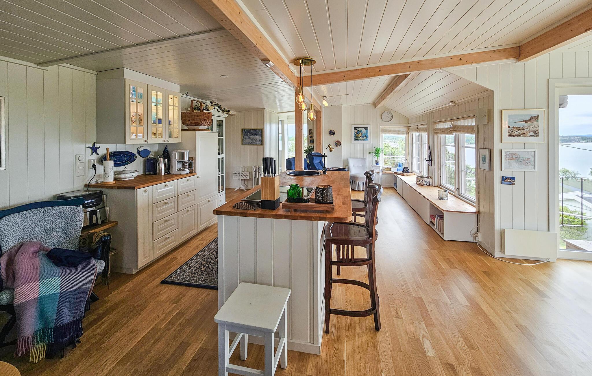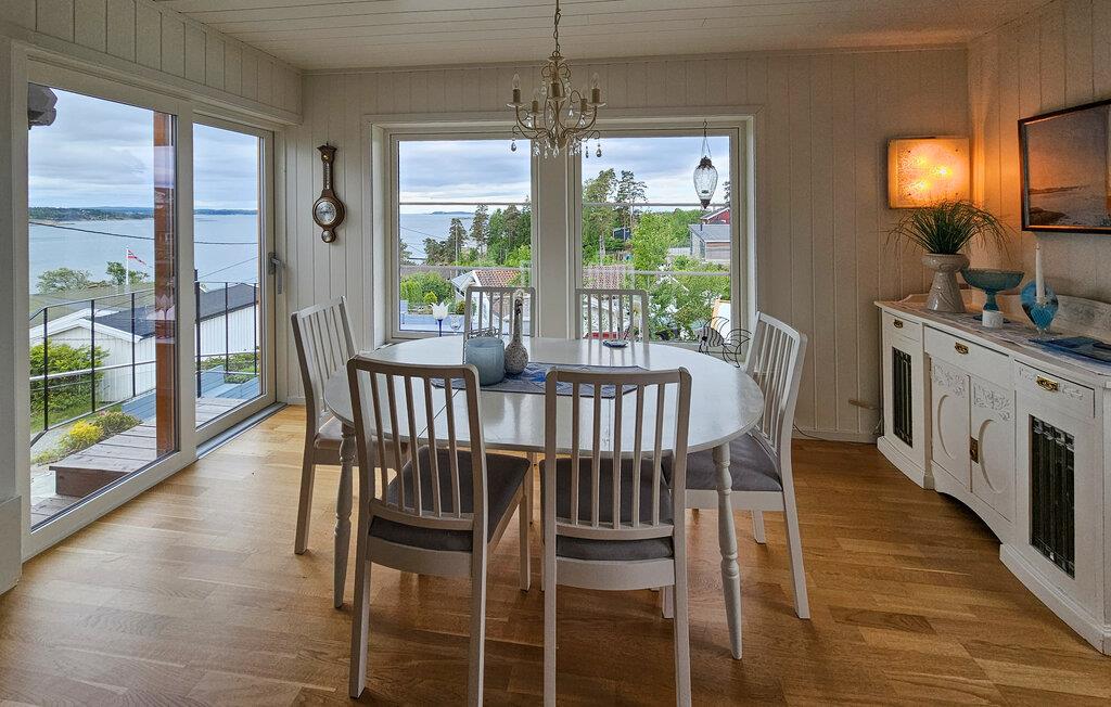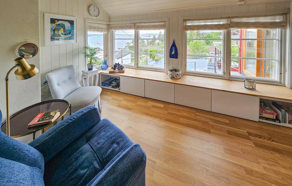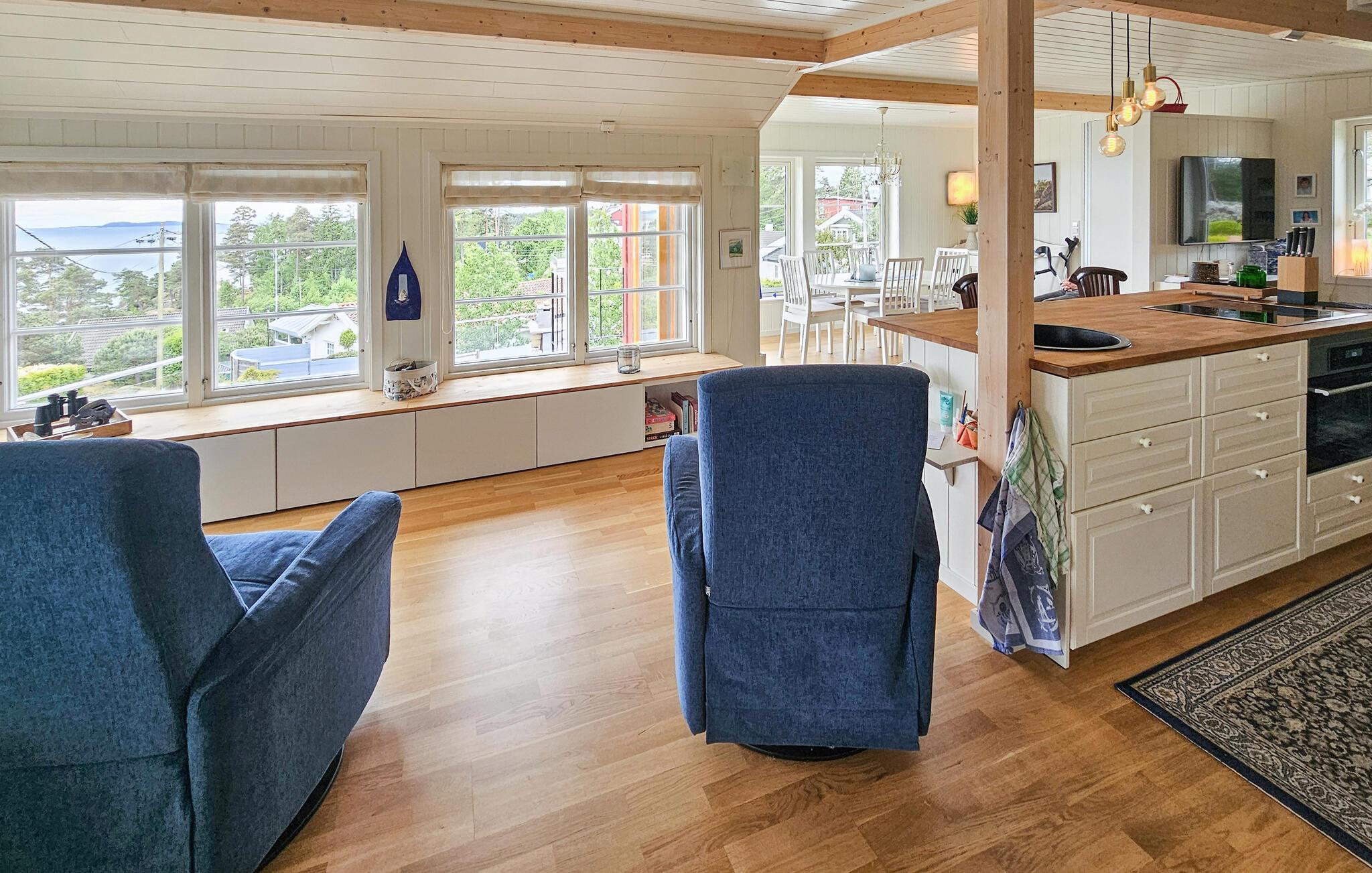 Oplev dette charmerende feriehus, der tilbyder afslapning, komfort og en fantastisk udsigt. Huset ligger i et klassisk sommerferiested lige ud til Oslofjorden, som er kendt for sine strande, klipper og rekreative muligheder. Find jer til rette i det lyse, flot designede interiør. Den åbne stue med sofa, lænestol, tv og bogreoler lægger op til at slappe af. Nyd den lyse atmosfære, de ??store vinduer giver en konstant udsigt over vandet, selv indendørs. Lav mad i det smukke, åbne køkken med køkkenø, barstole og direkte adgang til spiseområdet med havudsigt.