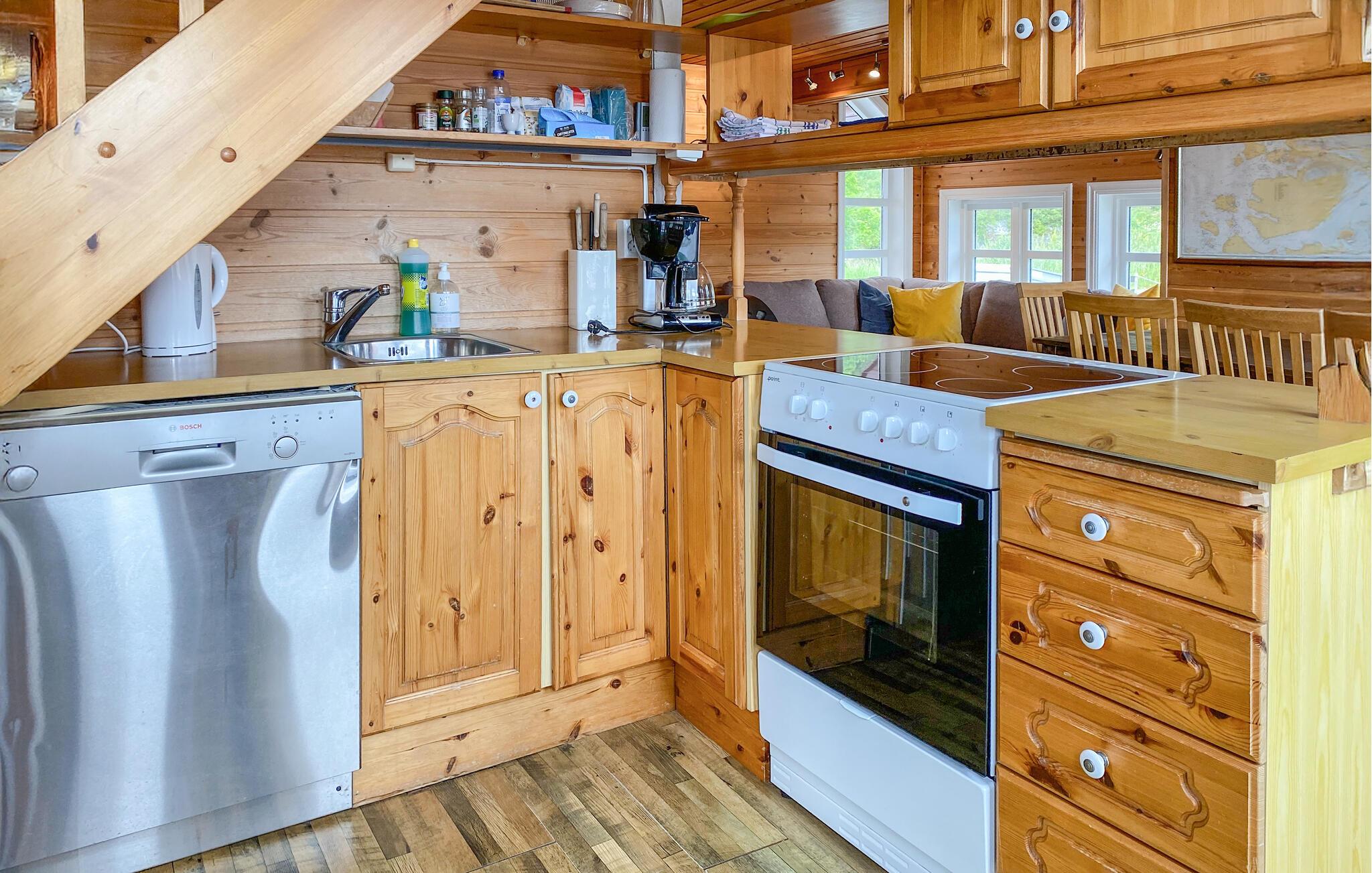 Nyd jeres ferie i dette hyggelige feriehus, der kombinerer norsk livsstil med maritim ro. Her bor I lige ved vandet – omgivet af imponerende natur, klar luft og bølgernes beroligende lyd. Husets interiør er fuldstændig beklædt med lyst træ og udstråler en varm og hjemlig atmosfære. Slap af i den hyggelige opholdsstue med et komfortabelt sofahjørne, store vinduer og udsigt over vandet. Tilbered jeres måltider i det praktiske køkken med rustikke træmøbler. Brændeovnen sørger for hyggelig varme på køligere dage.