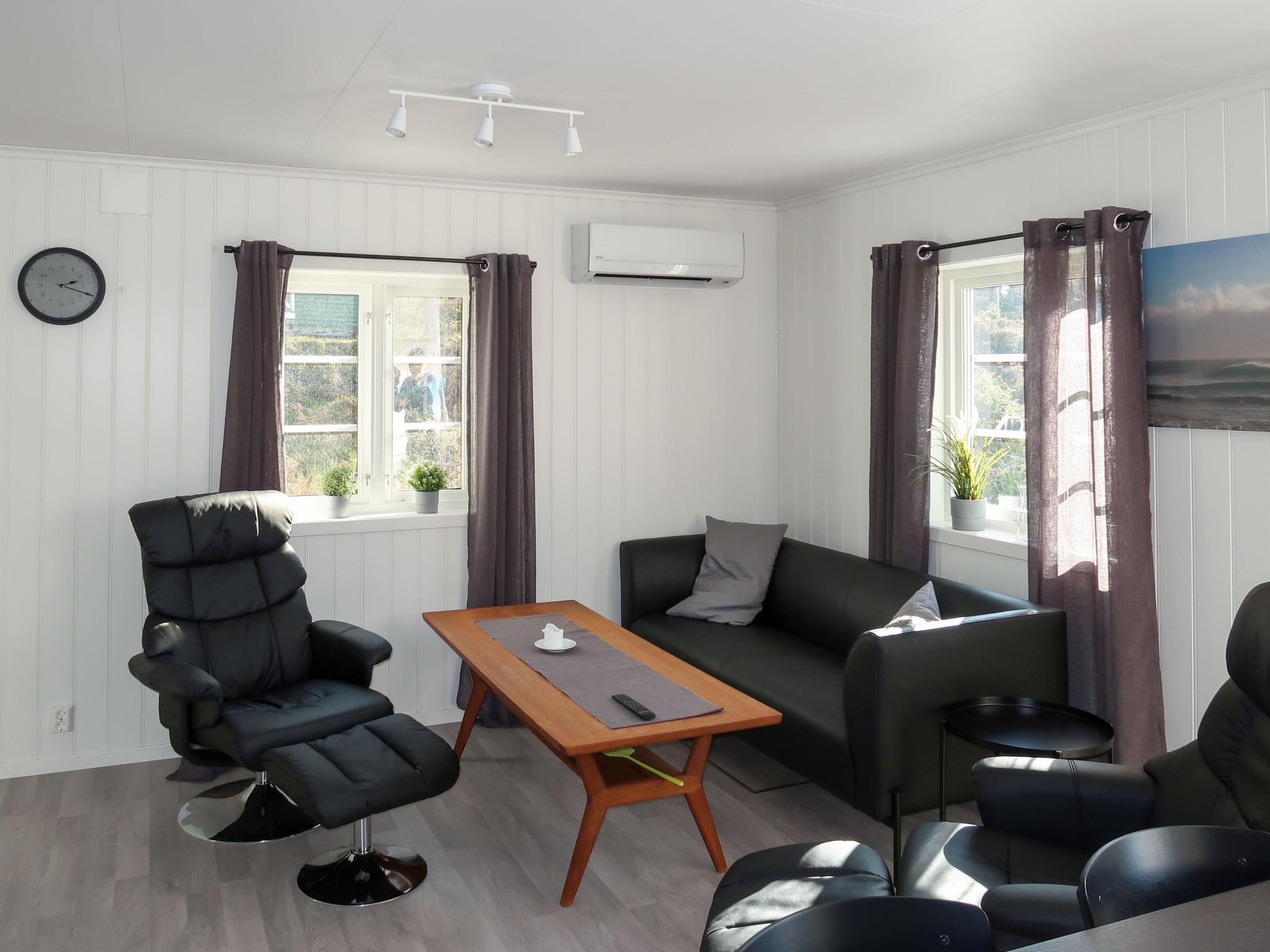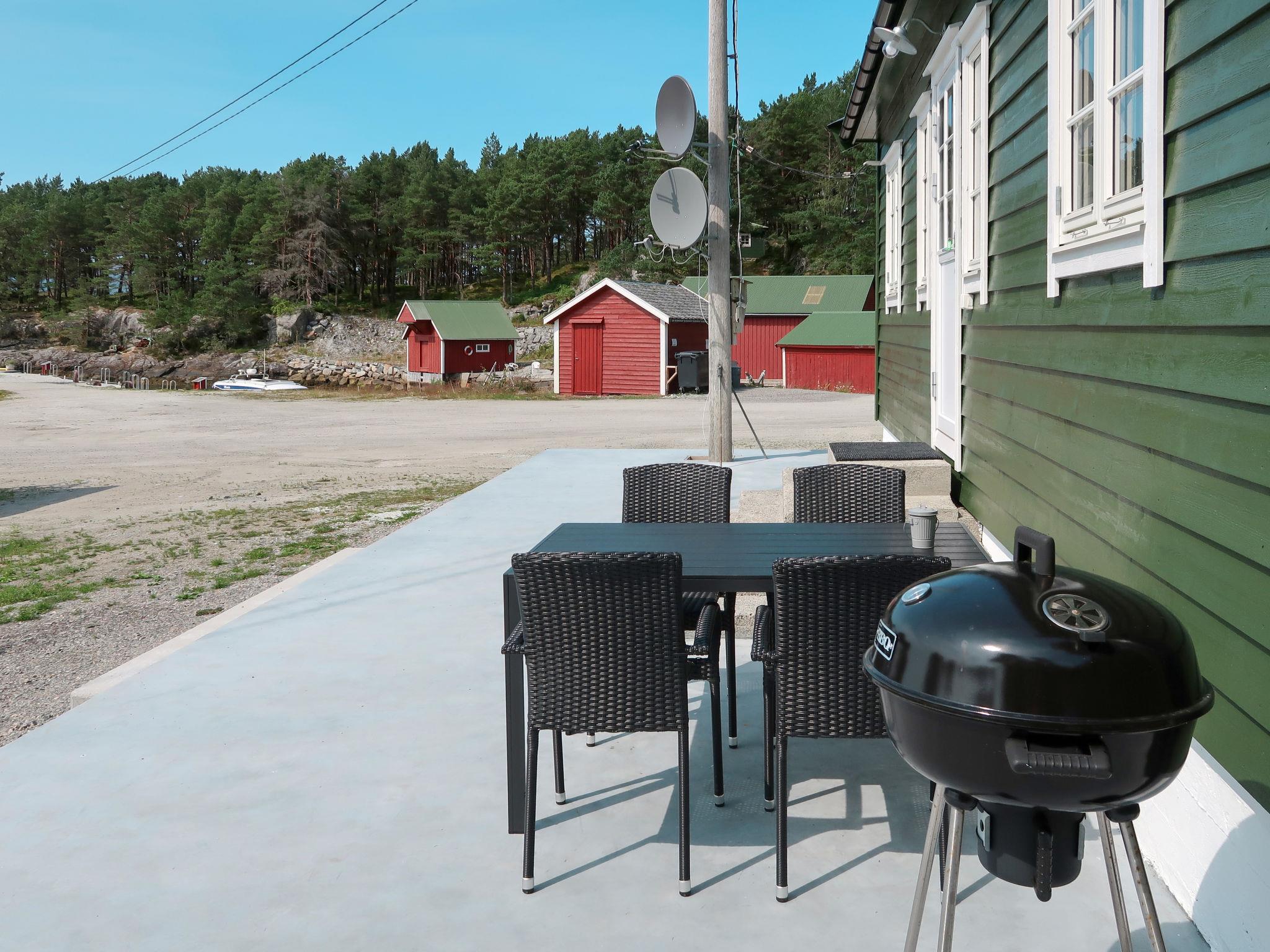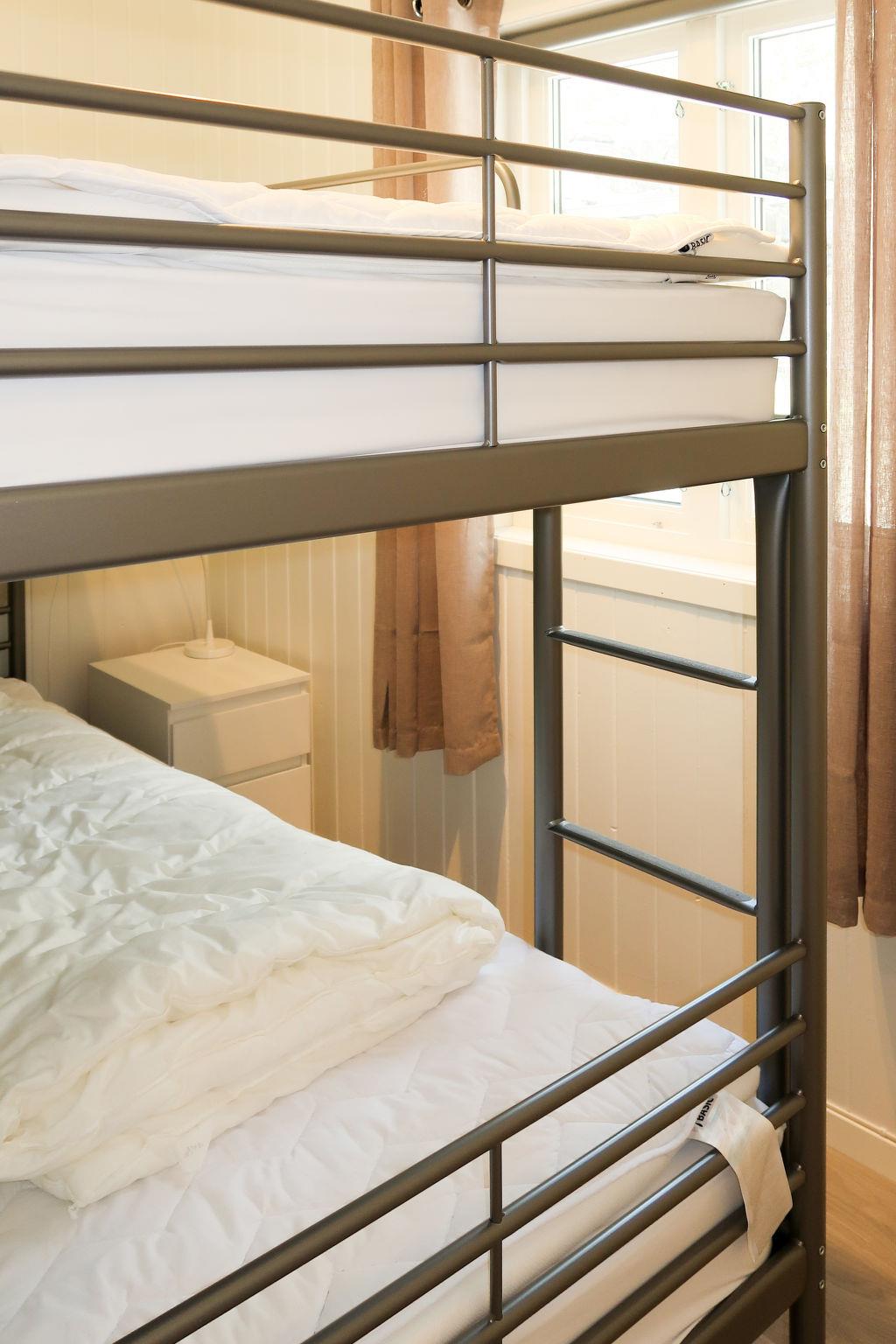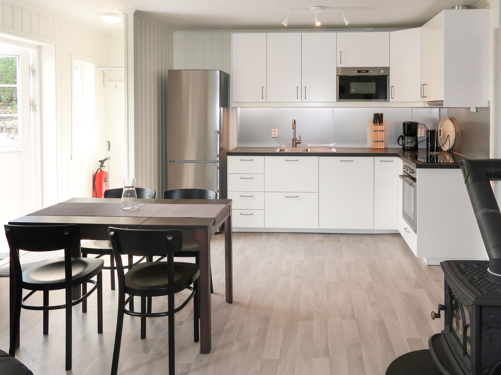 "Nesholmen", 3-room house 48 m2. Bright, renovated in 2019, tasteful and cosy furnishings: living/dining room with Scandinavian wood stove, dining table, satellite TV and international TV channels. Exit to the terrace. 1 room with 1 x 2 bunk beds (90 cm, length 200 cm). 1 room with 2 beds (90 cm, length 200 cm). Open kitchen (oven, dishwasher, 4 induction hot plates, toaster, kettle, microwave, freezer, electric coffee machine). Shower/WC. Forced-air heating. Parquet floors. Terrace 50 m2. Terrace furniture, barbecue (portable). View of the sea and fjord. Facilities: washing machine, children's high chair, baby cot. Internet (WiFi, extra). Please note: non-smoking house. Maximum 1 pet/ dog allowed. Smoke alarm, fire extinguisher. Lockable freezer (approx. 300 l) in the common area. VISA/MASTERCARD OK. 924531169
