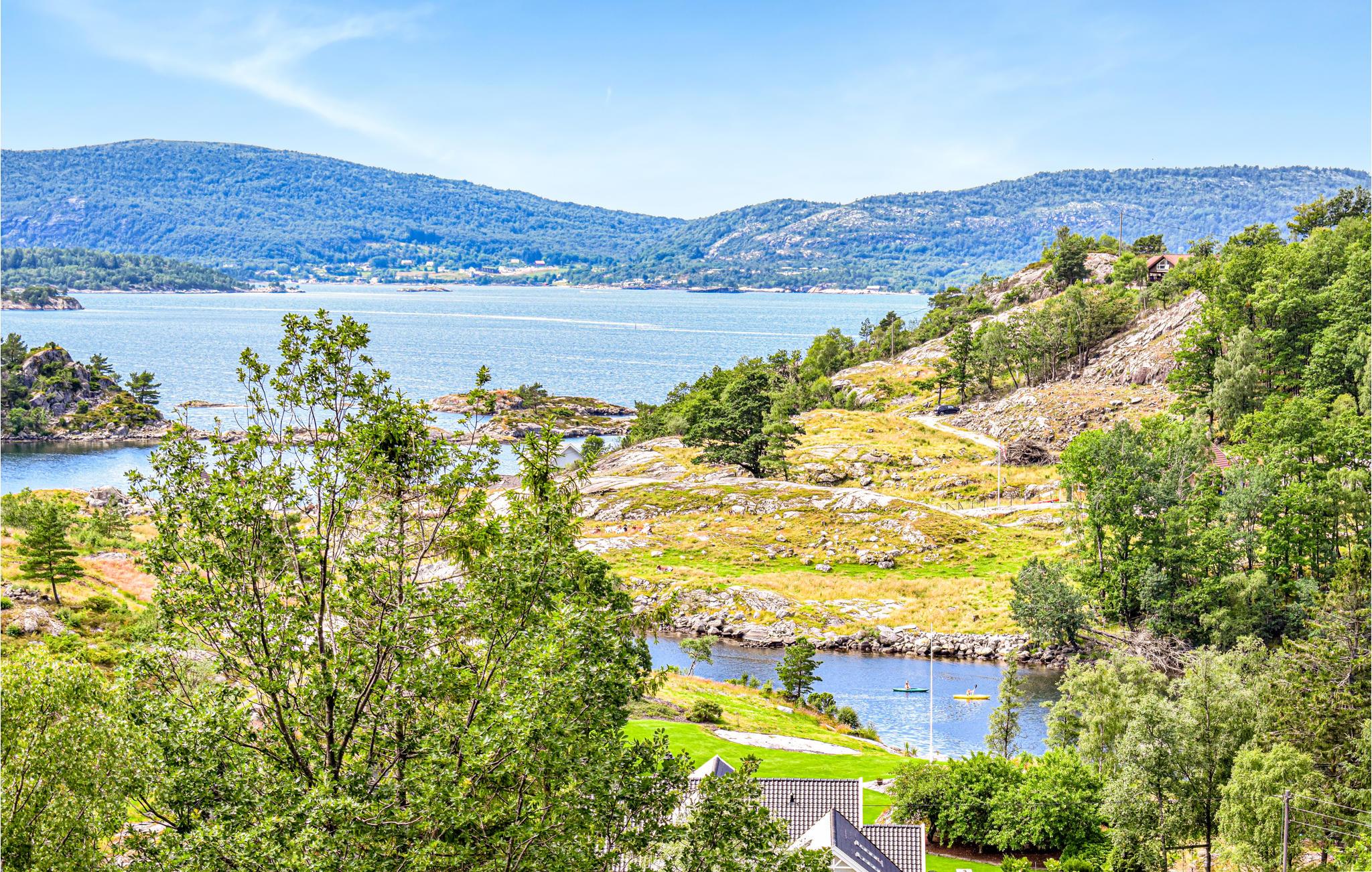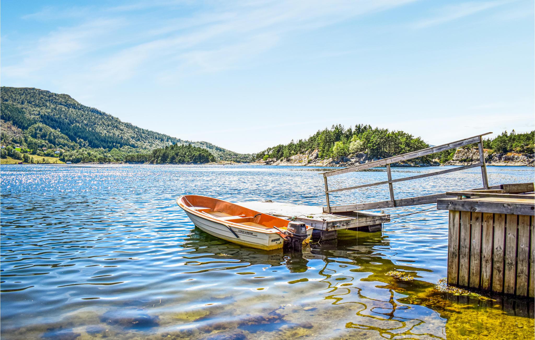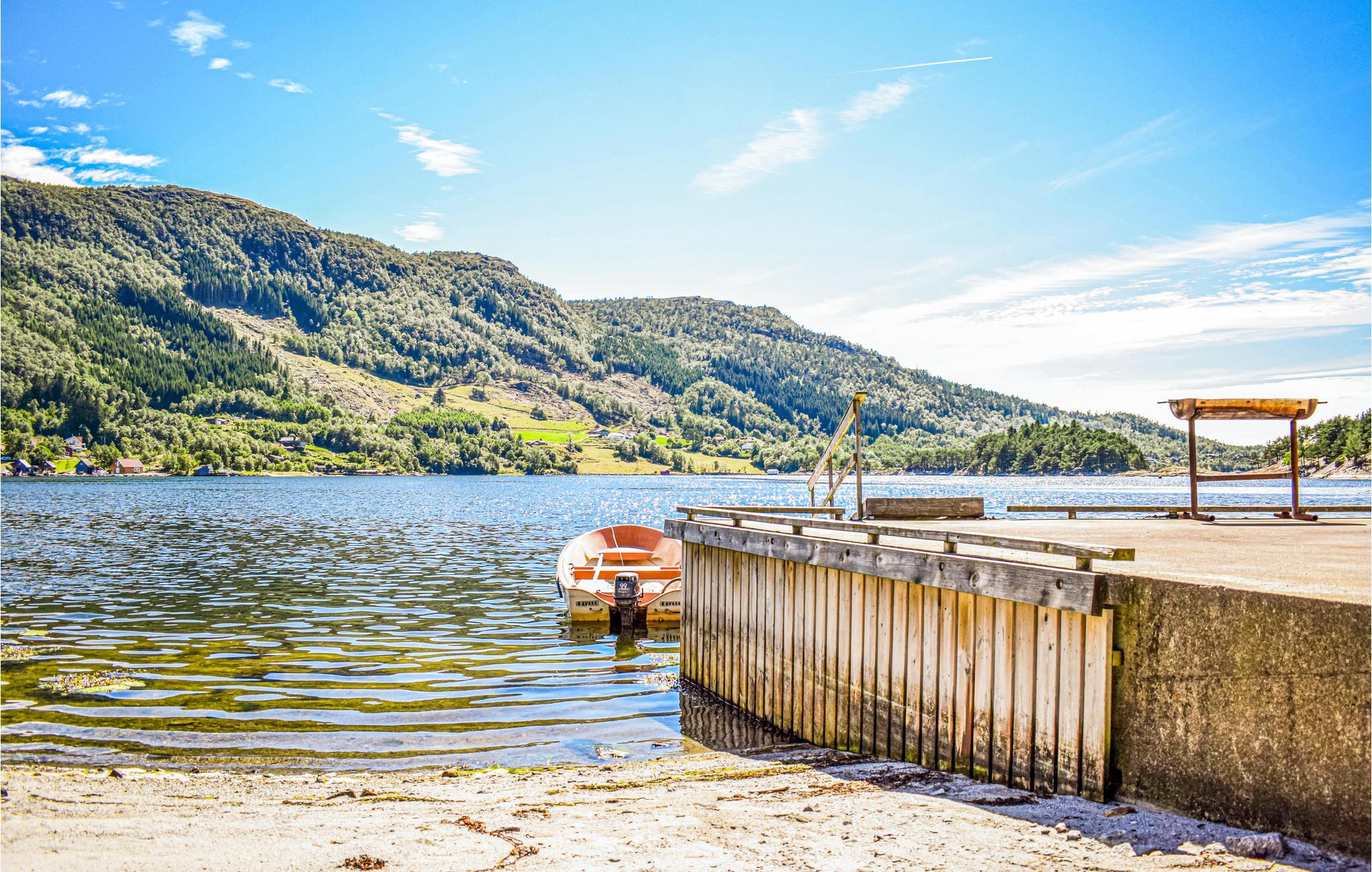 Fra sommerhuset er der kun en kort gåtur ned til en lille sandstrand og flydende mole, som ligger i dejlige omgivelser. Hvis du vil ud på fjorden, er det muligt at leje en båd. Så anbefales det at prøve lykken med at fiske for at sikre dagens fiskemiddag.