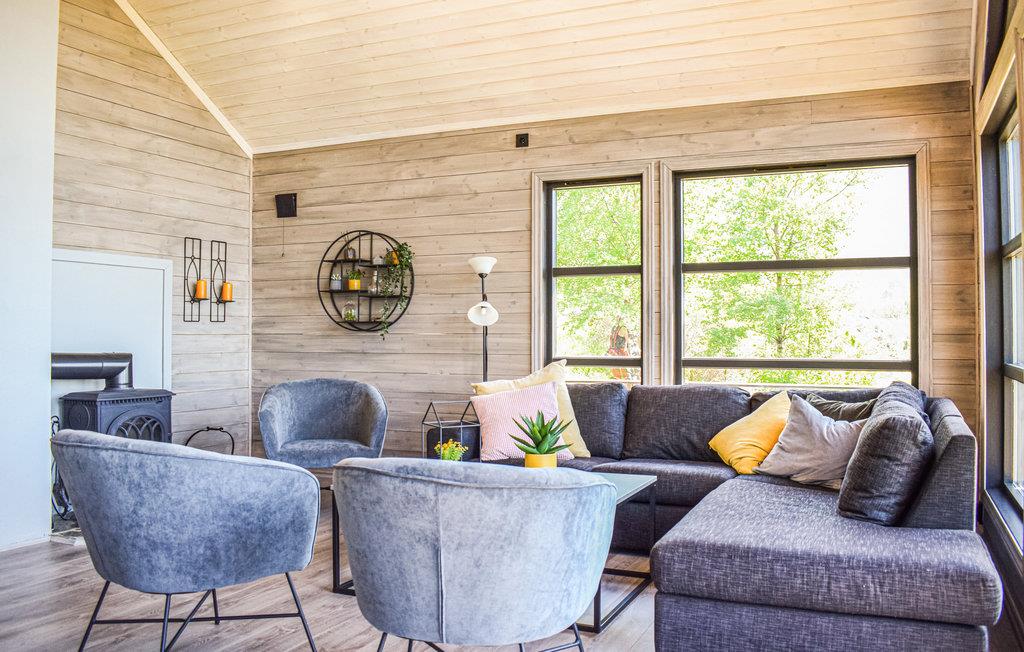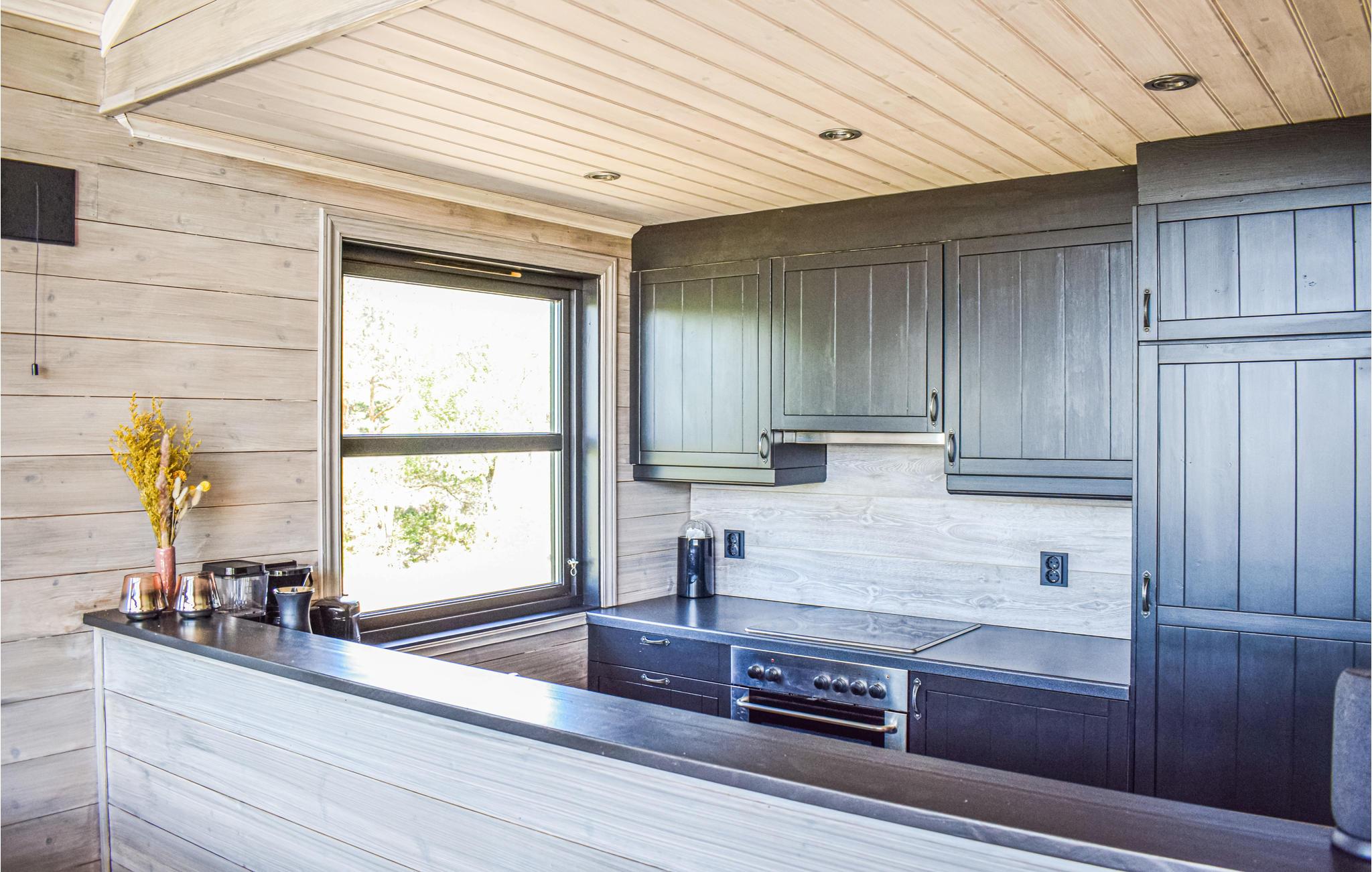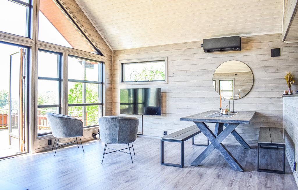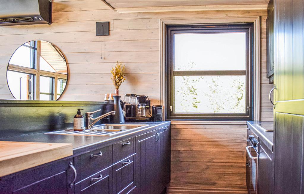 Denne hyggelige hytte har en luftig og åben løsning og store vinduer, der lader masser af lys komme ind udefra. Hytten har et åbent køkken ud mod soiseområdet, så det er rart at være en del af samtalen omkring bordet, mens nogen forbereder aftenens middag. Fra de store vinduer kan du nyde den vidunderlige udsigt over fjorden.