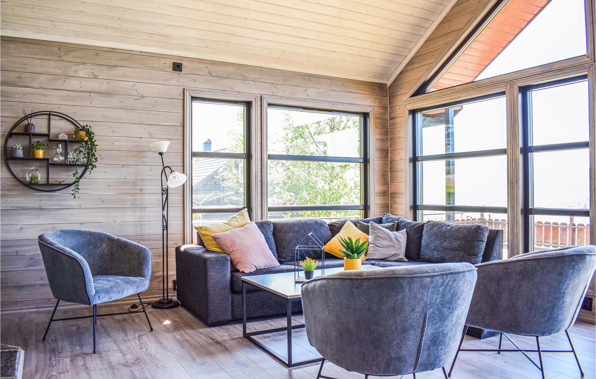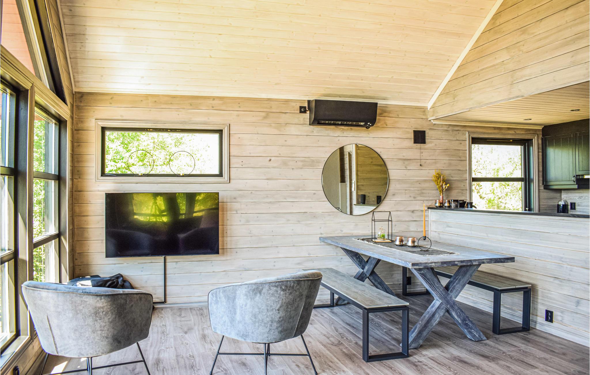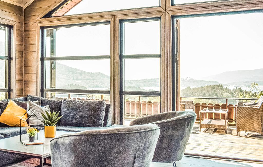 Denne hyggelige hytte har en luftig og åben løsning og store vinduer, der lader masser af lys komme ind udefra. Hytten har et åbent køkken ud mod soiseområdet, så det er rart at være en del af samtalen omkring bordet, mens nogen forbereder aftenens middag. Fra de store vinduer kan du nyde den vidunderlige udsigt over fjorden.