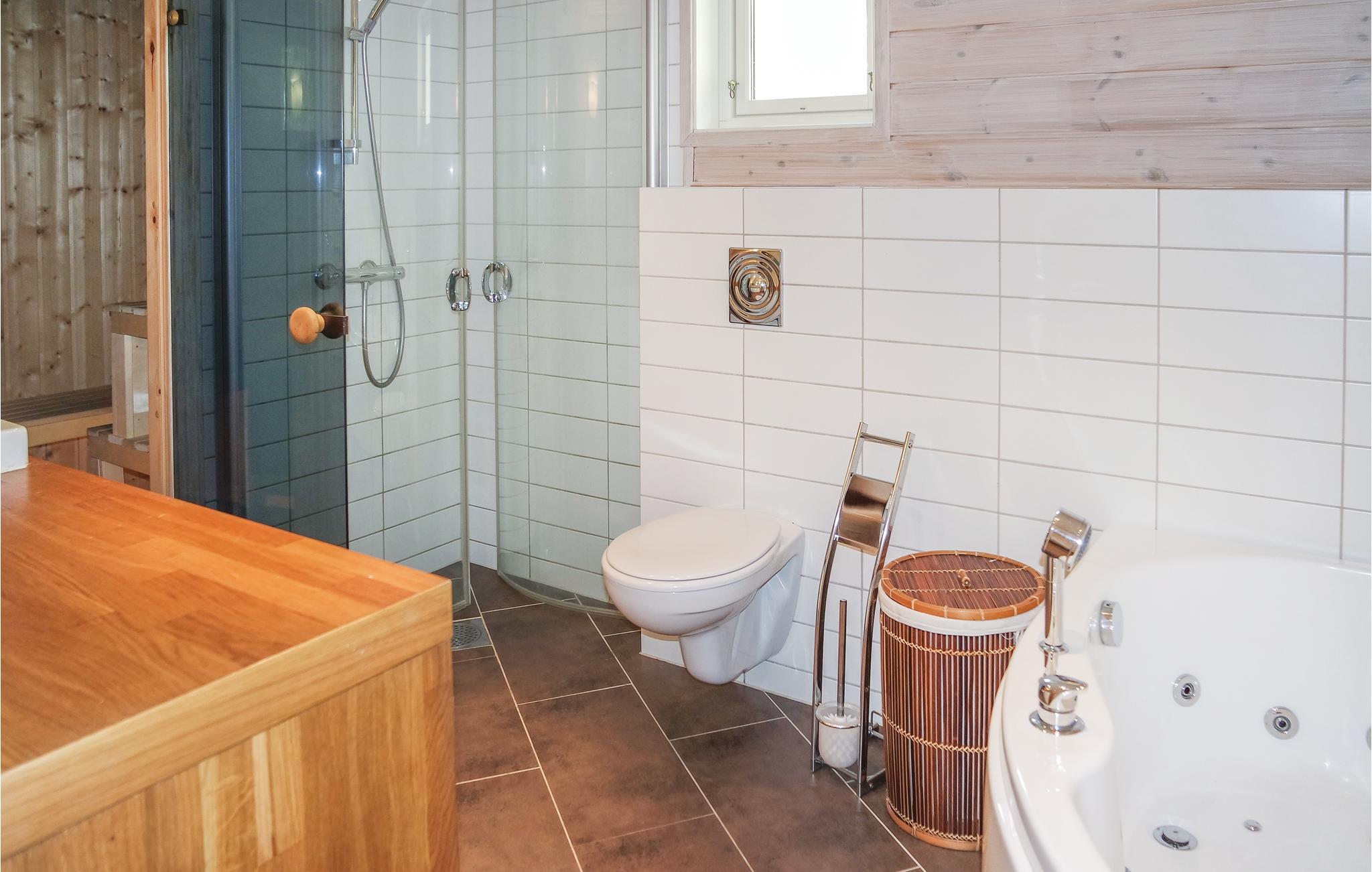 Beliggende i det idylliske bjerglandskab byder dette rummelige træhus jer velkommen og tilbyder hyggelige værelser med træpaneler. Tilbered et solidt måltid i det moderne, åbne køkken og nyd det sammen ved det lange spisebord med panoramaudsigt. Tænd pejsen og gør jer godt tilpas på det hyggelige sofaområde, forkæl jer selv med et bad i spabadet eller slap af i saunaen, mens børnene hygger sig i det hyggelige læsehjørne.
