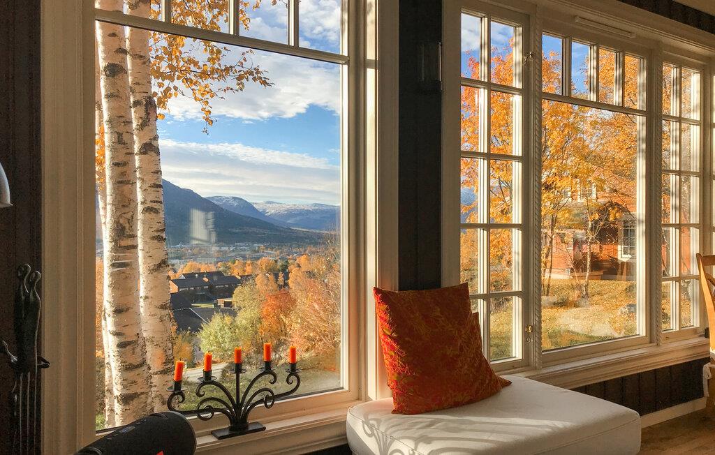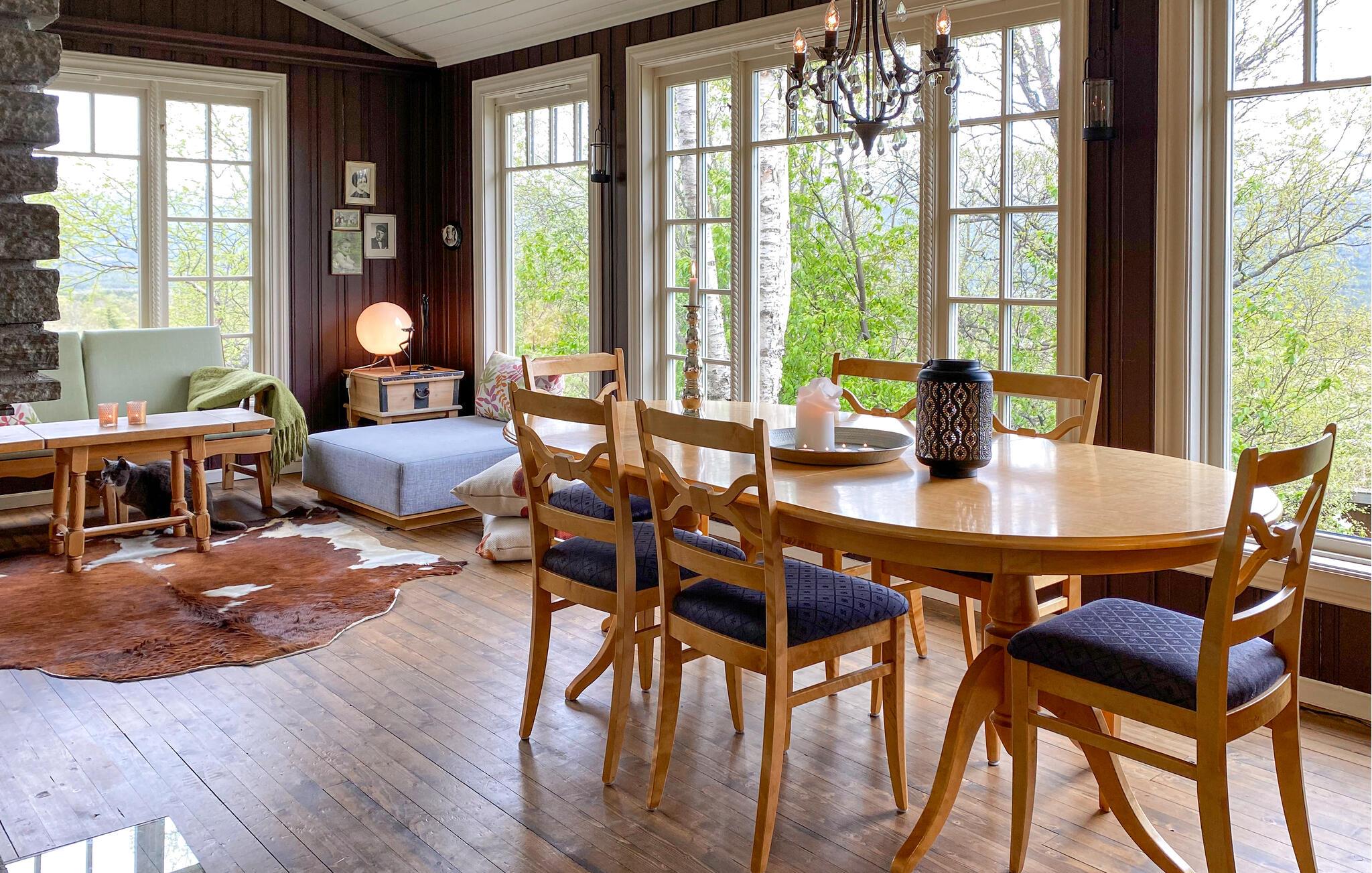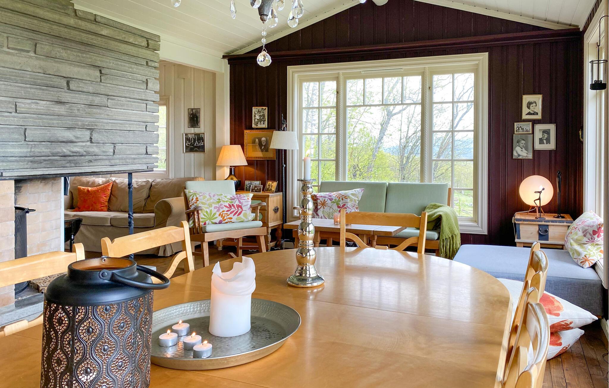 Denne hyggelige bjerghytte lægger op til at forlade hverdagen og opleve naturens ro. Huset ligger højt og har en smuk panoramaudsigt med fantastiske omgivelser til afslappende dage blandt bjerge, skov og himmel året rundt. Slap af i den varme opholdsstue med store vinduer med udsigt over dalen og bjerglandskabet. Slap af i sofaen eller læs en bog ved pejsen, hvilket skaber en hyggelig atmosfære. Køkkenet er traditionelt indrettet og praktisk møbleret. Nyd hvert måltid sammen ved det runde spisebord med udsigt til naturen.