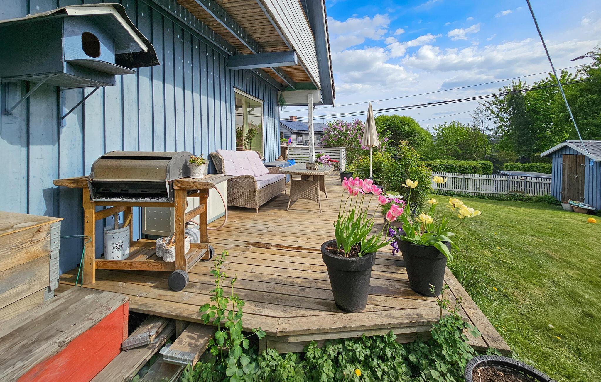 I den solrige, indhegnede have kan børnene lege i den friske luft til deres hjertens lyst. Server en solid morgenmad udendørs og nyd jeres tid sammen med stemningsfulde grillmiddag.