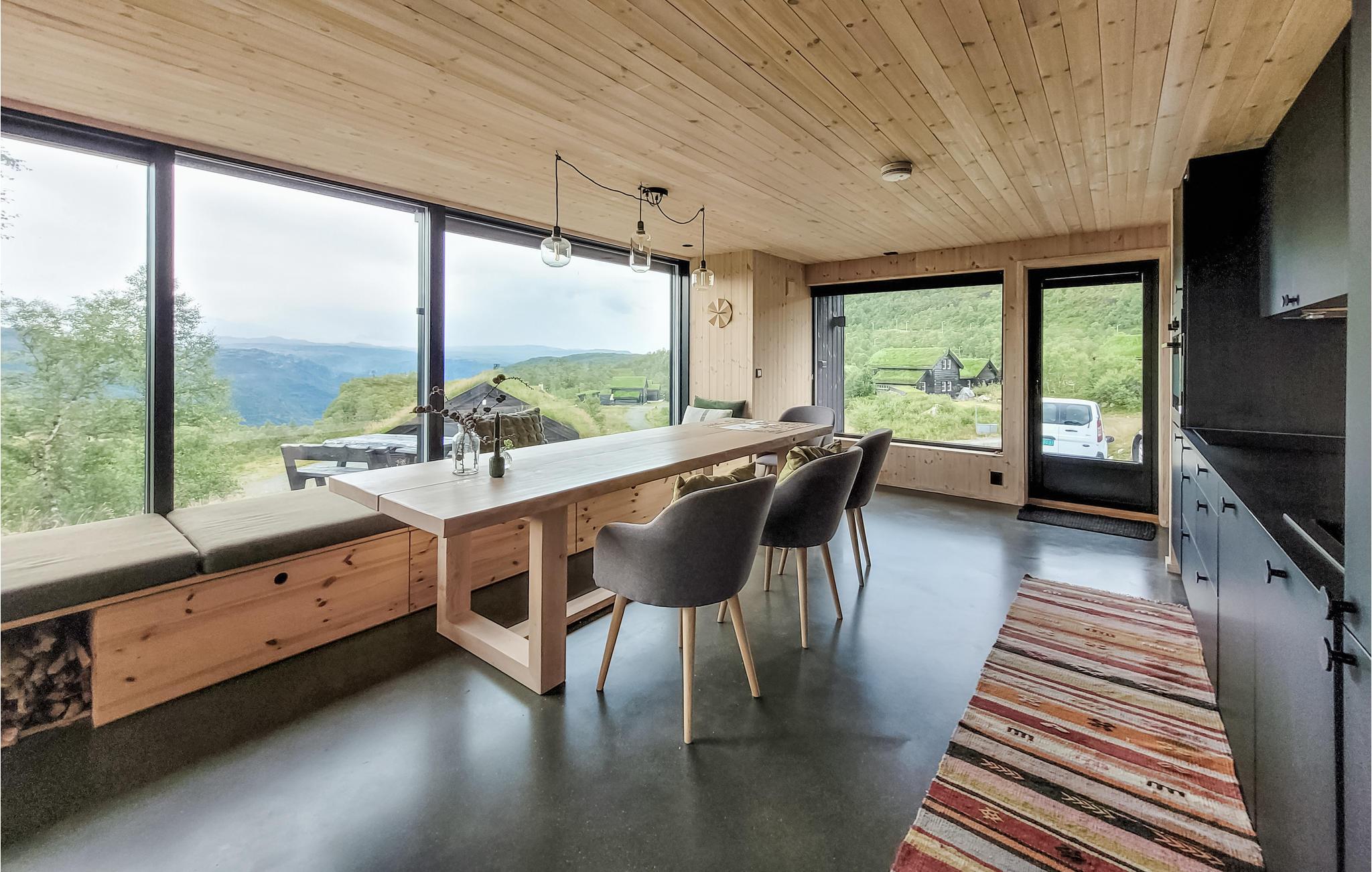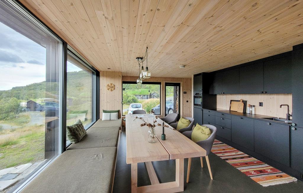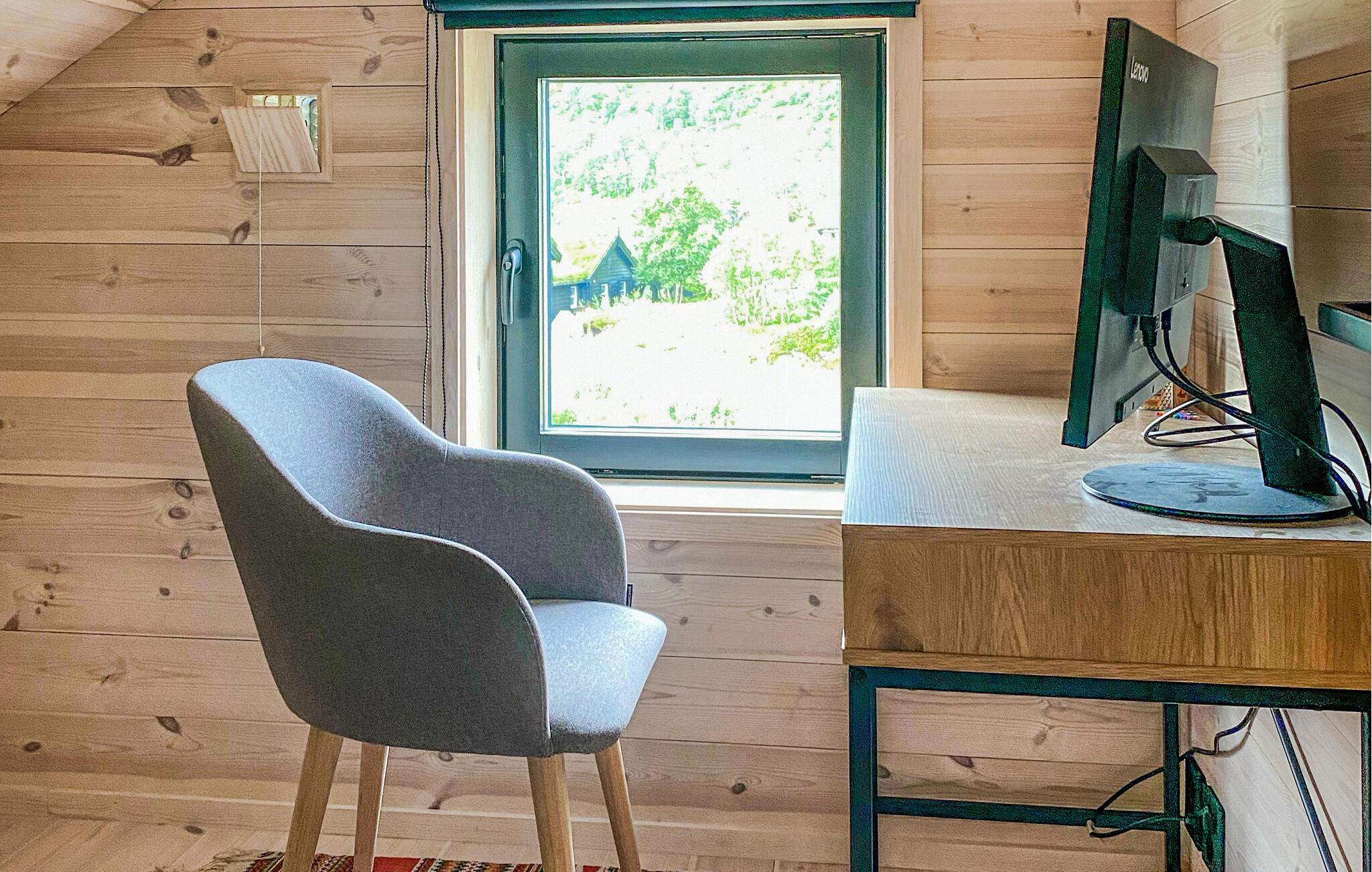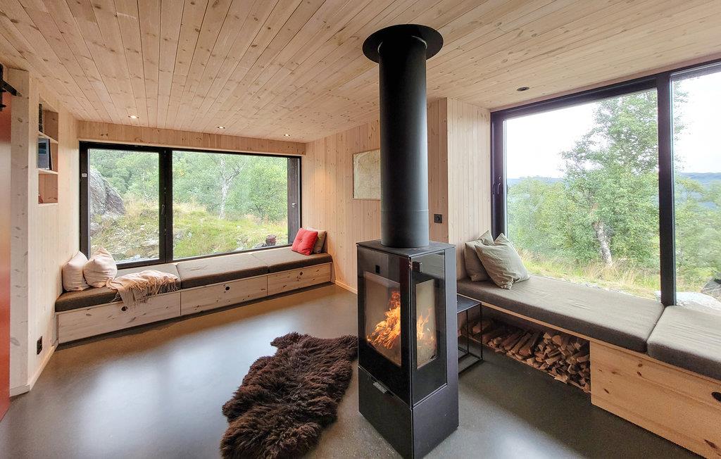 Moderne, rustik og minimalistisk. Det er tre ord, der bedst beskriver denne dejlige feriehytte. Det første, I vil bemærke, er panoramavinduerne og den atypiske indretning, som giver huset sin helt egen unikke charme. Her kan I forberede en lækker morgenmad sammen og nyde den smukke udsigt over området med morgenkaffen i hånden. De store glaspartier gør, at I nærmest føler jer udenfor, når I stidder i stuen. Om aftenen kan I finde jer behageligt til rette med gode brætspil, mens brændeovnen giver jer både hygge og varme i de kolde måneder. I sommermånederne kan I nyde jeres måltider på terrassen med bålplads. I kan bade i en dam tæt på hytten. Om vinteren kan I se frem til langrendsløjperne, der starter lige ved huset.