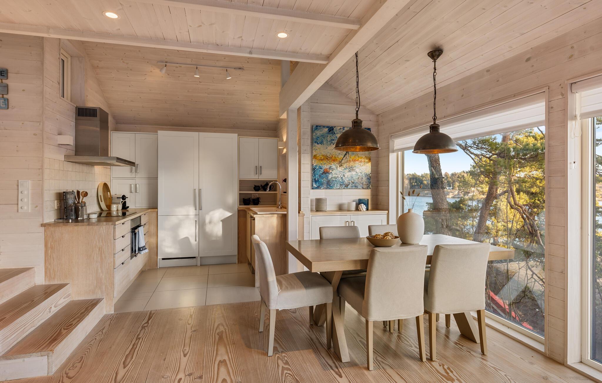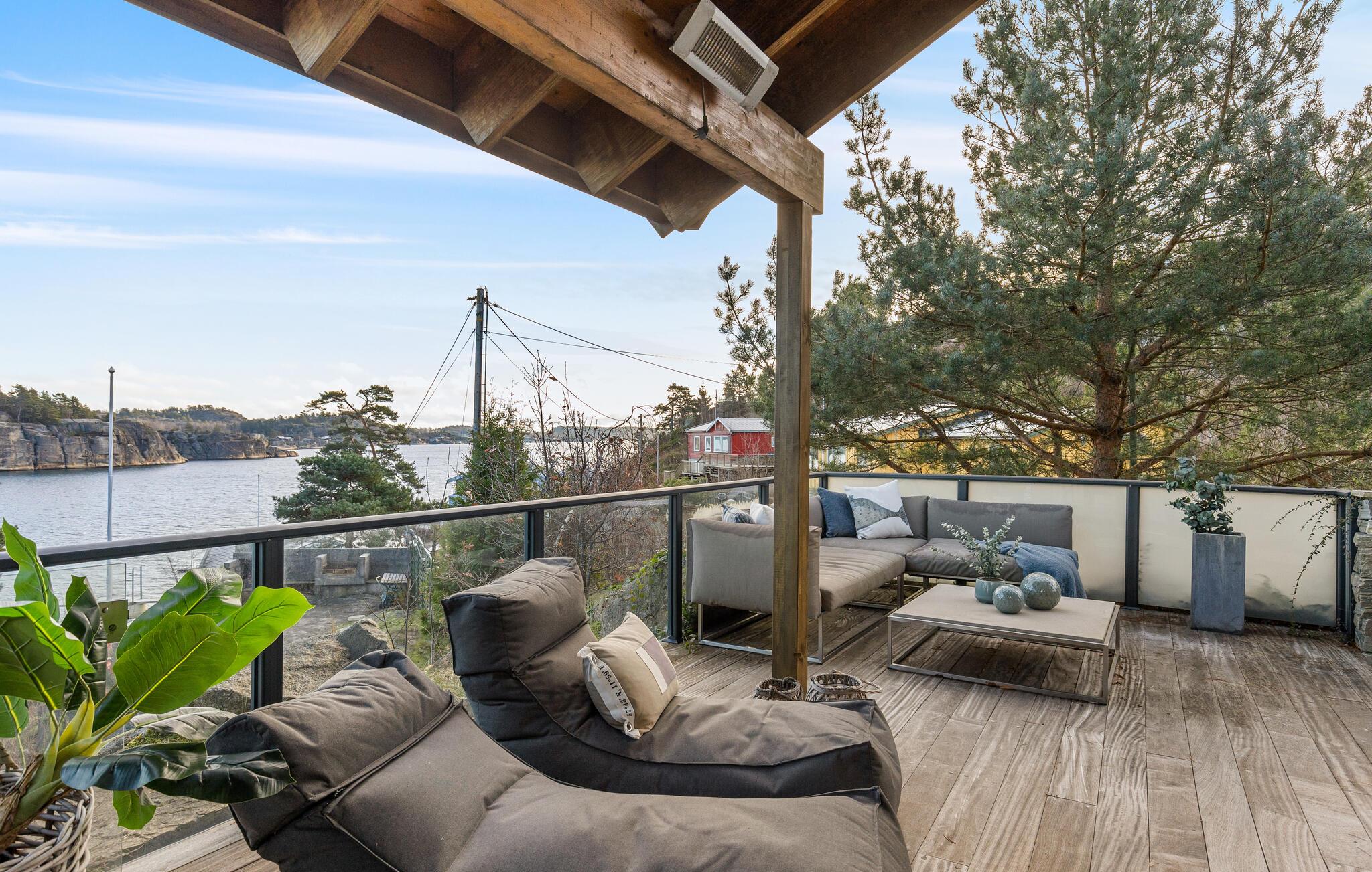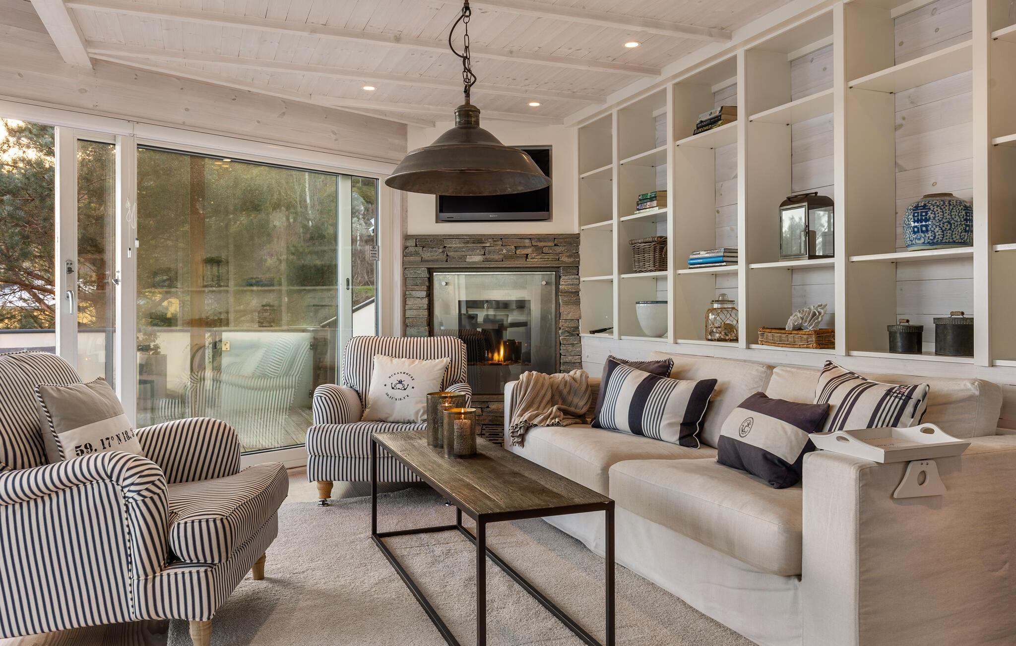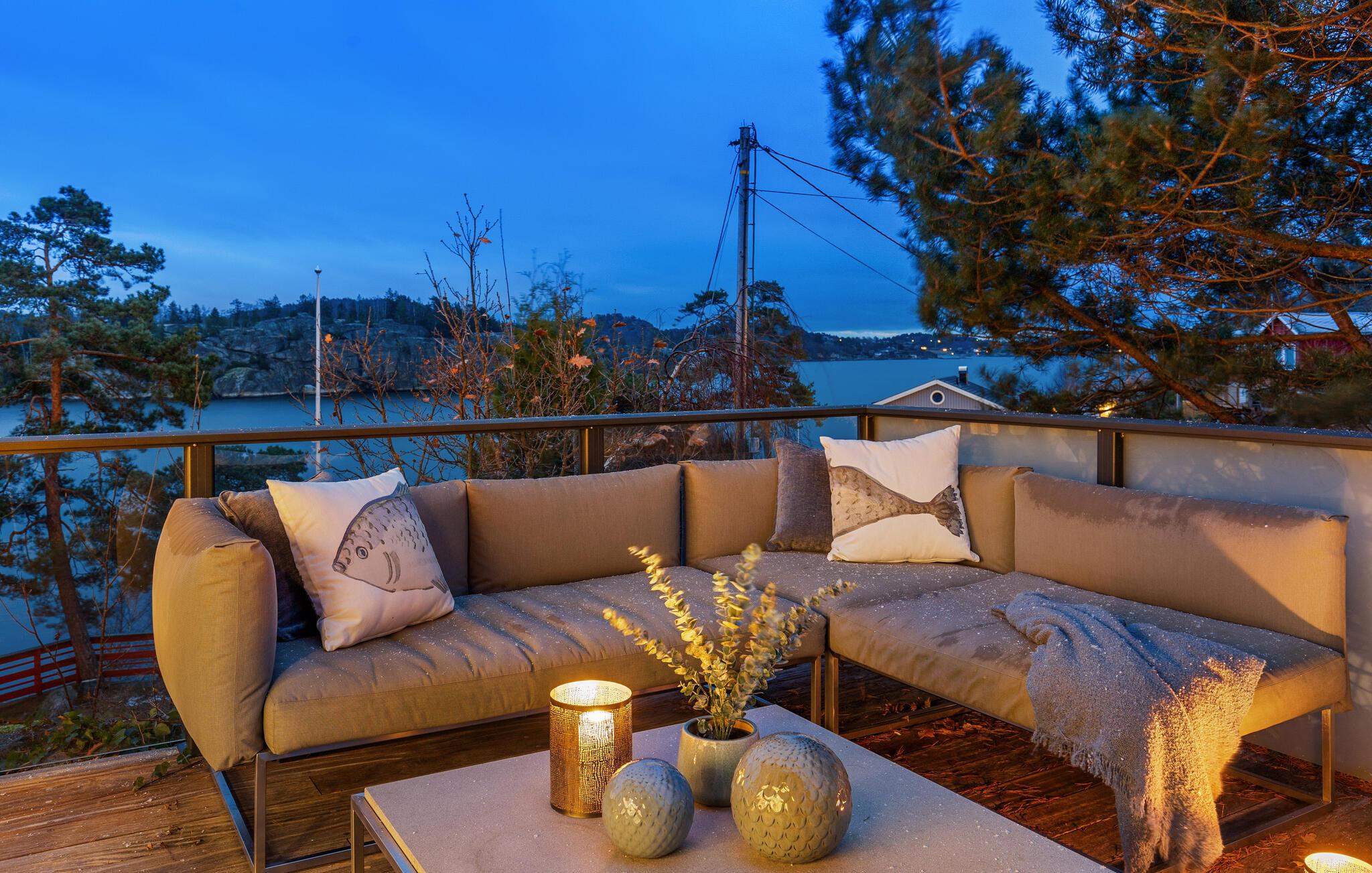 Glæd jer til den betagende havudsigt fra jeres sommerhus i Sandefjord på Vesterøya. Feriehuset kombinerer skandinavisk elegance med moderne komfort. Den åbne opholdsstue er oversvømmet af lys og stilfuldt indrettet takket være de store vinduesfronter. Begynd dagen her afslappet med en overdådig morgenmad og tilbring hyggelige aftener ved pejsen.