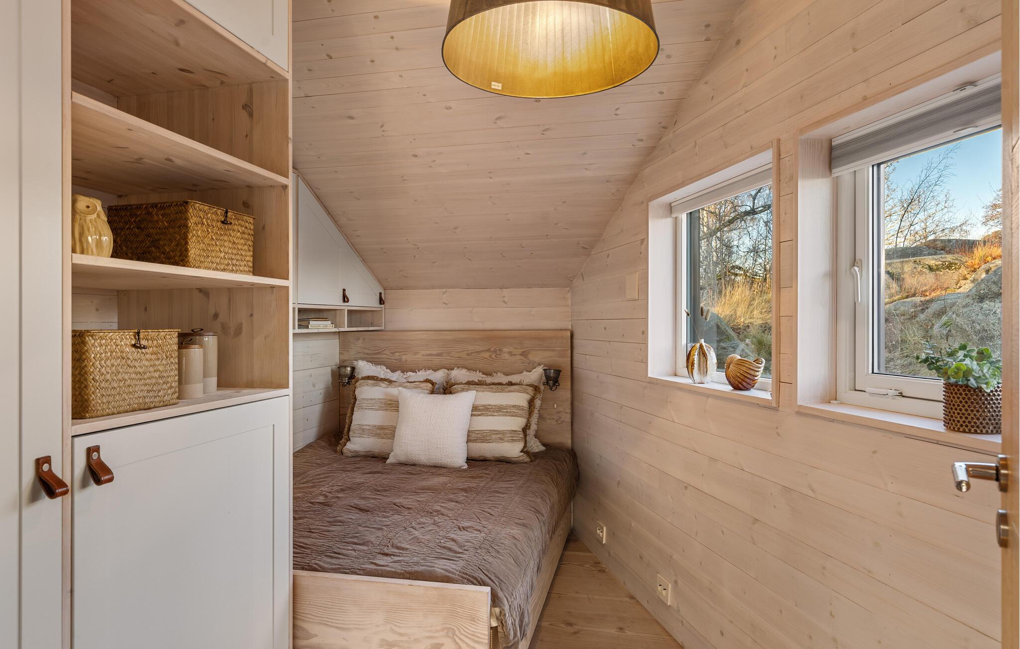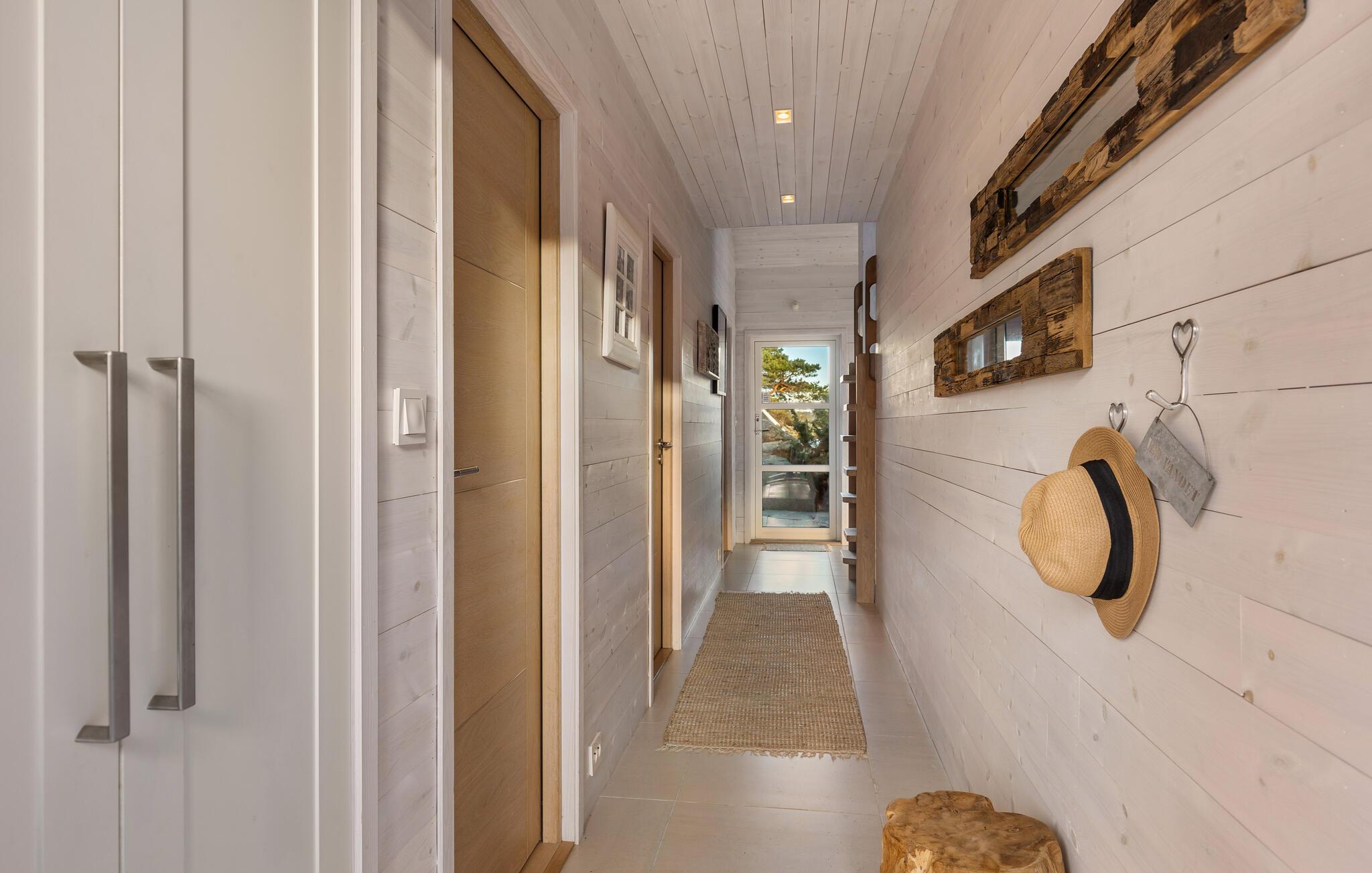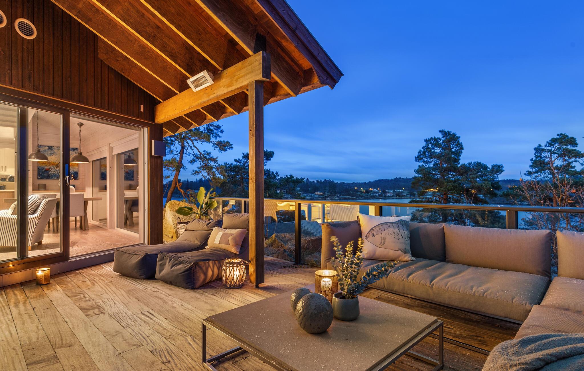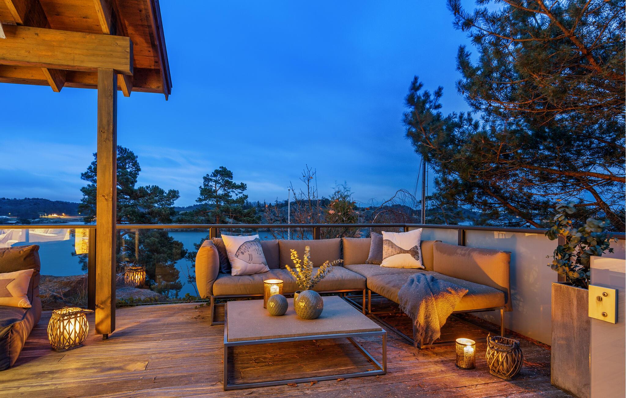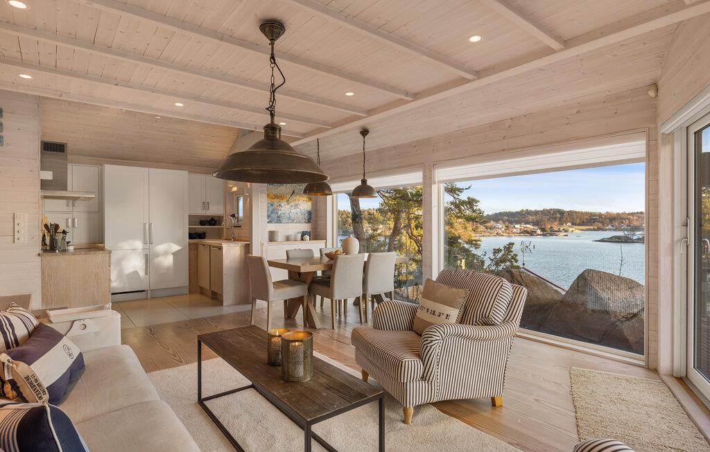 Glæd jer til den betagende havudsigt fra jeres sommerhus i Sandefjord på Vesterøya. Feriehuset kombinerer skandinavisk elegance med moderne komfort. Den åbne opholdsstue er oversvømmet af lys og stilfuldt indrettet takket være de store vinduesfronter. Begynd dagen her afslappet med en overdådig morgenmad og tilbring hyggelige aftener ved pejsen.