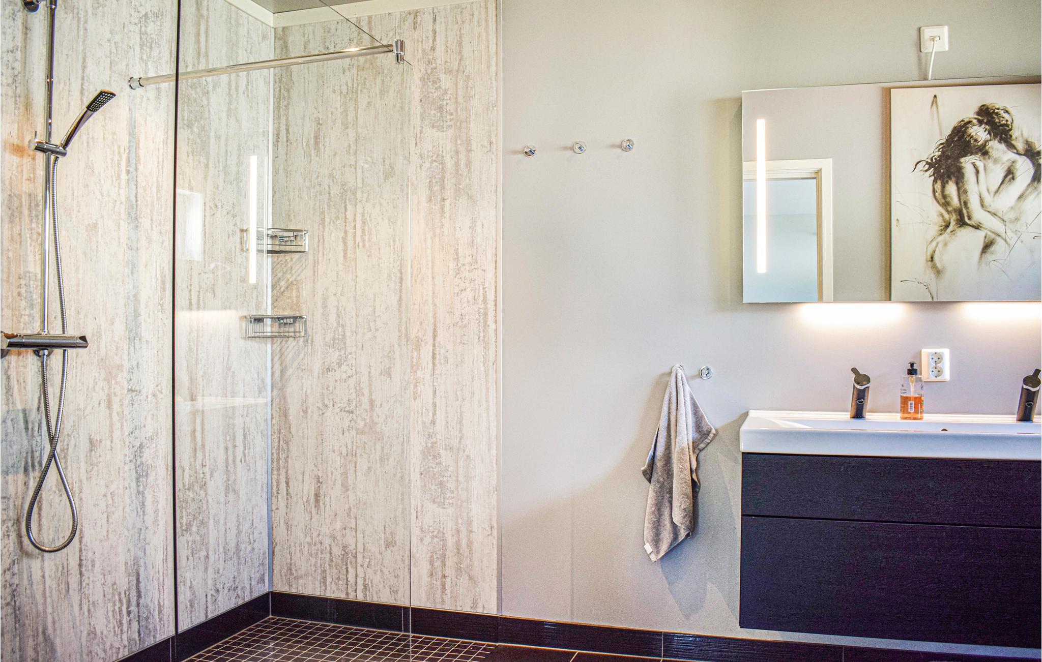 Dette moderne og attraktive træhus venter sine gæster ved vandet. Det er rummeligt og giver plads til en større gruppe eller flere familier, der kan lide at være aktive i naturen og som sætter pris på at være tæt på vandet. Slap af foran brændeovnen, planlæg de næste feriedage og nyd udsigten over fjorden.