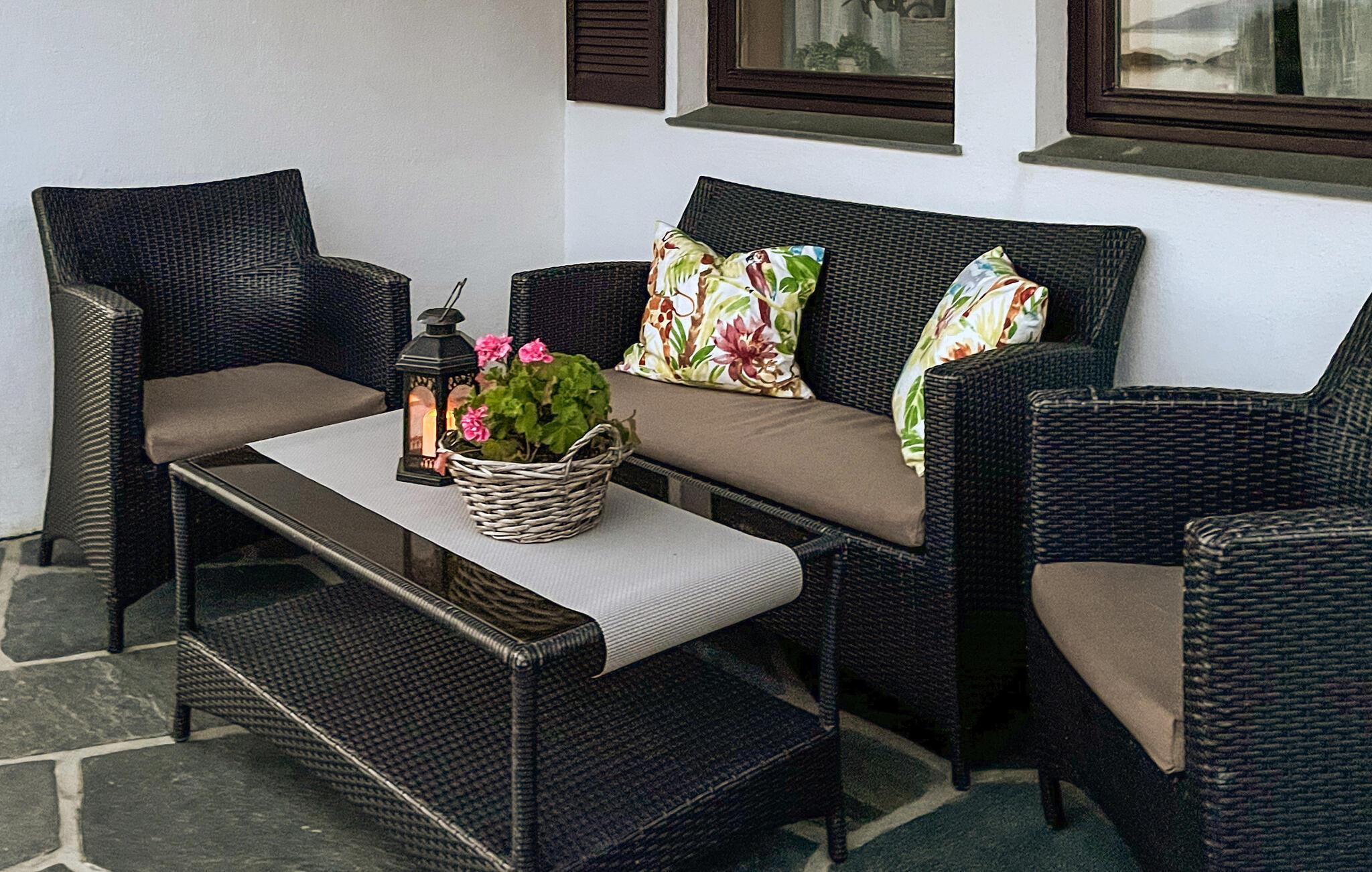 Lejligheden er pænt møbleret og kan rumme en lille familie eller en gruppe venner. Fra terrassen kan I nyde jeres morgenkaffe og en smuk udsigt over fjorden. Terrassen er overdækket, så det er muligt at tilbringe regnfulde dage udenfor. Haven er anlagt med smukke blomster året rundt. Det udvendige område er beskyttet mod vinden.