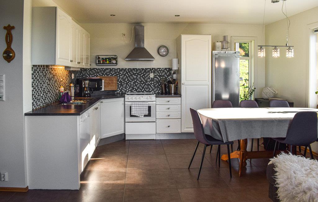 Feriehuset er varmt og hyggeligt. Her kan du sidde ved vinduet og bare nyde udsigten over omgivelserne, mens du planlægger dagens aktiviteter. I køkkenet kan du tilberede dagens fiskemiddag og nyde det omkring det store spisebord.