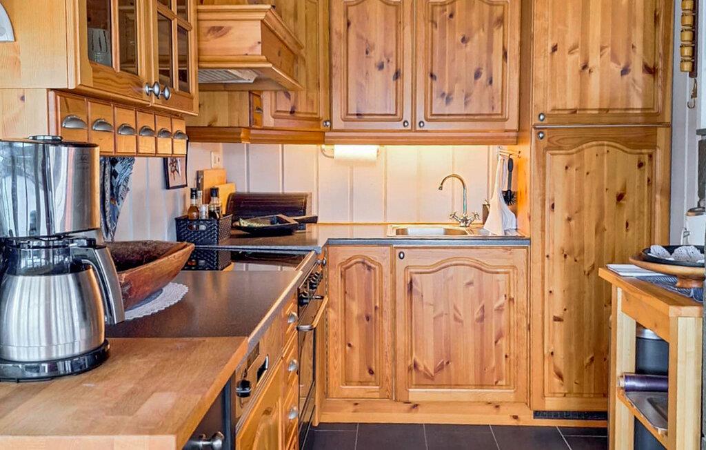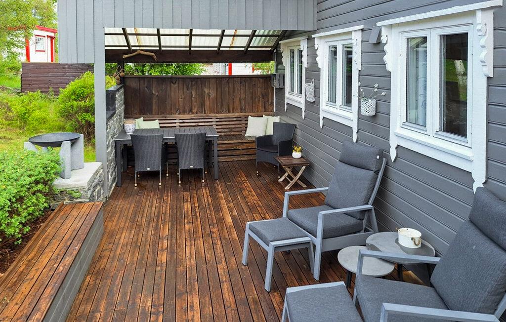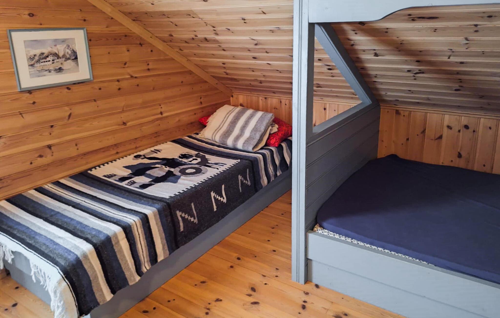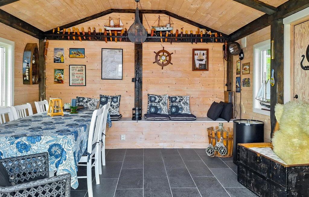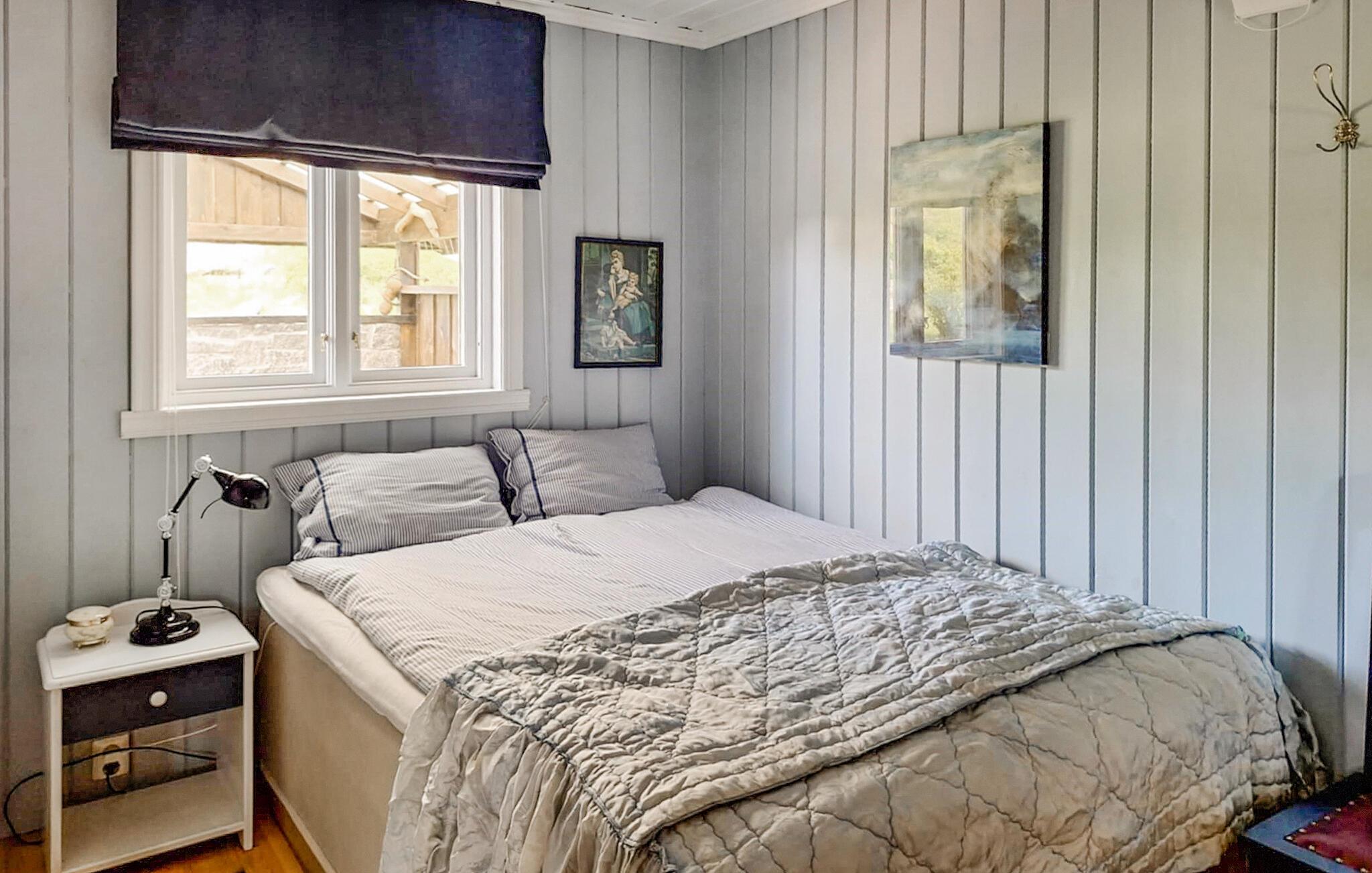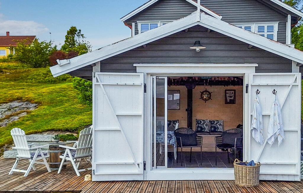 Dette komfortable feriehus byder jer velkommen på en stor grund lige ved vandet og forkæler jer takket være sin fantastiske beliggenhed med en smuk havudsigt på den bilfri ø Tollaksøya. Nyd udsigten over harmoniske måltider, mens den norske brændeovn knitrer stille, afhold spilleaftener i den hyggelige stue, eller stream en spændende film efter en lang dag udendørs.
