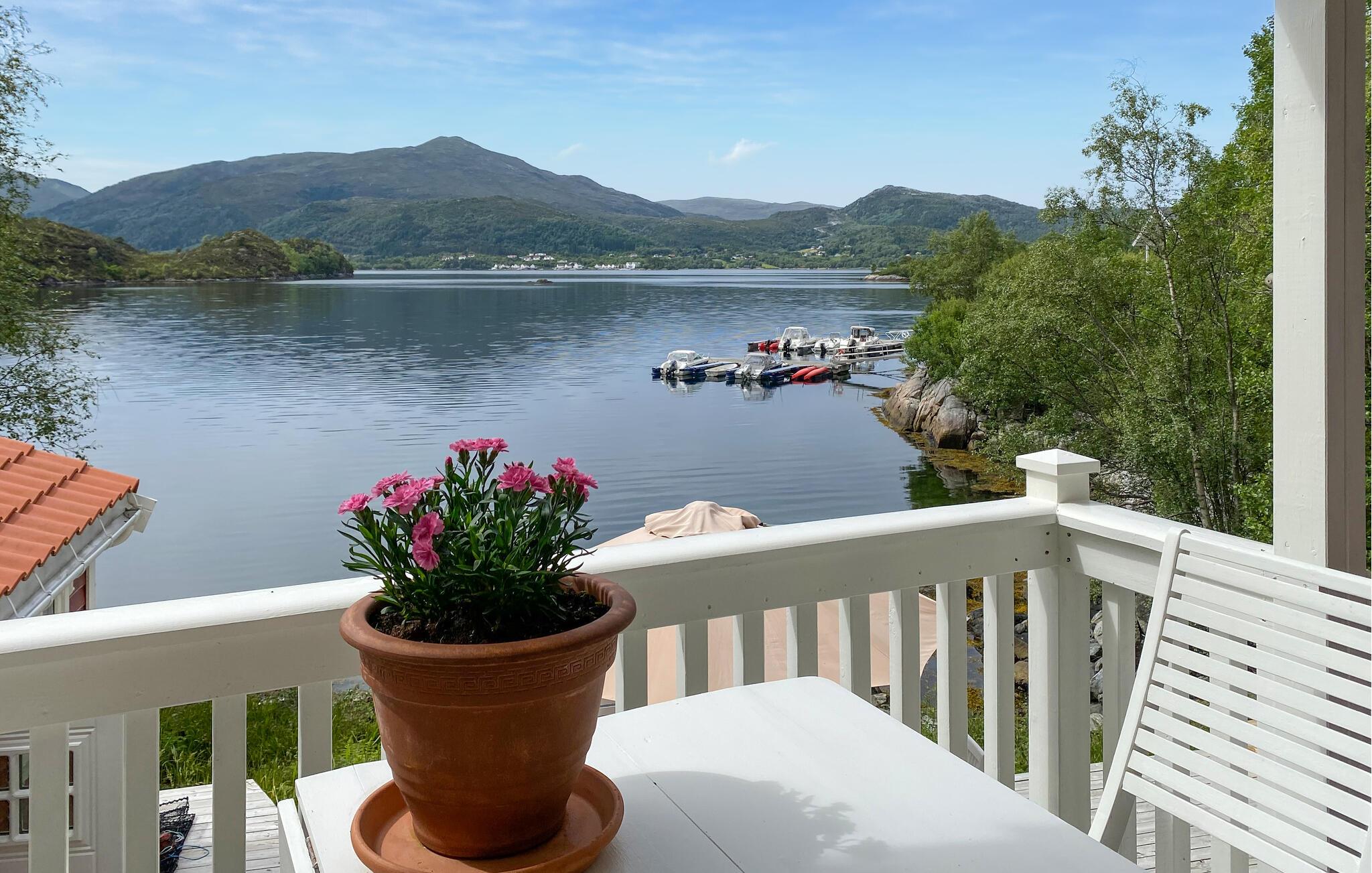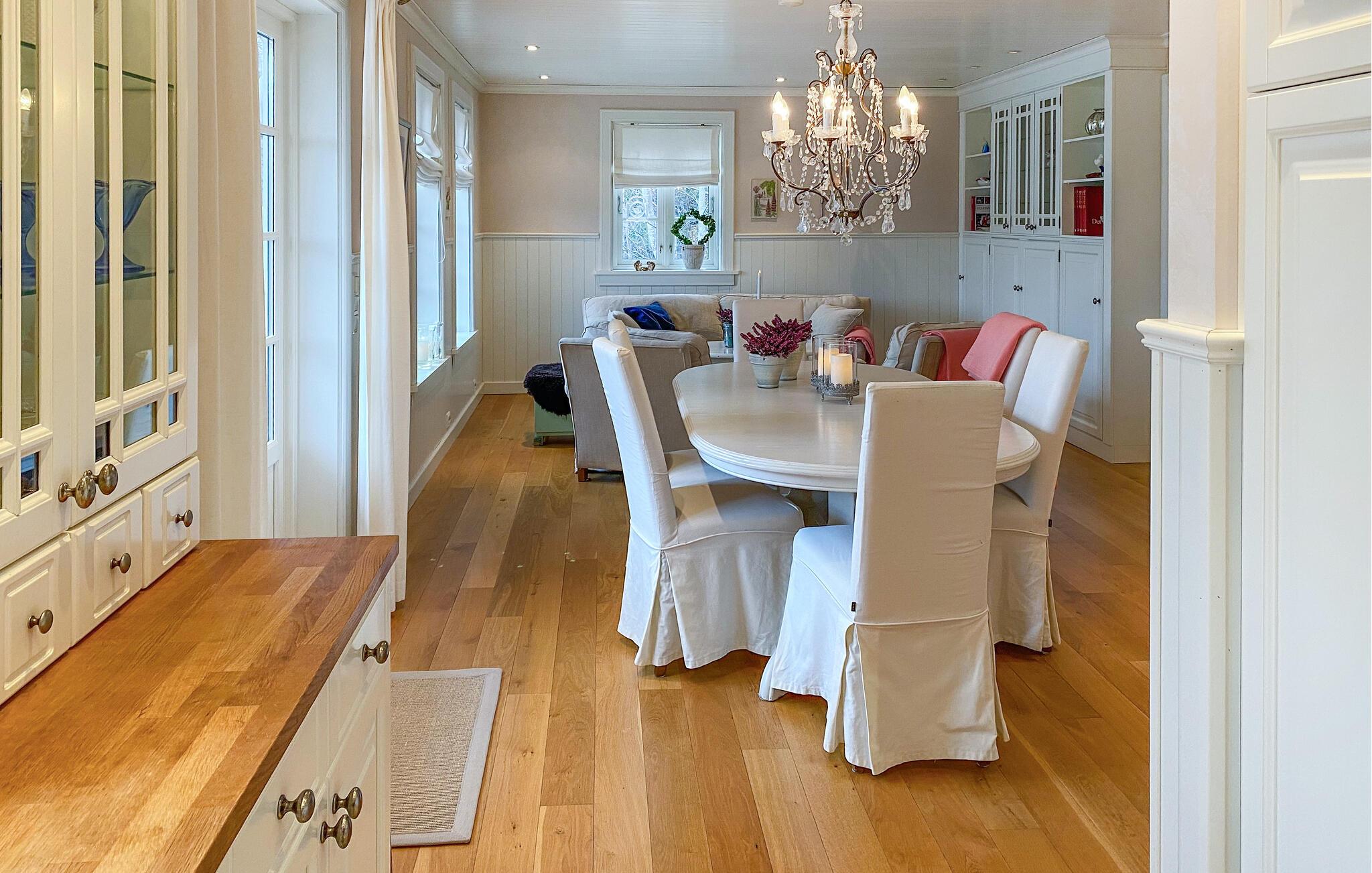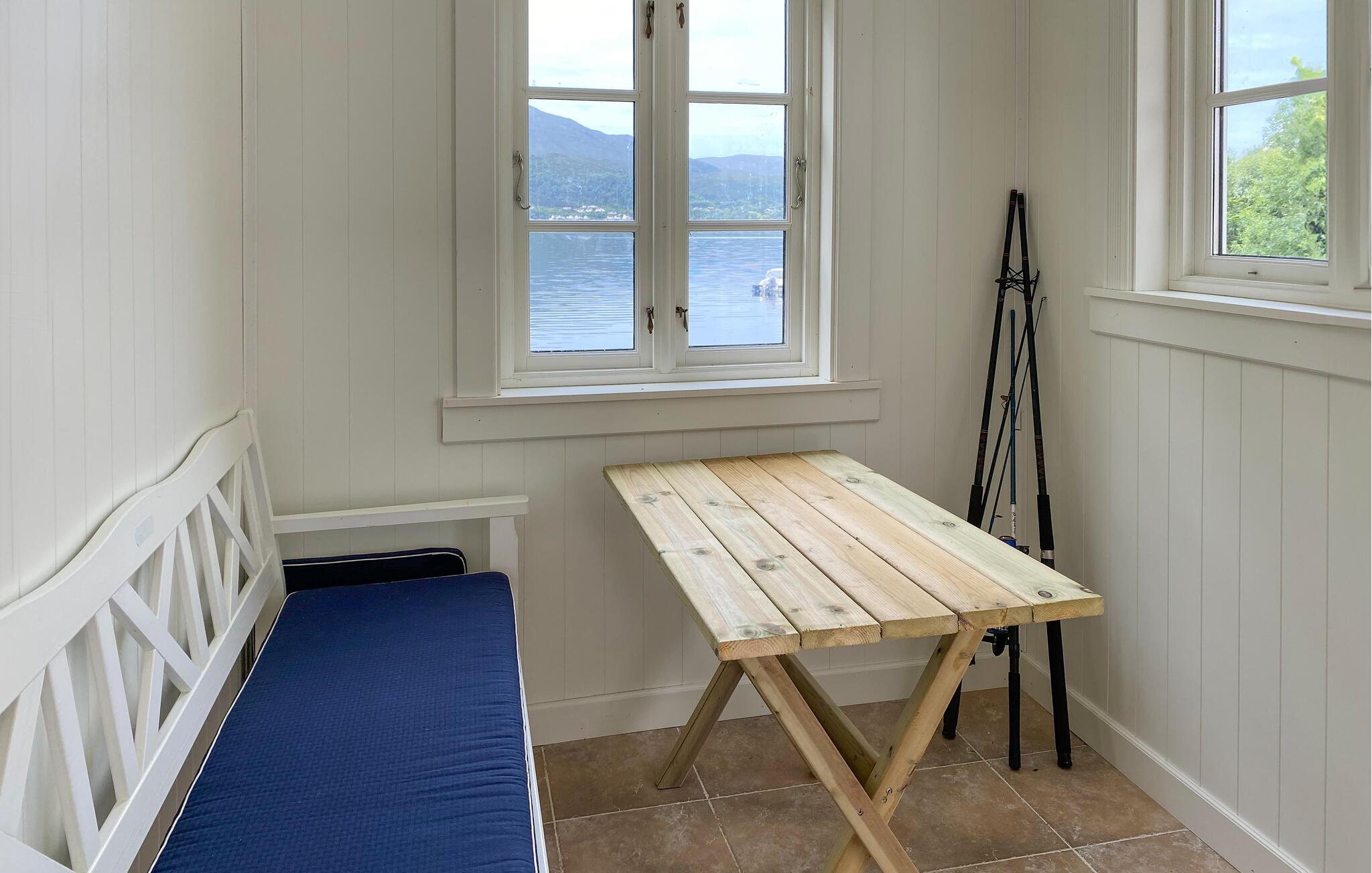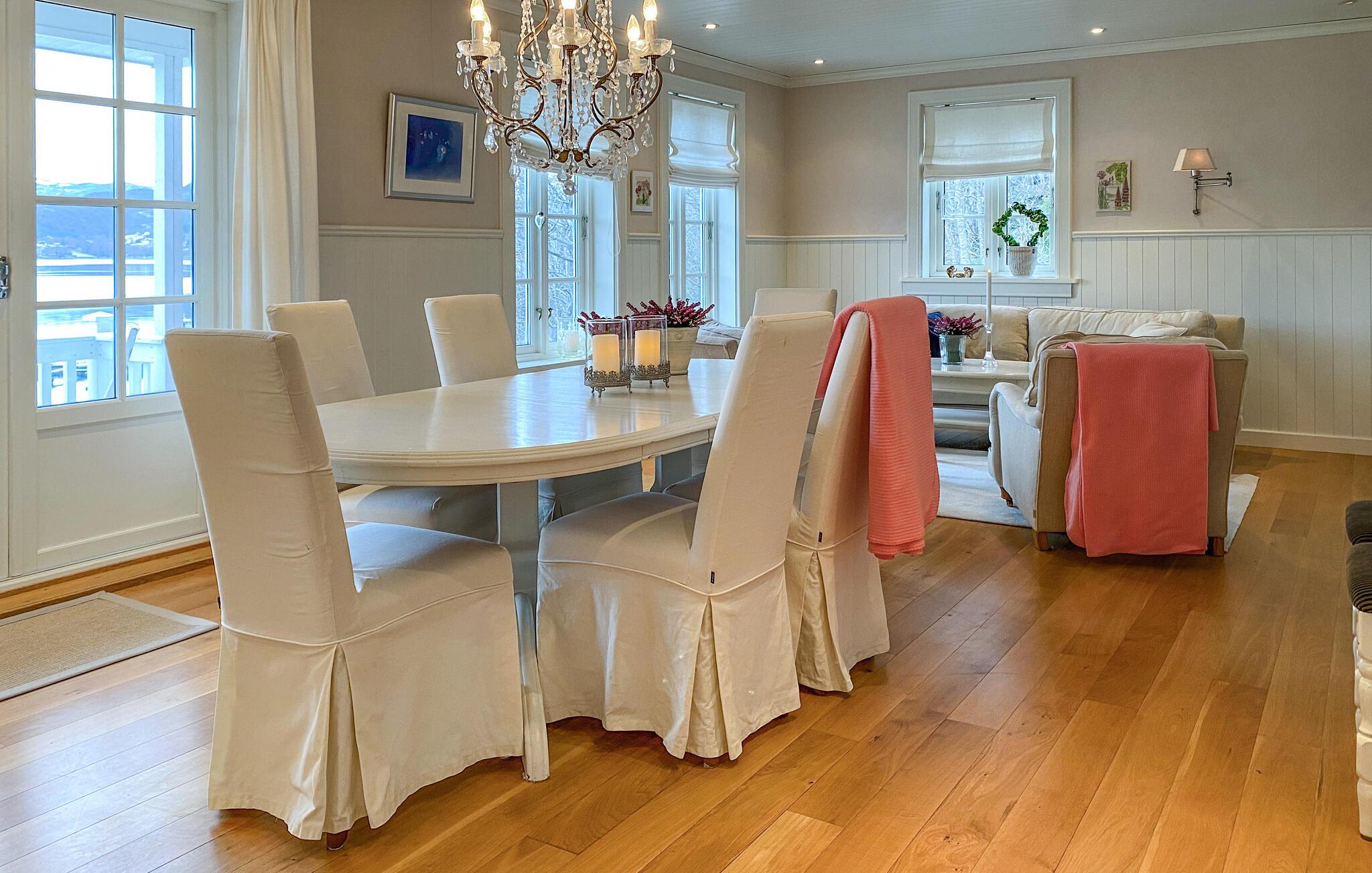 Huset ligger helt fantastisk på en stor, ugeneret grund lige ned til vandet, og her kan I se frem til en bolig med masser af charme og en vidunderlig udsigt over fjorden. Indretningen fremtræder lyst og venligt i bløde farver, der gør det nemt at slappe af her efter en aktiv feriedag. Køkkenet er rummeligt og veludstyret, så gør blot madlavningen til et fornøjeligt fællesprojekt, inden I dækker op til store festmiddag ved spisebordet og nyder udsigten, der er nærmest allestedsnærværende gennem de mange vinduer.