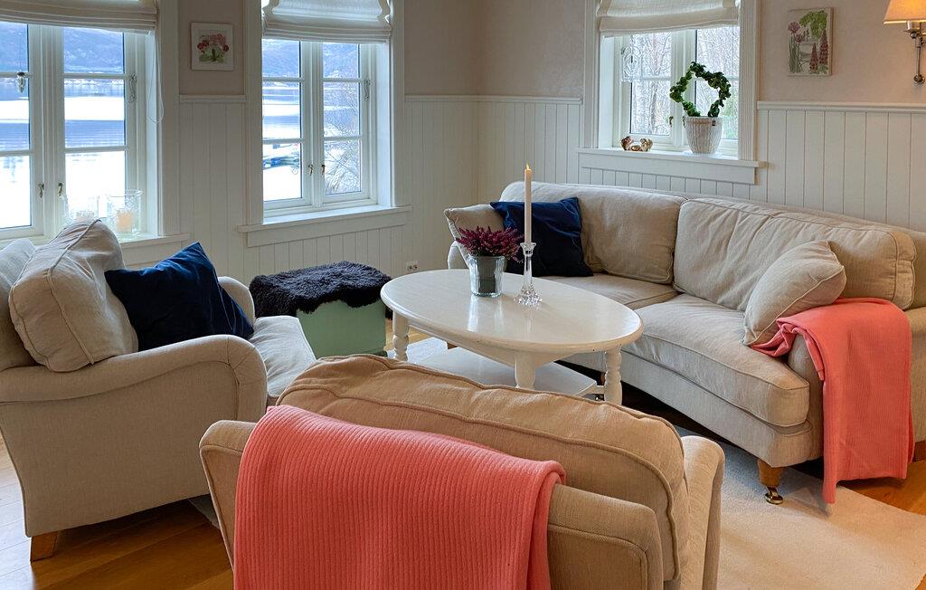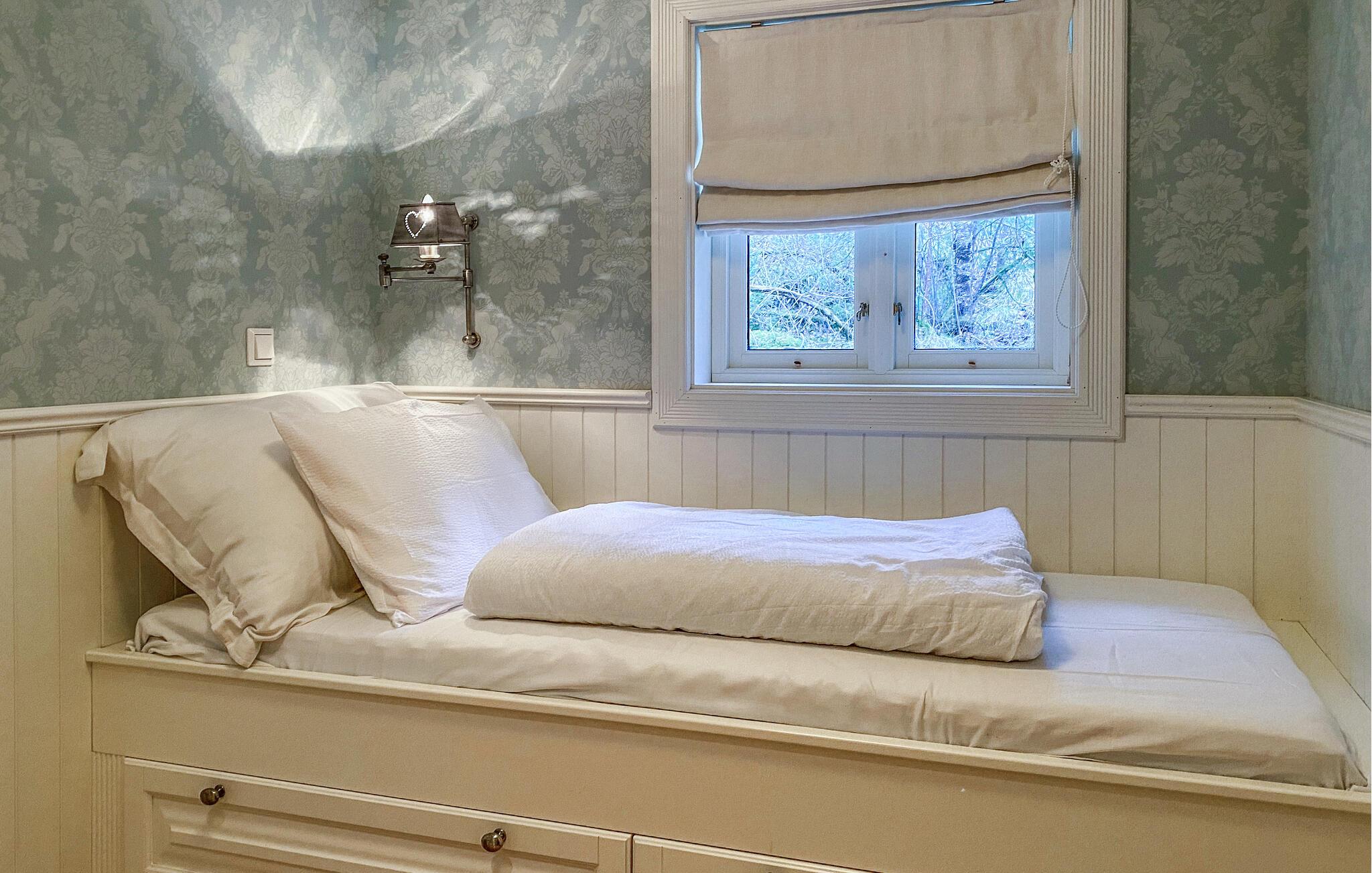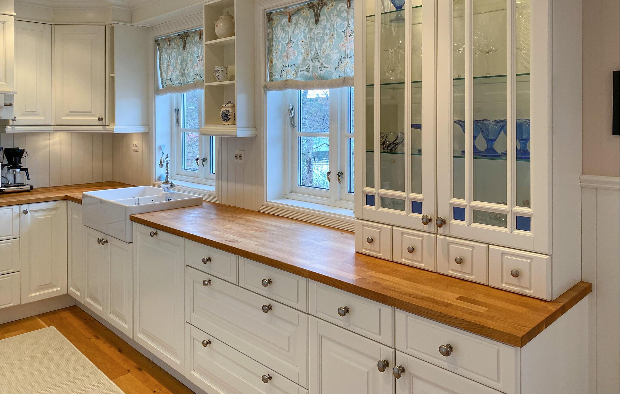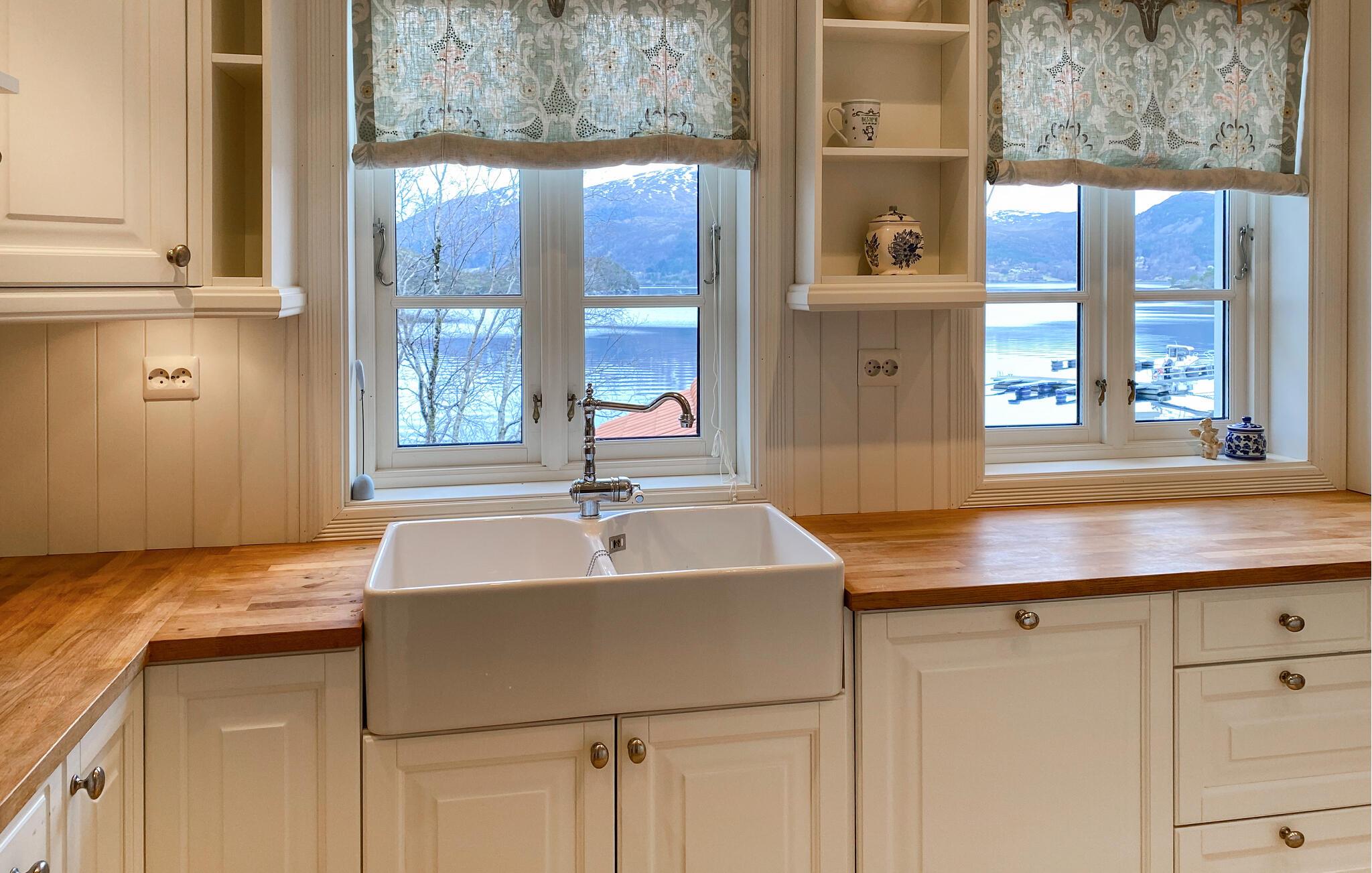 Huset ligger helt fantastisk på en stor, ugeneret grund lige ned til vandet, og her kan I se frem til en bolig med masser af charme og en vidunderlig udsigt over fjorden. Indretningen fremtræder lyst og venligt i bløde farver, der gør det nemt at slappe af her efter en aktiv feriedag. Køkkenet er rummeligt og veludstyret, så gør blot madlavningen til et fornøjeligt fællesprojekt, inden I dækker op til store festmiddag ved spisebordet og nyder udsigten, der er nærmest allestedsnærværende gennem de mange vinduer.