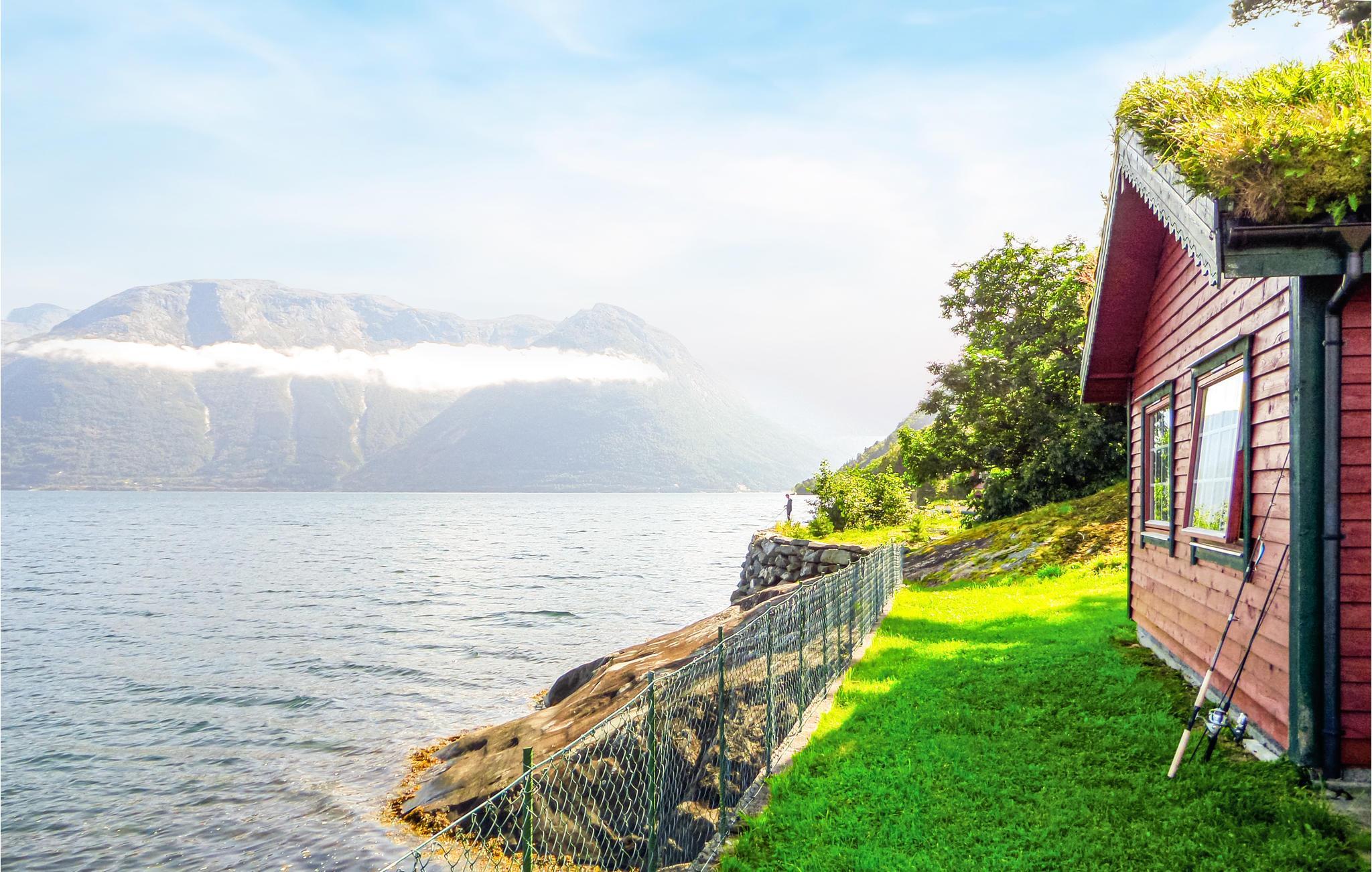 I denne charmerende hytte vil I opleve den traditionelle norske stil og græstagene. Fra stuen har I en fantastisk udsigt over Hardangerfjorden.