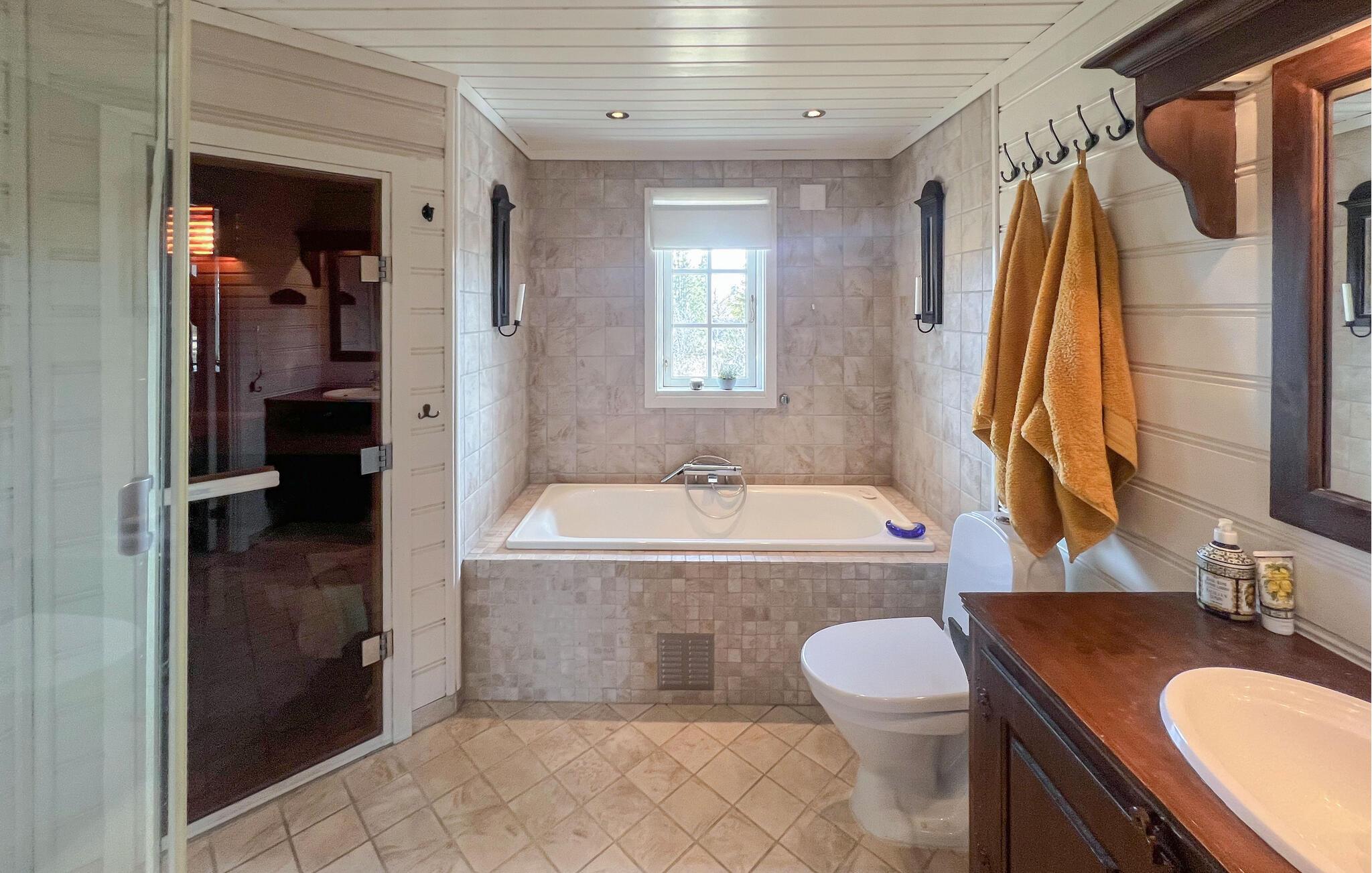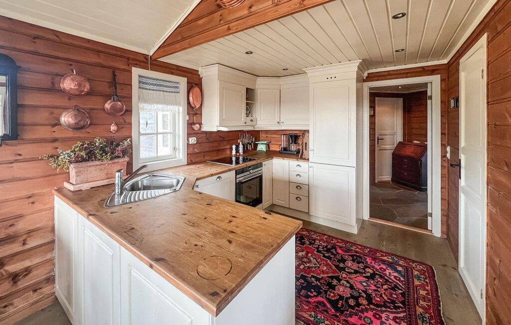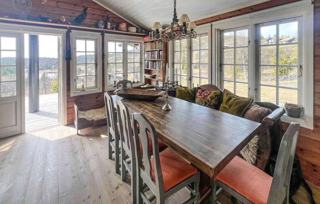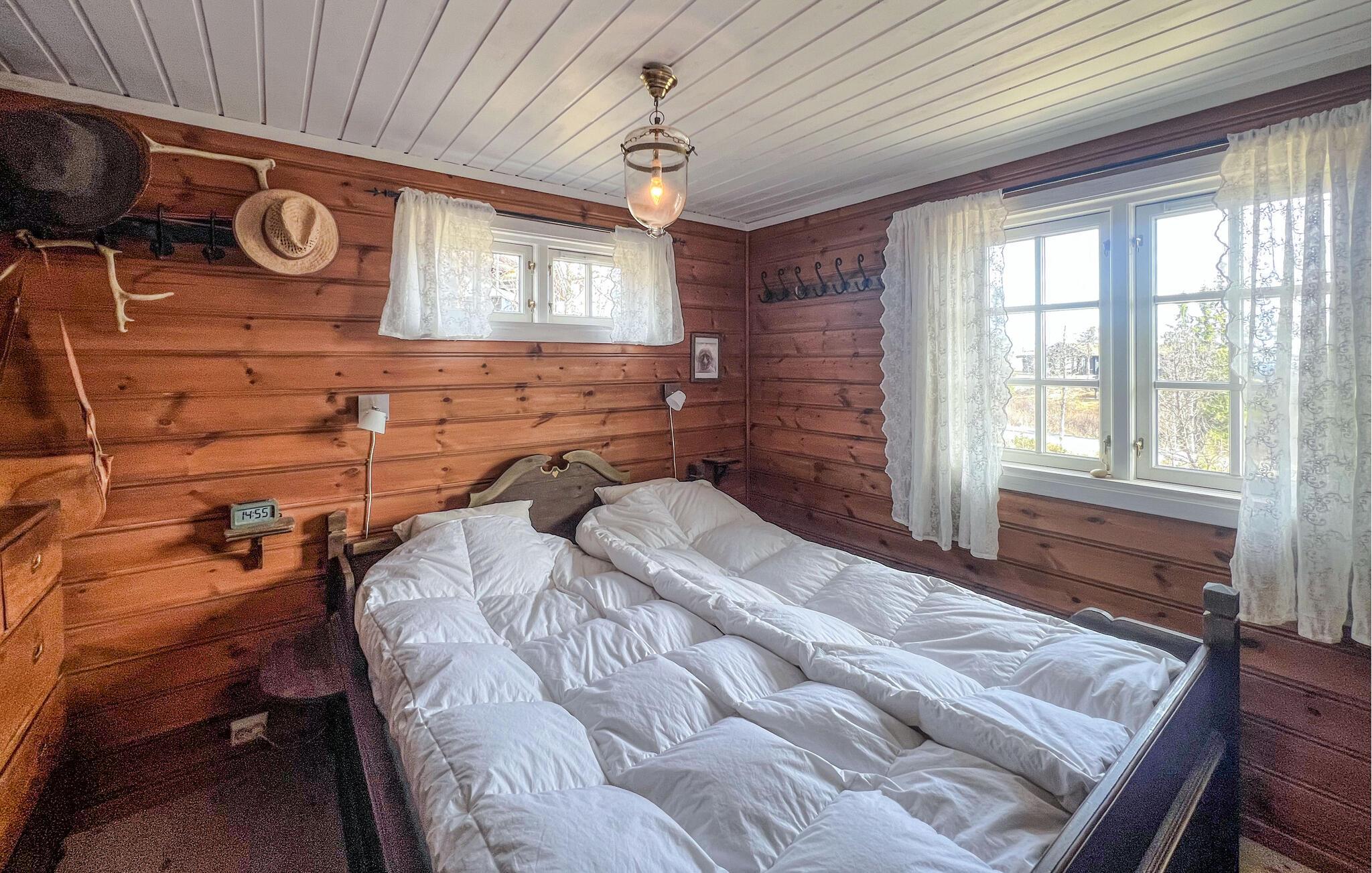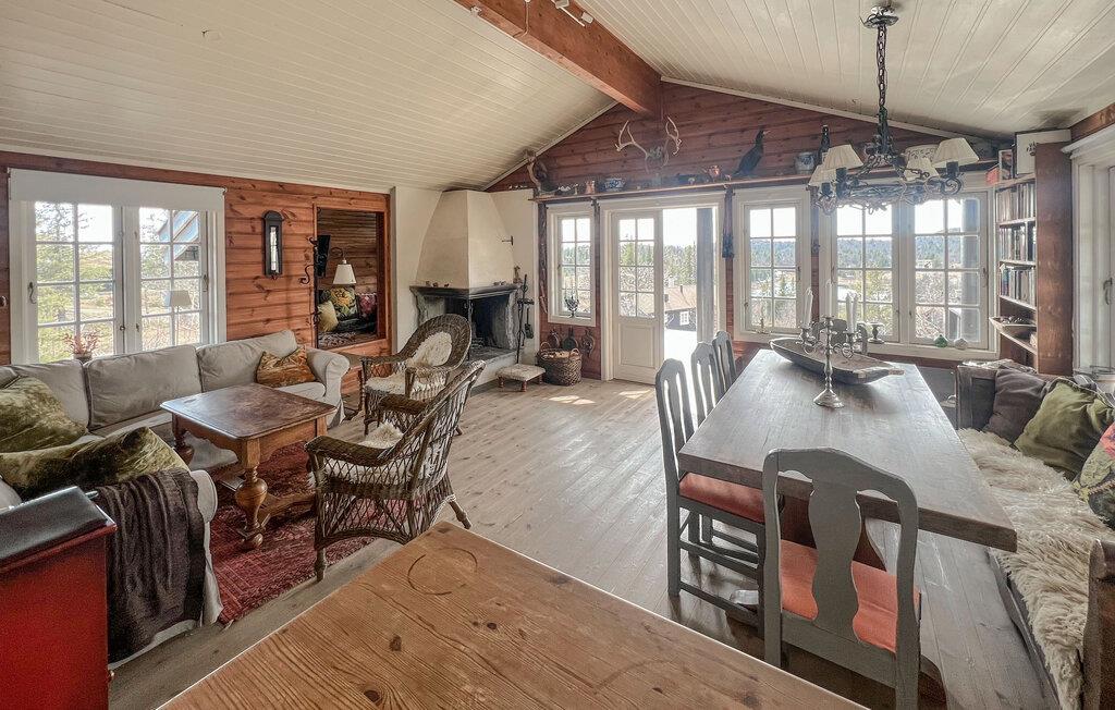 Denne hyggelige og idyllisk beliggende hytte tilbyder masser af plads til en større familie, hvor de kan nyde den rustikke charme og moderne faciliteter. Tilbered lækre måltider i det indbydende køkken, lyt til den knitrende pejs under hyggelige måltider, nyd afslappende øjeblikke i saunaen, og glæd jer til hyggelige spilleaftener eller en god film i den behagelige sofa.