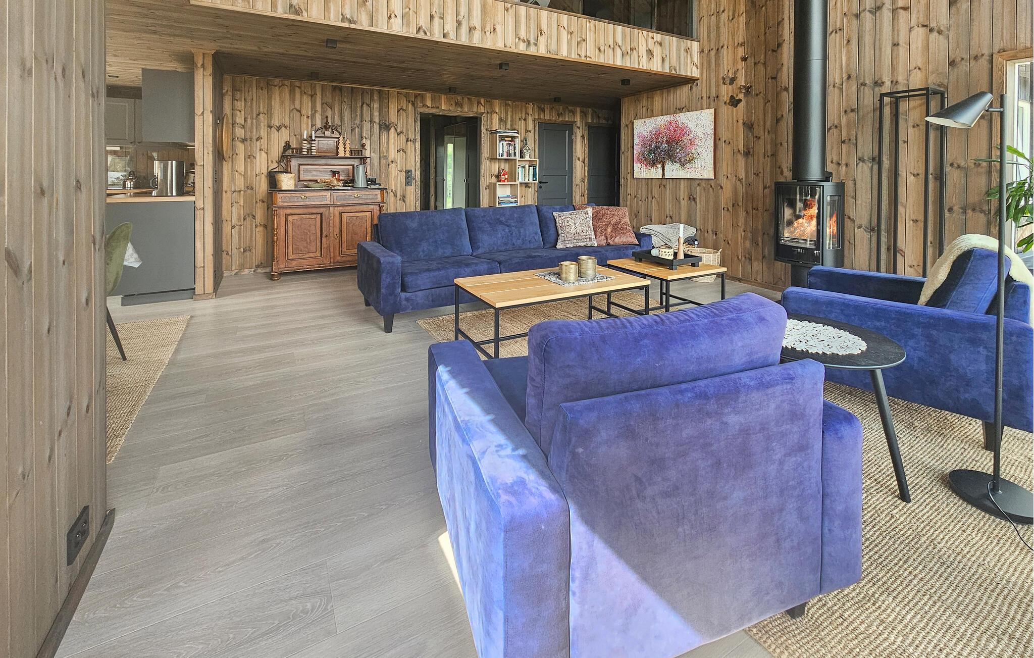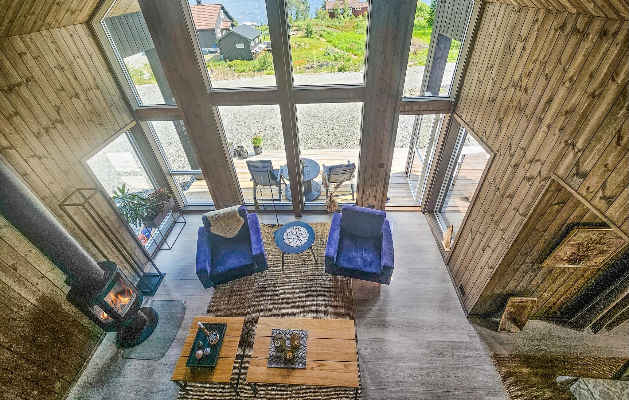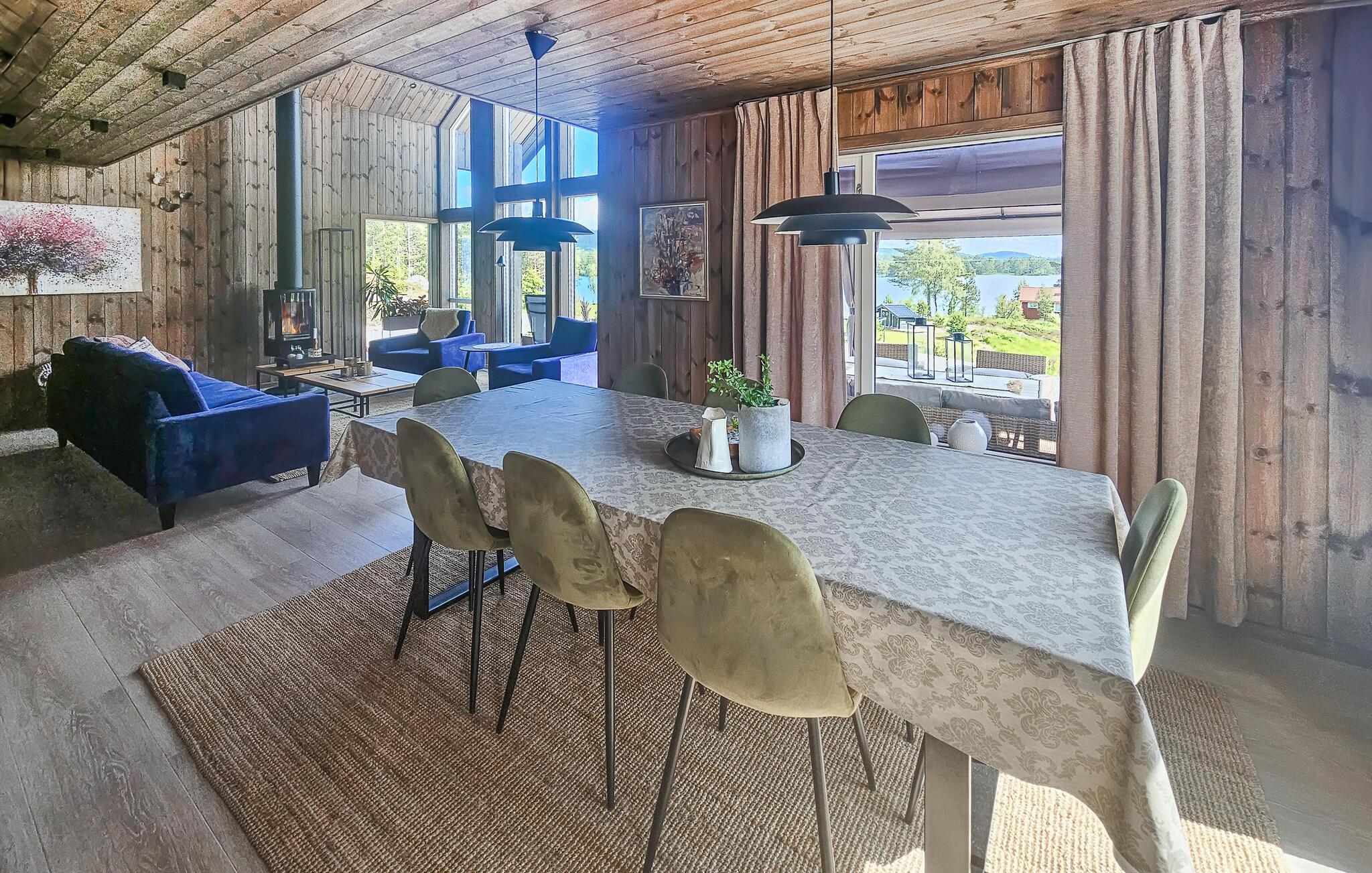 Inde i huset finder I en lys opholdsstue med panoramavinduer, der giver en vidunderlig udsigt over søen. De komfortable sofaer og stilfulde pejs har en indbydende atmosfære, optimal til afslappende aftener. Det skønne køkken, der er åbent til spisepladsen, lægger op til at hygge sig med madlavningen sammen.