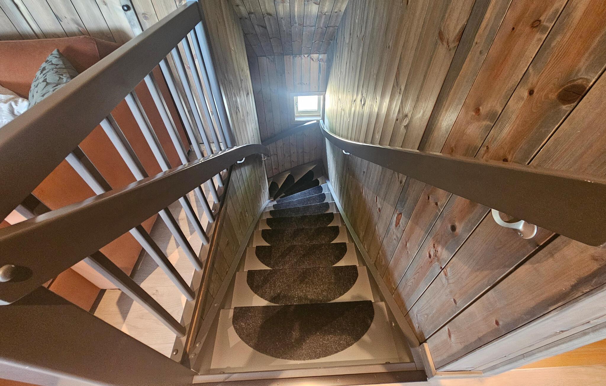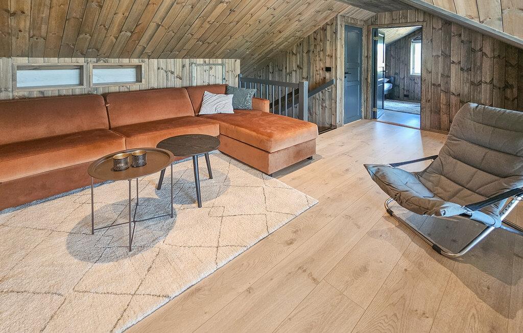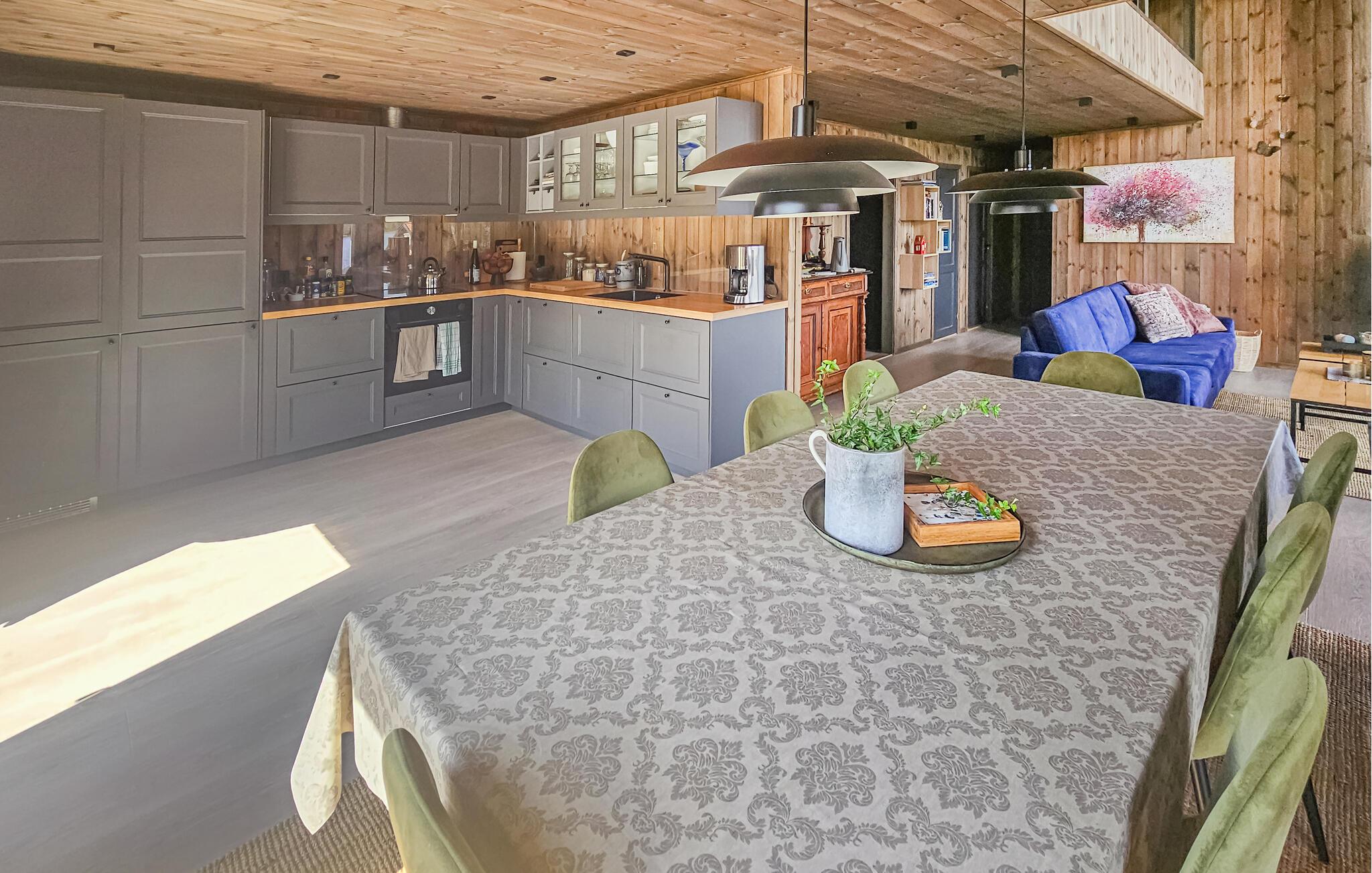 Inde i huset finder I en lys opholdsstue med panoramavinduer, der giver en vidunderlig udsigt over søen. De komfortable sofaer og stilfulde pejs har en indbydende atmosfære, optimal til afslappende aftener. Det skønne køkken, der er åbent til spisepladsen, lægger op til at hygge sig med madlavningen sammen.