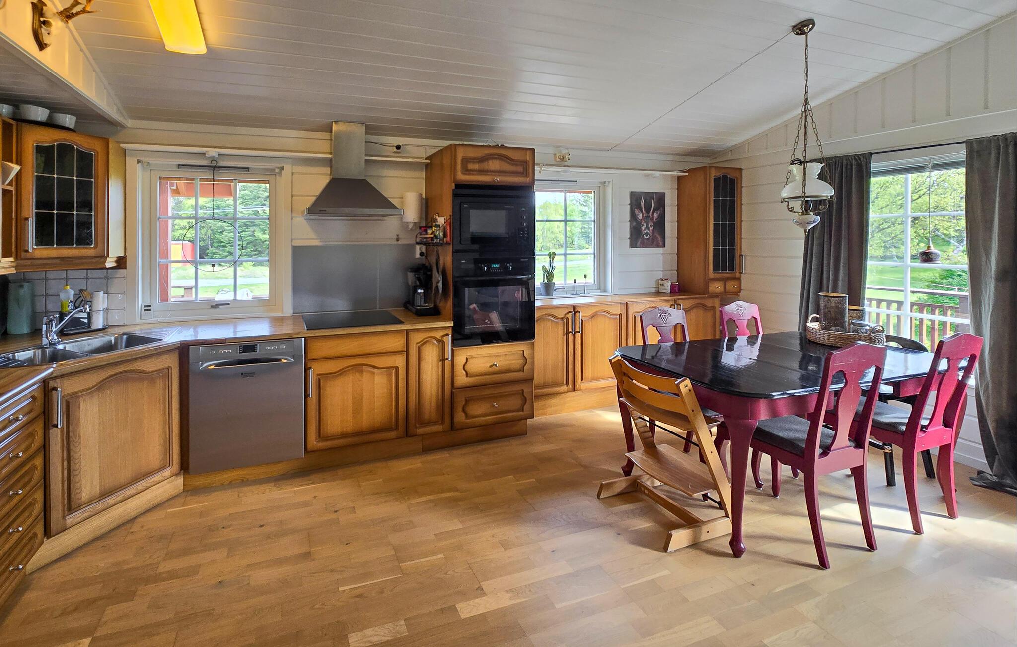 Brug den store træterrasse til at nyde morgenmaden udenfor på solrige dage eller grille om aftenen. Slap af på de komfortable loungemøbler eller se fuglene og lysets spil i de omkringliggende træer. Den store græsplæne giver masser af plads til at lege, solbade eller blot tage en pause.