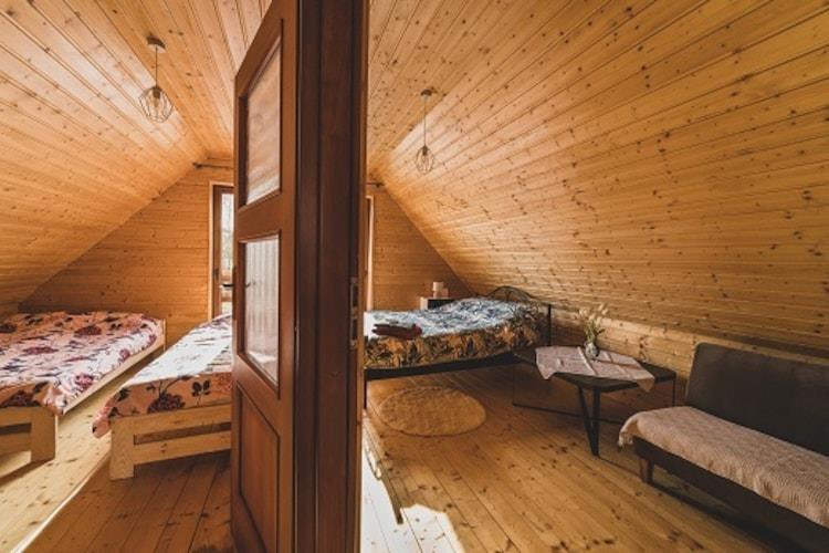 Et ideelt sted til afslapning væk fra travlheden, omgivet af natur, ved en privat, vandfyldt dam. Her har morgenkaffen ved solopgangen en unik smag. Et stort, komfortabelt toetagers feriehus på en privat, indhegnet grund (til eksklusiv brug for gæster) med et gratis spa-område: sauna, spabad med jacuzzi og et kølende kar. I stueetagen er der en rummelig stue (med tv, stort bord, pejs, bordfodboldbord og en dobbelt sovesofa), et veludstyret køkken og et badeværelse med bruser. Ovenpå er der tre separate soveværelser. Sommerhuset har en sauna og et tilstødende kølende kar og jacuzzi. Pejsevarme (brænde inkluderet i prisen). Trådløst internet er tilgængeligt. Der er en stor, overdækket terrasse med havemøbler. På den private grund er der en vandfyldt dam (til eksklusiv brug for gæster, gratis fiskeri er muligt) og et havepavillon med grill og bålplads. Sikker parkering er tilgængelig. På den tilstødende grund har gæster fra tre tilstødende feriehuse adgang til en legeplads, volleyballbane, bordtennis, stave til stavgang, fodboldmål og et udendørs fitnesscenter. Gæsterne kan gratis benytte adskillige gokarts. Prisen inkluderer: sengelinned, håndklæder, badekåber, sauna, spabad med jacuzzi, vand, brænde, slutrengøring, internet, parkering og fiskeri i den private dam. En barneseng og højstol er tilgængelige efter anmodning. Feriehuset ligger i hjertet af Kasjubien, omgivet af tætte skove, maleriske enge og talrige søer med krystalklart vand. Det nærmeste svømmeområde er Skrzynki Duze-søen (3,6 km fra huset). Der er også et dykkercenter. I den nærliggende landsby Lipusz (1,5 km) er der en større butik, restauranter og kajakudlejning (til kajakture på Wda-floden).