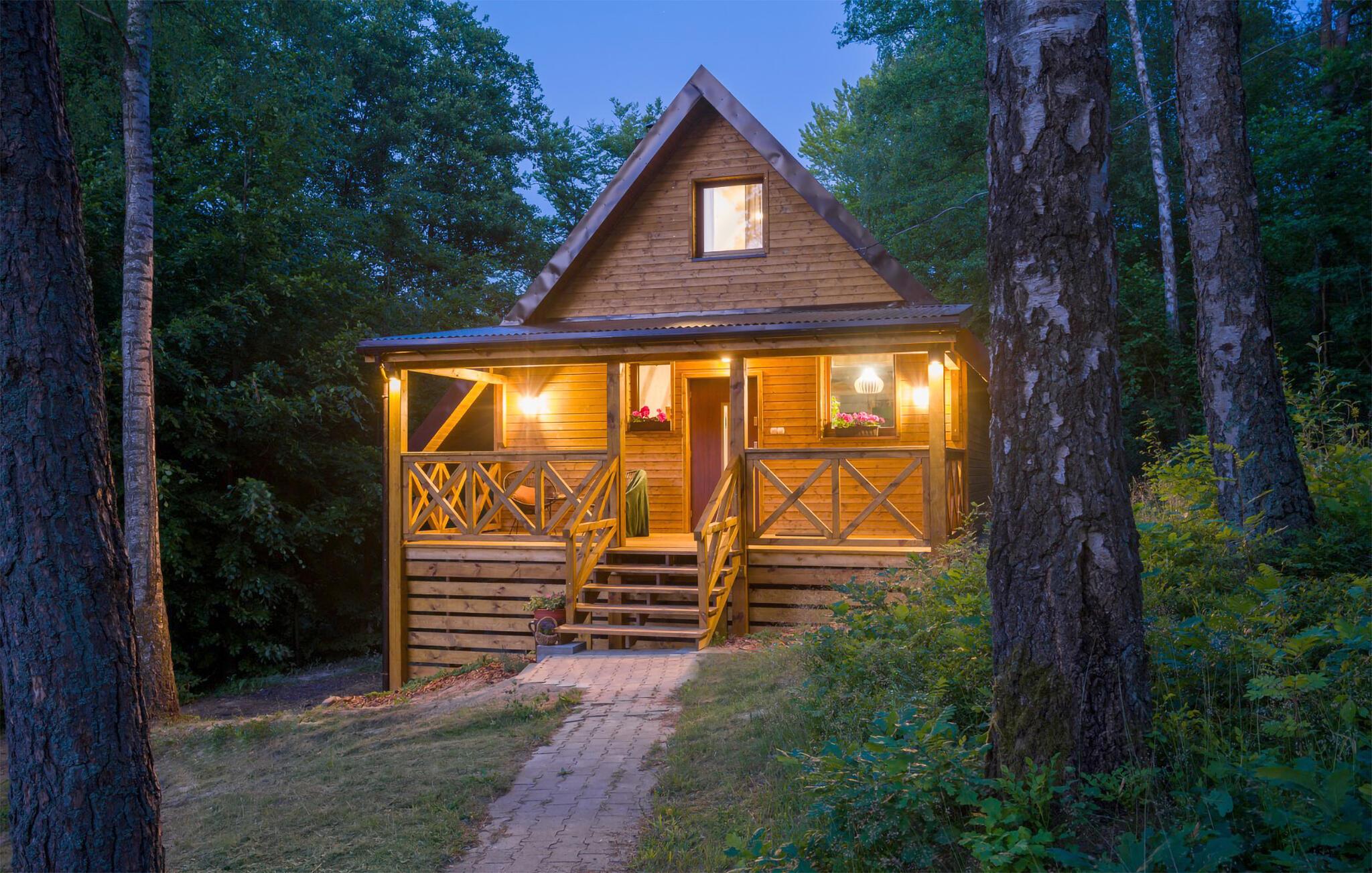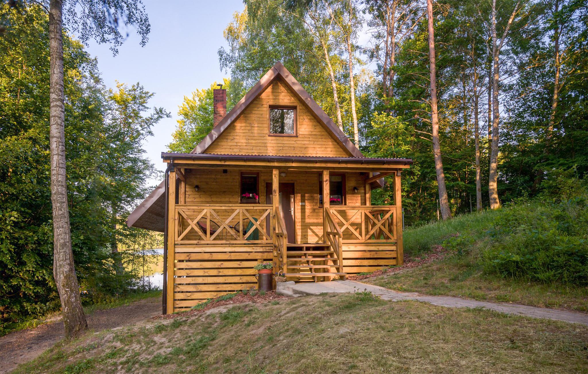Dette skønne træhus med stor veranda har en idyllisk beliggenhed ved søen.