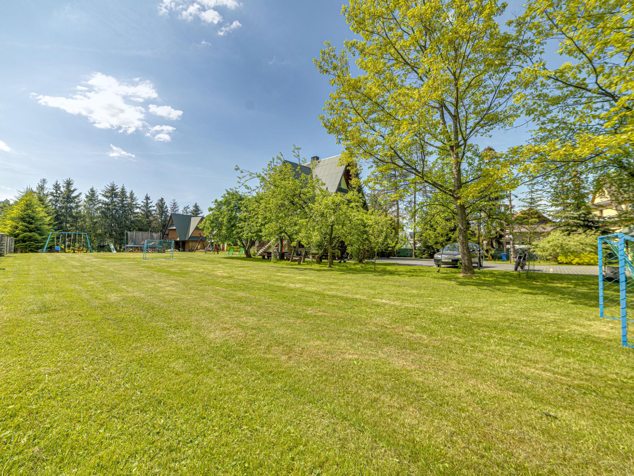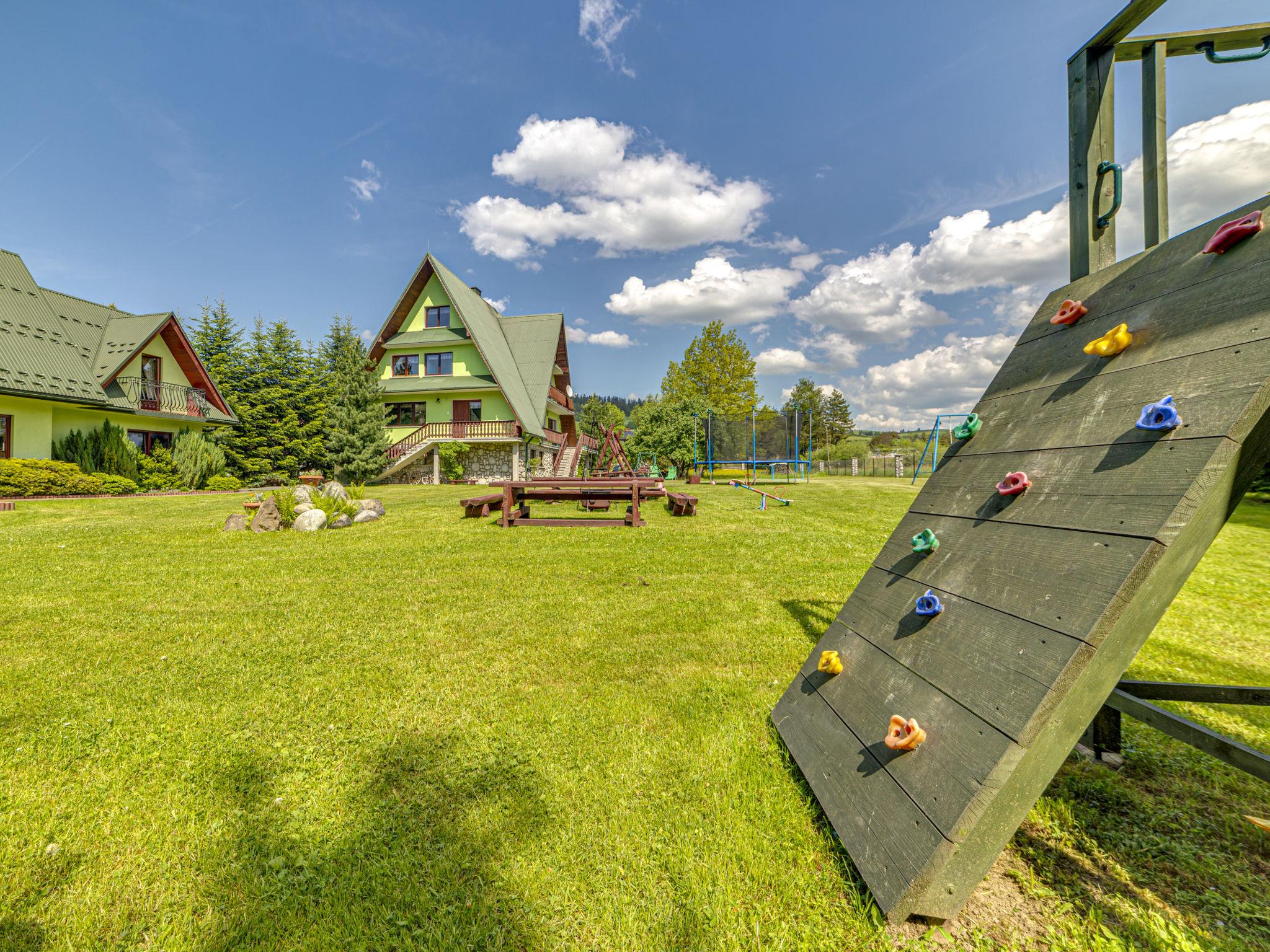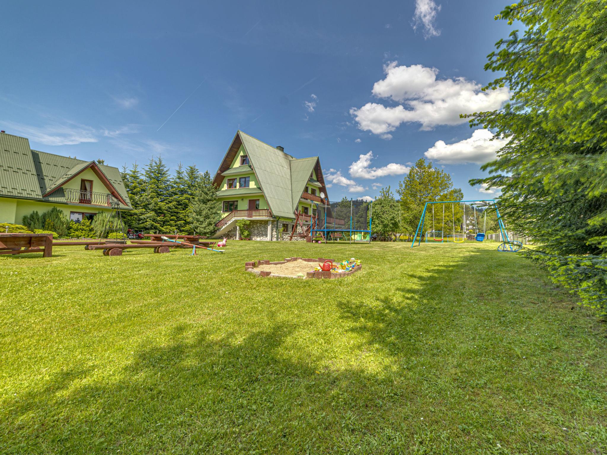 Chalet "Super Hacjenda". 4 apartments in the property. In a quiet, sunny position, 100 m from the edge of the forest, 500 m from the skiing area, 200 m from the river, in the countryside. For shared use: property 5'000 m2 (fenced), lawn, orchard, swimming pool (above ground) (5 m diameter, depth 125 cm, seasonal availability: 01.Jun. - 31.Aug.). Garden furniture, barbecue, fireplace (swing, sandbox). Motor access to the house. Parking at the house on the premises. Shop, grocery, restaurant 200 m, bus stop 200 m, indoor swimming pool 3 km, thermal baths "Bialka Tatrz./Bukowina Tatrz." 5 km. Tennis 200 m, riding stable 2 km, ski lift 500 m. Please note: suitable for families. The owner lives on the same property. 40 ski-lifts within the distance of 10 km. Possibility of organizing sledging (extra).