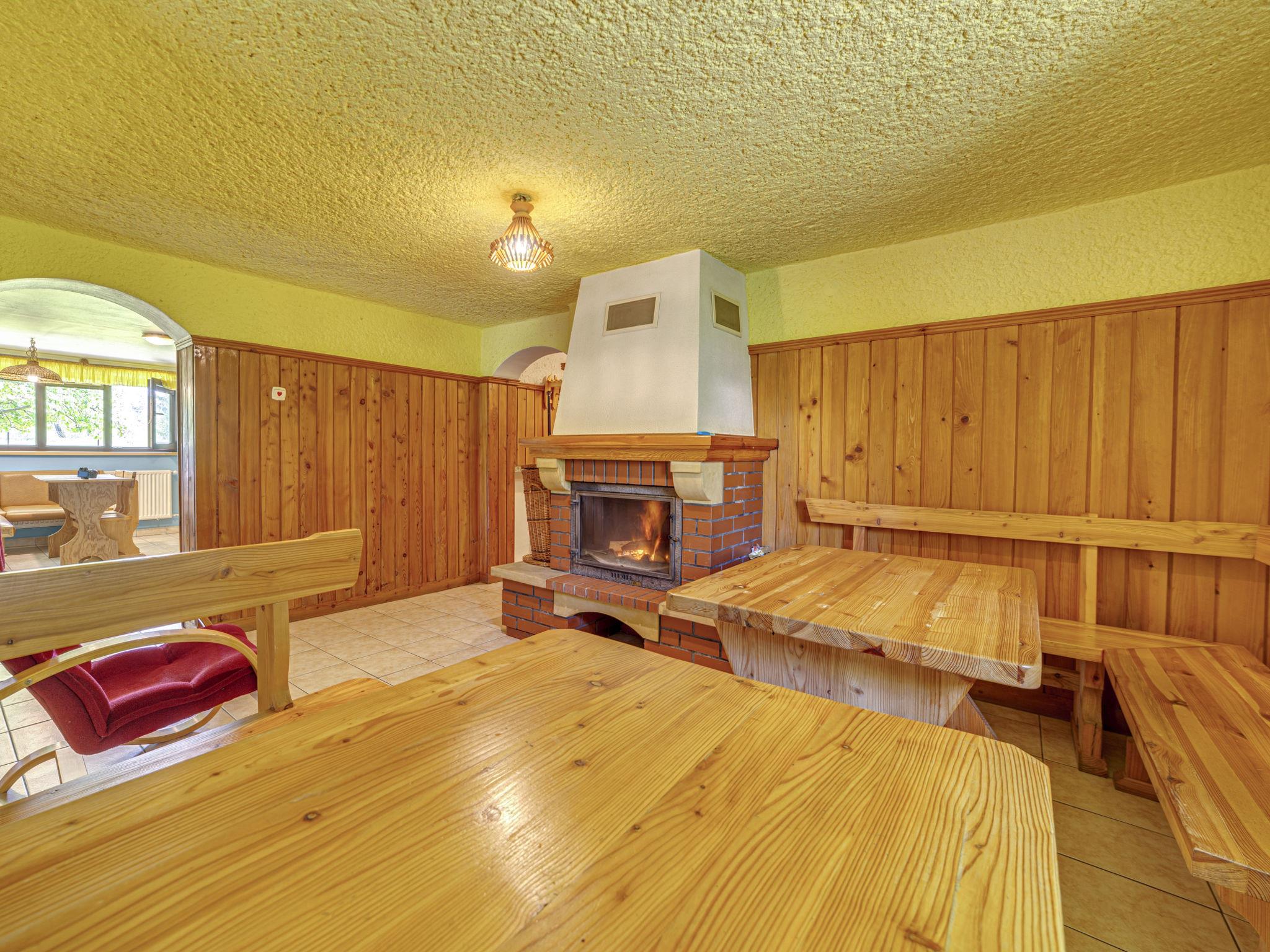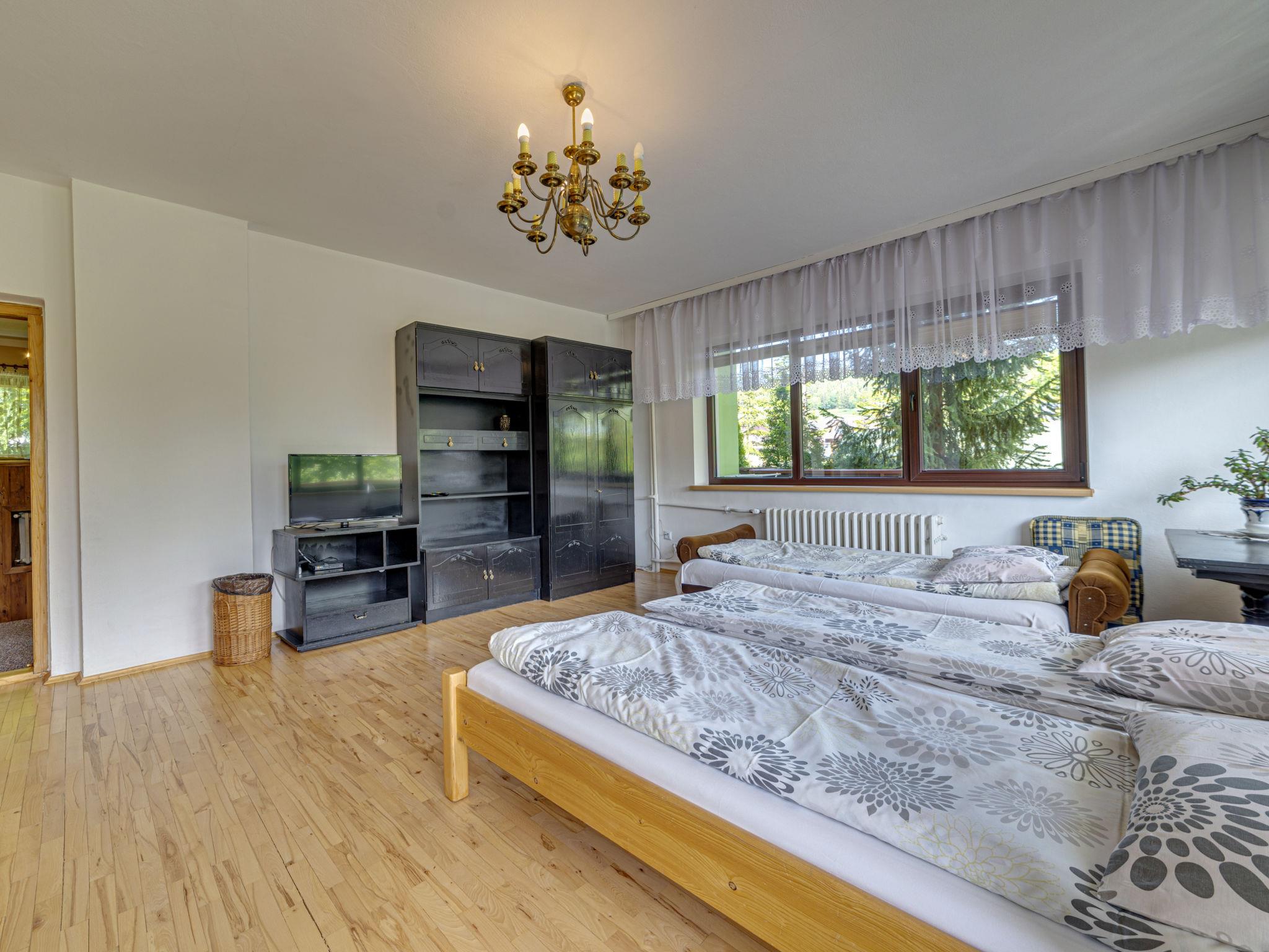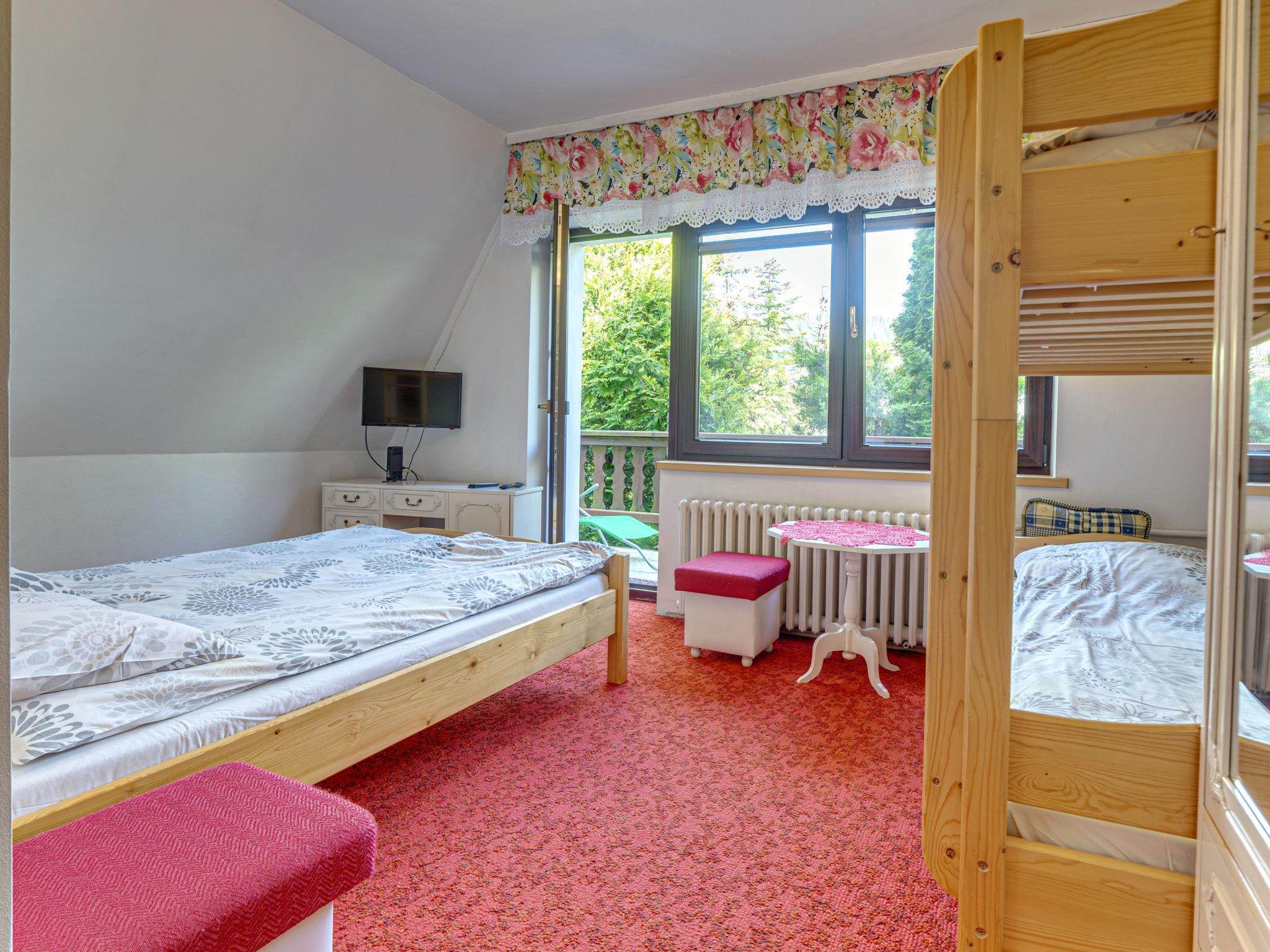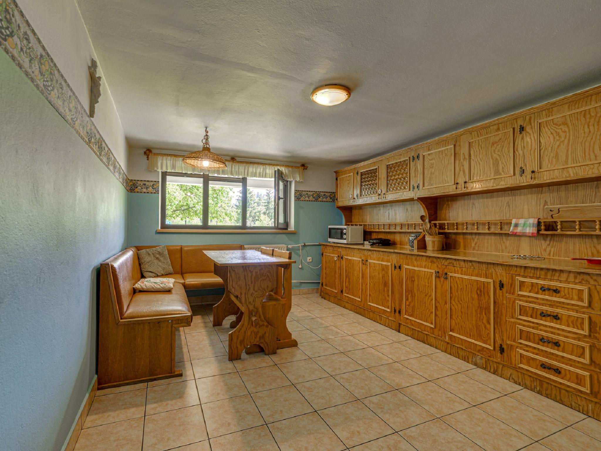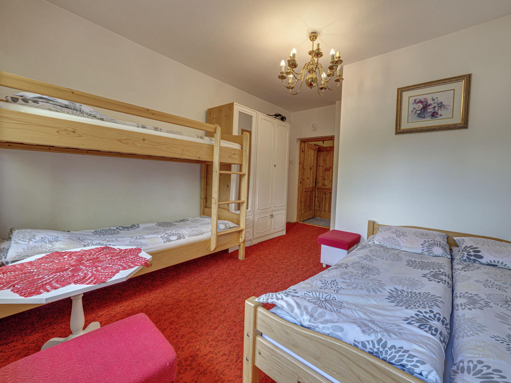 5-room apartment 100 m2 on 2 levels. Open dining room with open-hearth fireplace. Large kitchen (4 hot plates) with dining table, radio. Upper floor: 1 room 9 m2 with 1 french bed (150 cm). Interconnecting room 30 m2 with 2 beds (90 cm), 1 double sofabed, shower/WC and satellite TV. Exit to the garden, to the terrace. 1 room 15 m2 with 1 sofabed (90 cm), 1 french bed (140 cm), bath/WC. 1 room 20 m2 with 1 x 2 bunk beds, 1 french bed (200 cm), shower/WC. Exit to the balcony. Balcony, west facing position, terrace, south facing position. View of the mountains. Facilities: Internet (WiFi, free). Parking at the house. Please note: maximum 1 pet/ dog allowed. Private entrance, smoke alarm.
