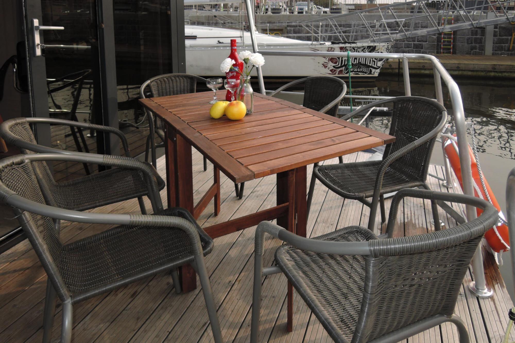 Stueetage: (tekøkken(elkedel, cooker, komfur(Komfur med to kogeplader, gas), køle-fryseskab), Stue/soveværelse(dobbeltsovesofa, spisebord), soveniche(køjeseng), badeværelse(bruser, håndvask, toilet)) varme(gas), terrasse, havemøbler